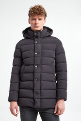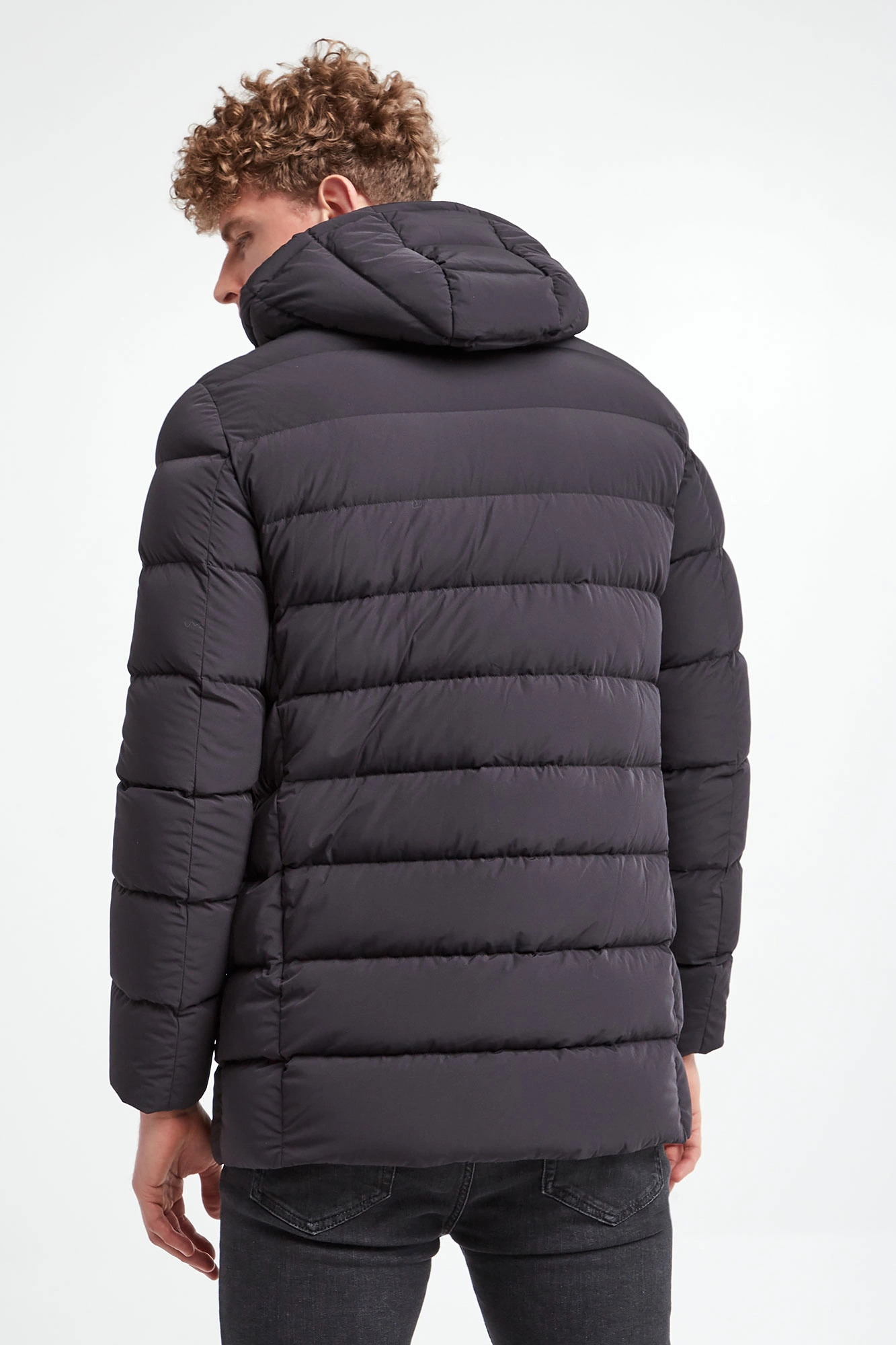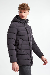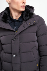 Pikowana kurtka marki Hetrego w kolorze czarnym. Model z odpinanym kapturem wykończonym regulowanym za pomocą elastycznych troczków ze stoperami. Przy kołnierzu dodatkowe futerkowe odpinane ocieplenie. Zapinana za pomocą dwukierunkowego zamka błyskawicznego i dużych, sygnowanych guzików. Dwie zewnętrzne kieszenie. Na jednej z nich niewielka naszywka z nazwa marki w kontrastowym żółtym kolorze. Dłuższy fason typu regular. Naturalne wypełnienie.
