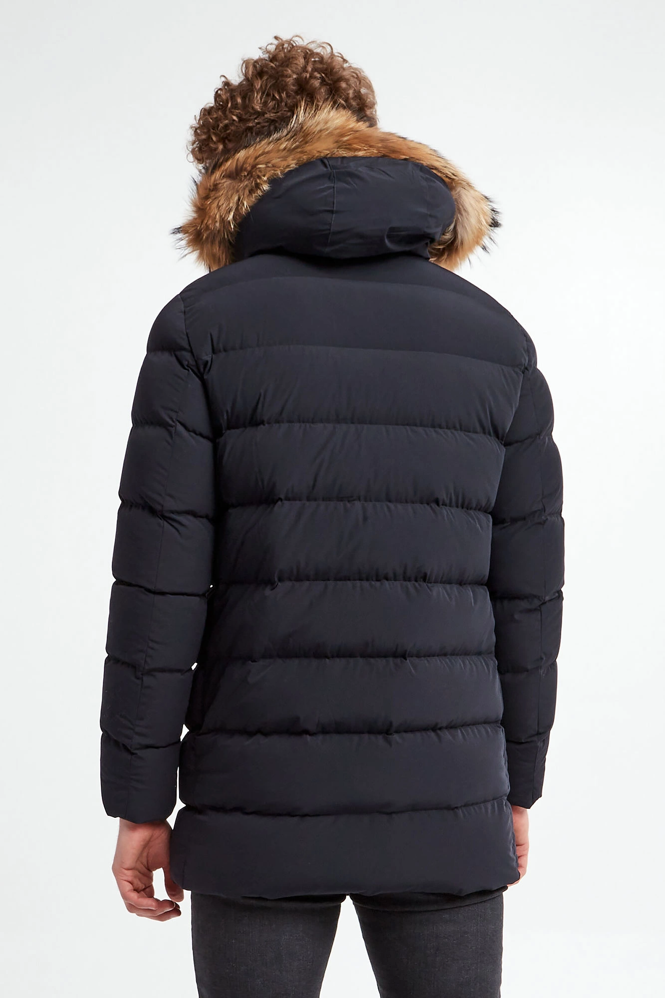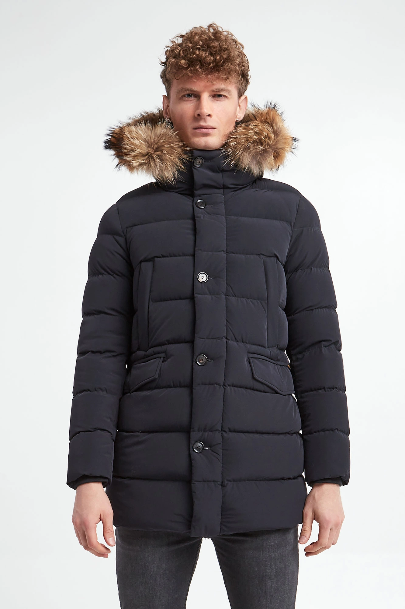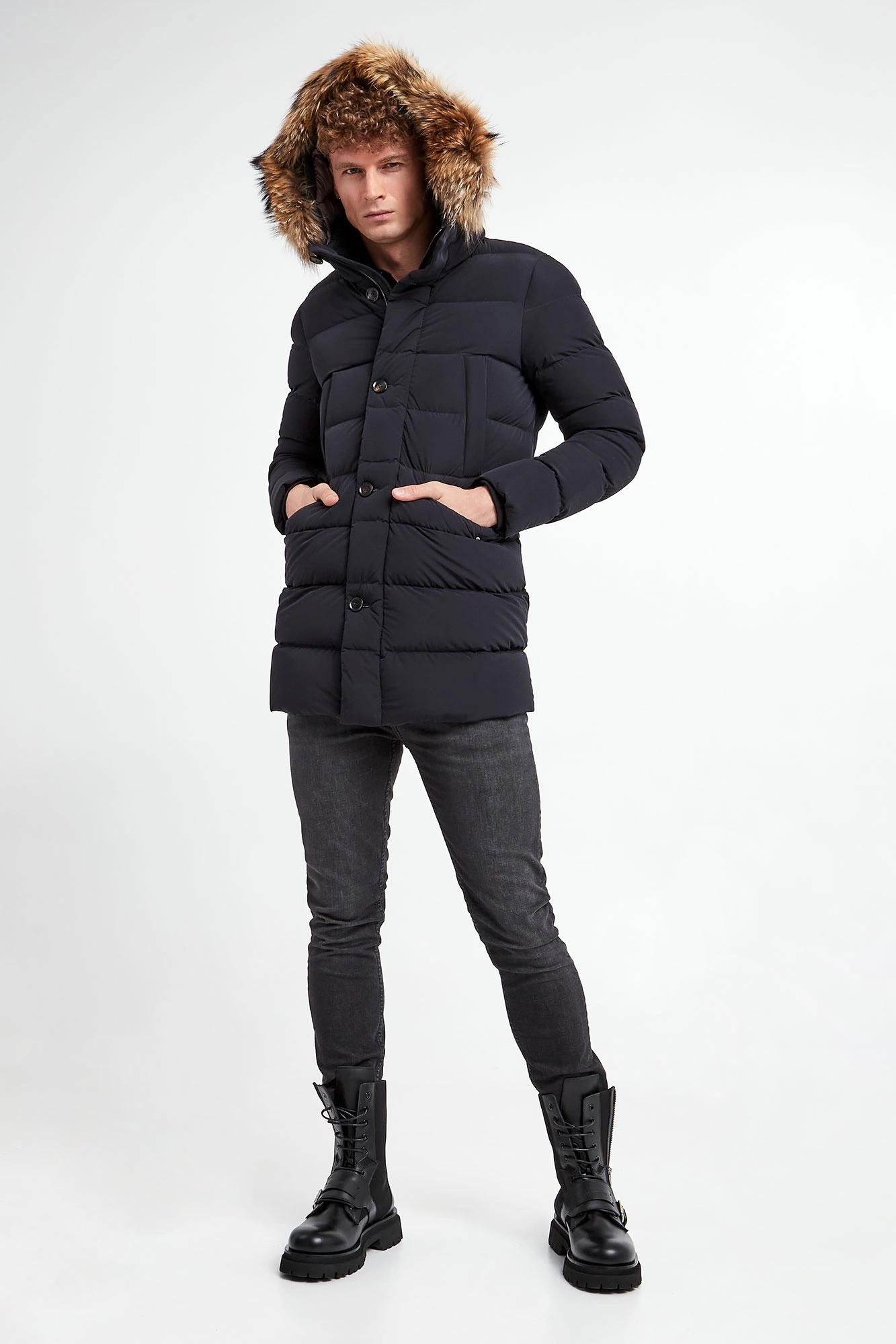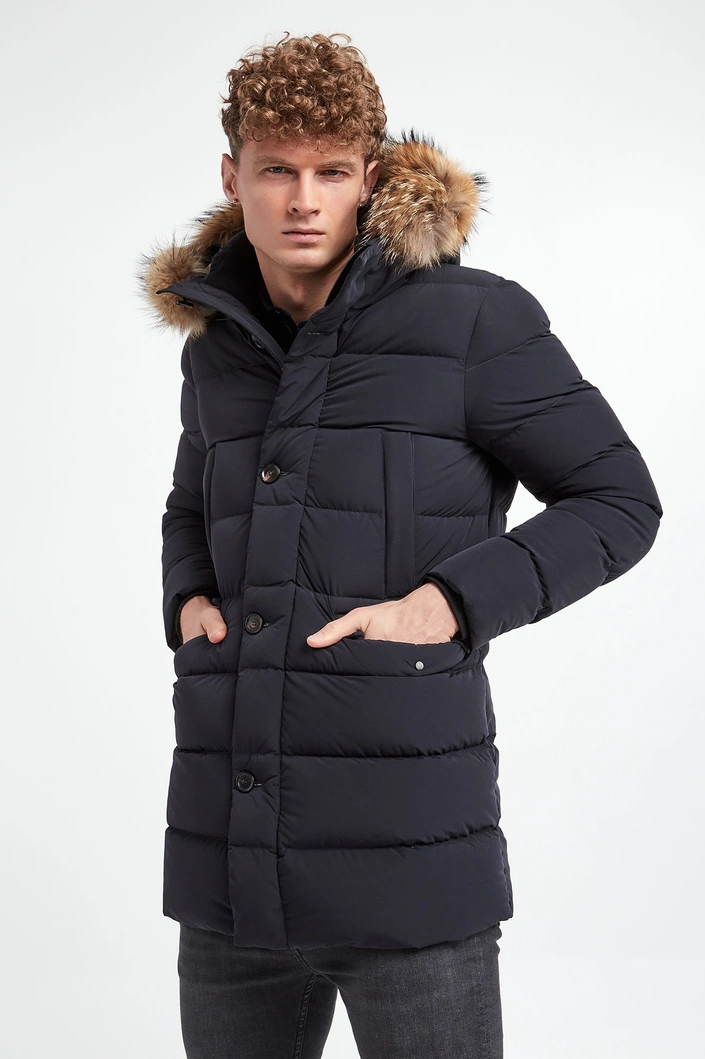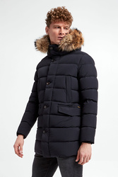Pikowana kurtka marki Hetrego w kolorze granatowym. Naturalne wypełnienie. Z kapturem wykończonym brązowym, naturalnym futerkiem regulowanym za pomocą elastycznych troczków ze stoperami. Dłuższy fason typu regular. Zapinana za pomocą dwukierunkowego zamka błyskawicznego i dużych, sygnowanych guzików. Model z czterema zewnętrznymi, zapinanymi kieszeniami. Na jednej z nich niewielka naszywka z nazwą marki w kontrastowym żółtym kolorze. Wewnątrz cztery dodatkowe kieszenie.