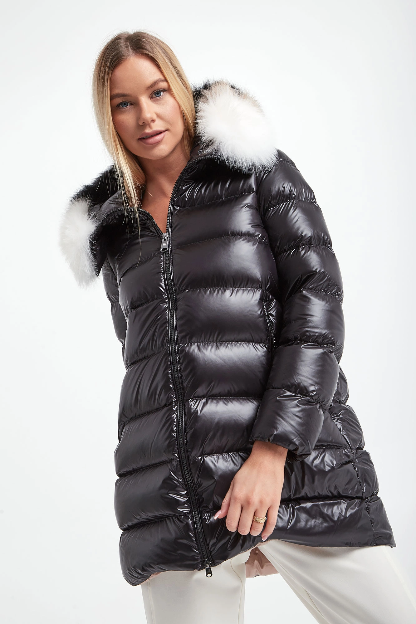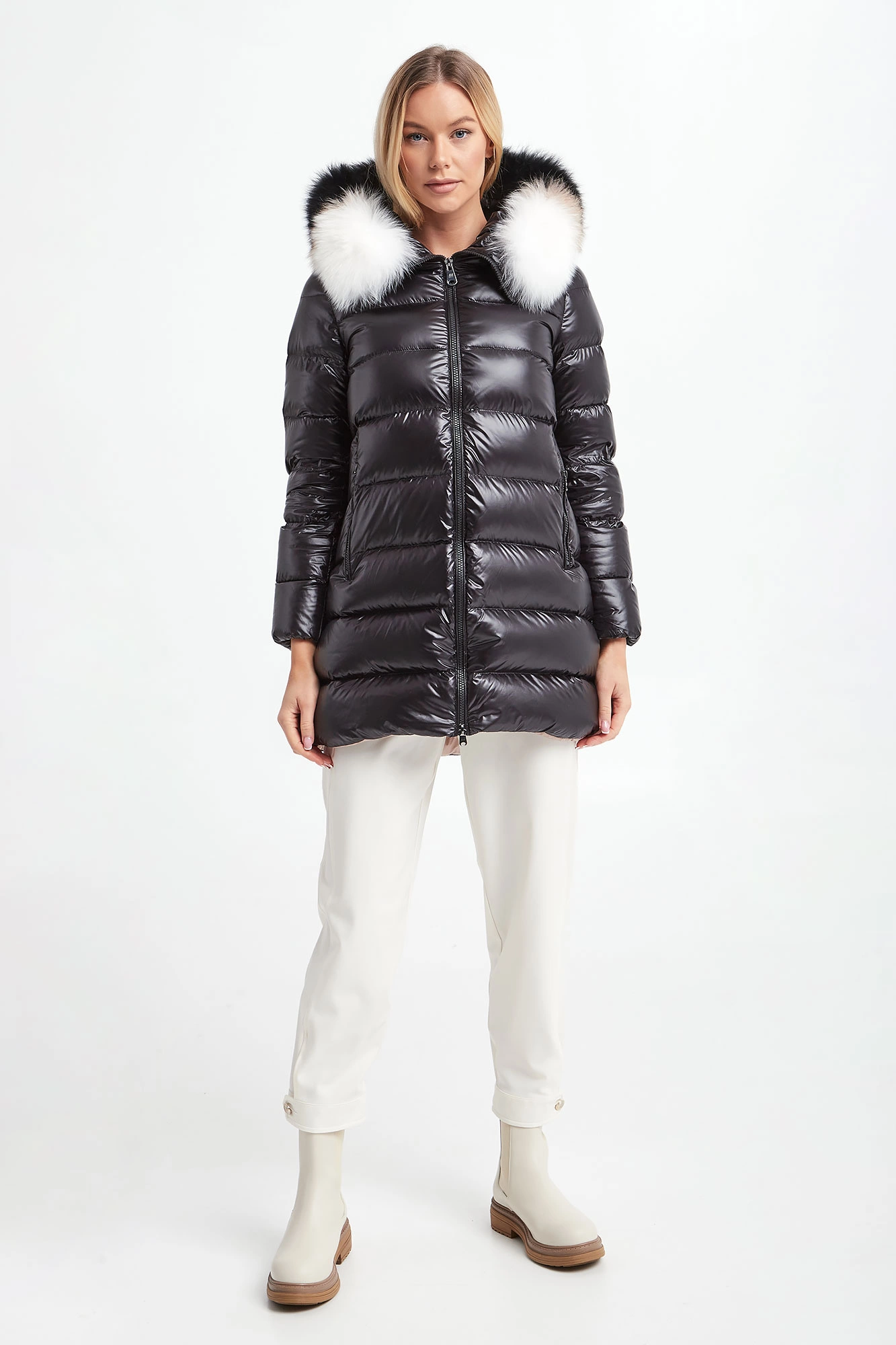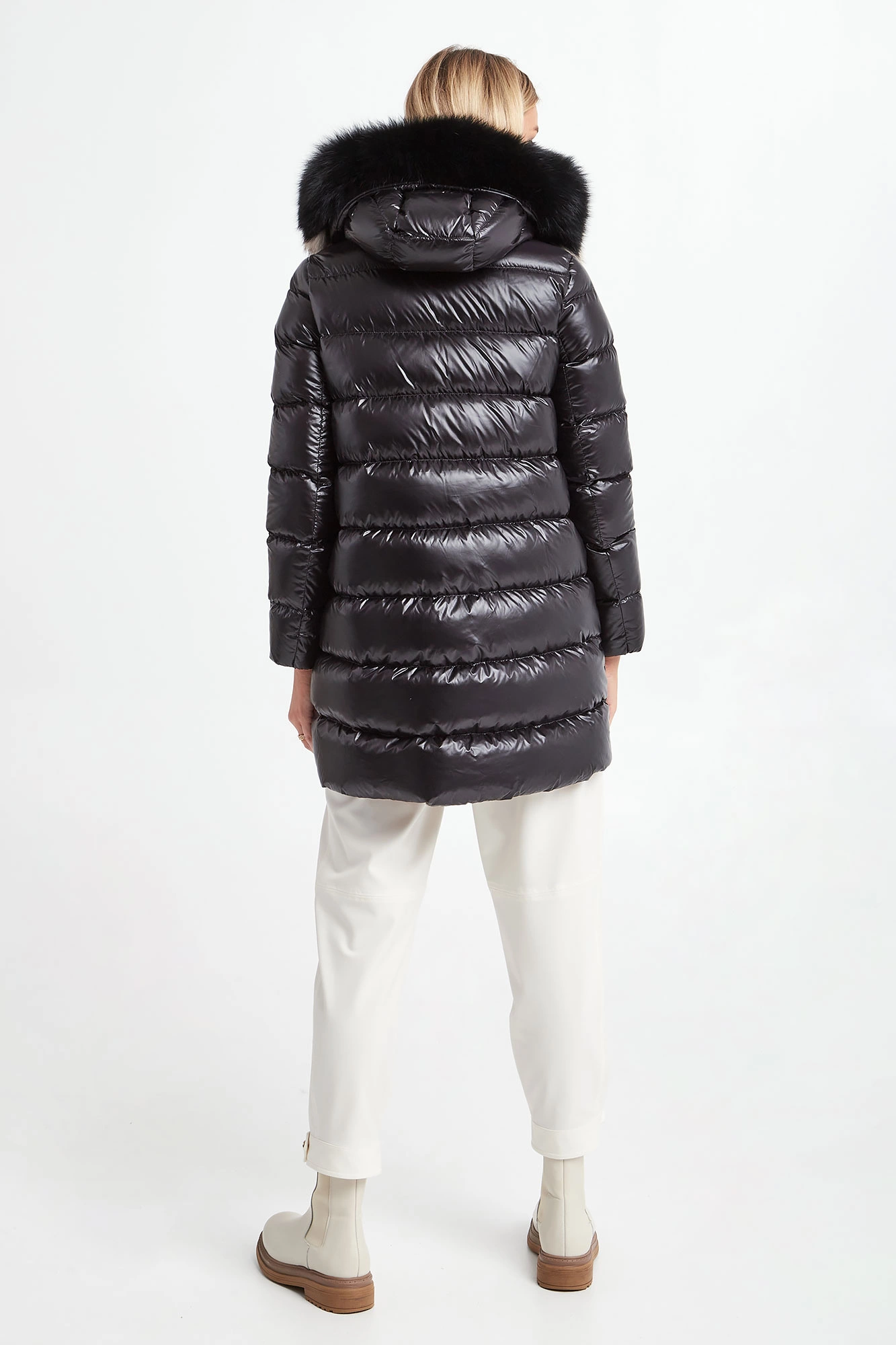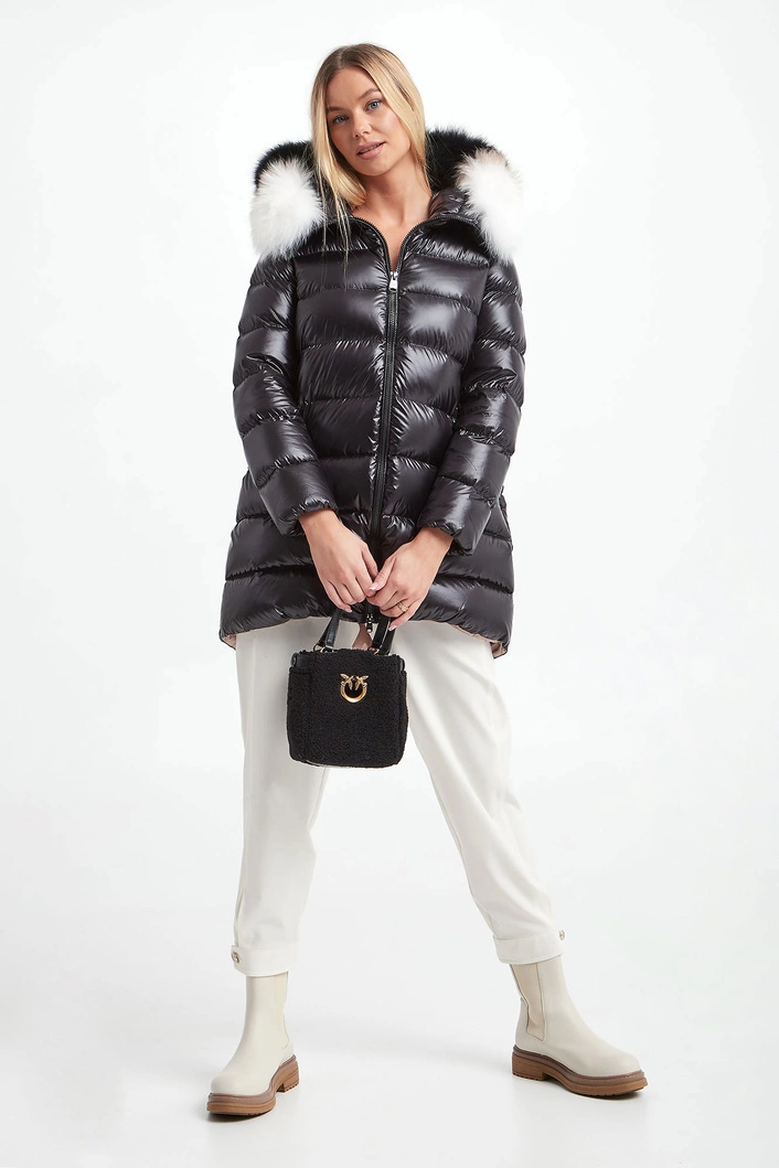 Puchowy płaszcz z kapturem marki Hetrego w czarnym kolorze. Na całości poziome pikowanie. Kaptur wykończony wielokolorowym futrem. Na przodzie dwie kieszenie na suwak. Wnętrze w beżowym kolorze z dodatkową kieszenią. Model zapinany na dwukierunkowy zamek. Fason typu regular.