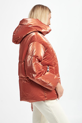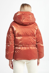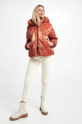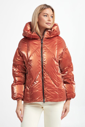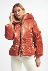Kurtka marki Hetrego w ceglastym, pomarańczowym kolorze. Całość pikowana z delikatnym połyskiem. Na przodzie dwie kieszenie zamykane na suwak. Wewnątrz ukryta kieszeń oraz regulacja w pasie za pomocą troczków. Zapinana za pomocą dwukierunkowego zamka z logowaną zawieszką. Fason typu relaxed.