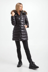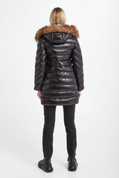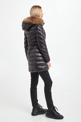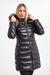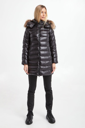 Puchowy płaszcz z kapturem marki Hetrego w czarnym kolorze. Całość pikowana z matowym połyskiem. Kaptur odpinany na zamek, wykończony futrem. Z przodu dwie kieszenie na suwak. Na lewym ramieniu sygnowana gumowa metka. Wewnątrz dodatkowa kieszeń. Model zapinany na dwukierunkowy zamek. Wypełniony puchem pochodzącym z recyklingu, który oferuje te same cechy i zalety, co pierwotny puch, ale przy niższych kosztach środowiskowych. Fason typu slim.