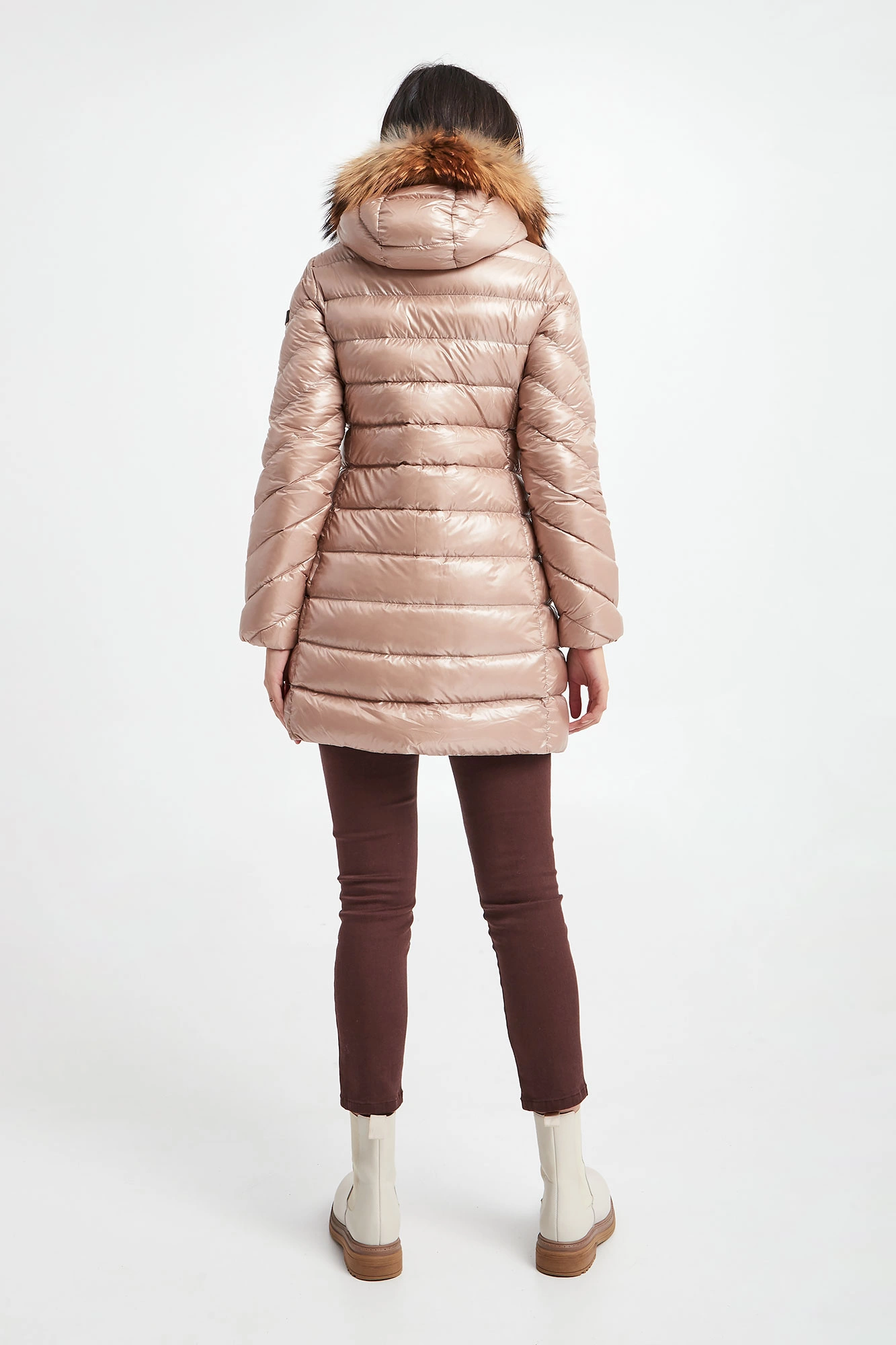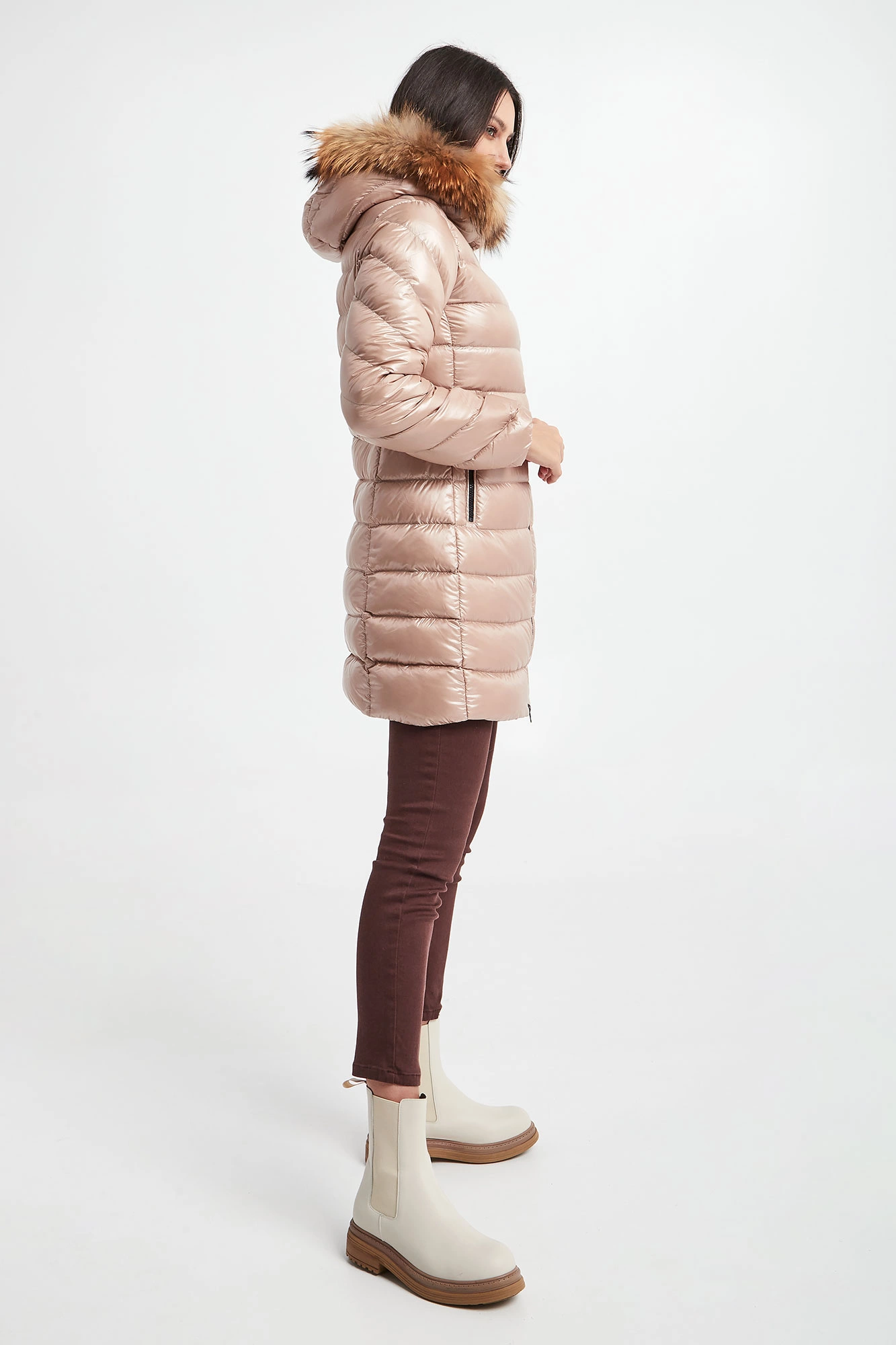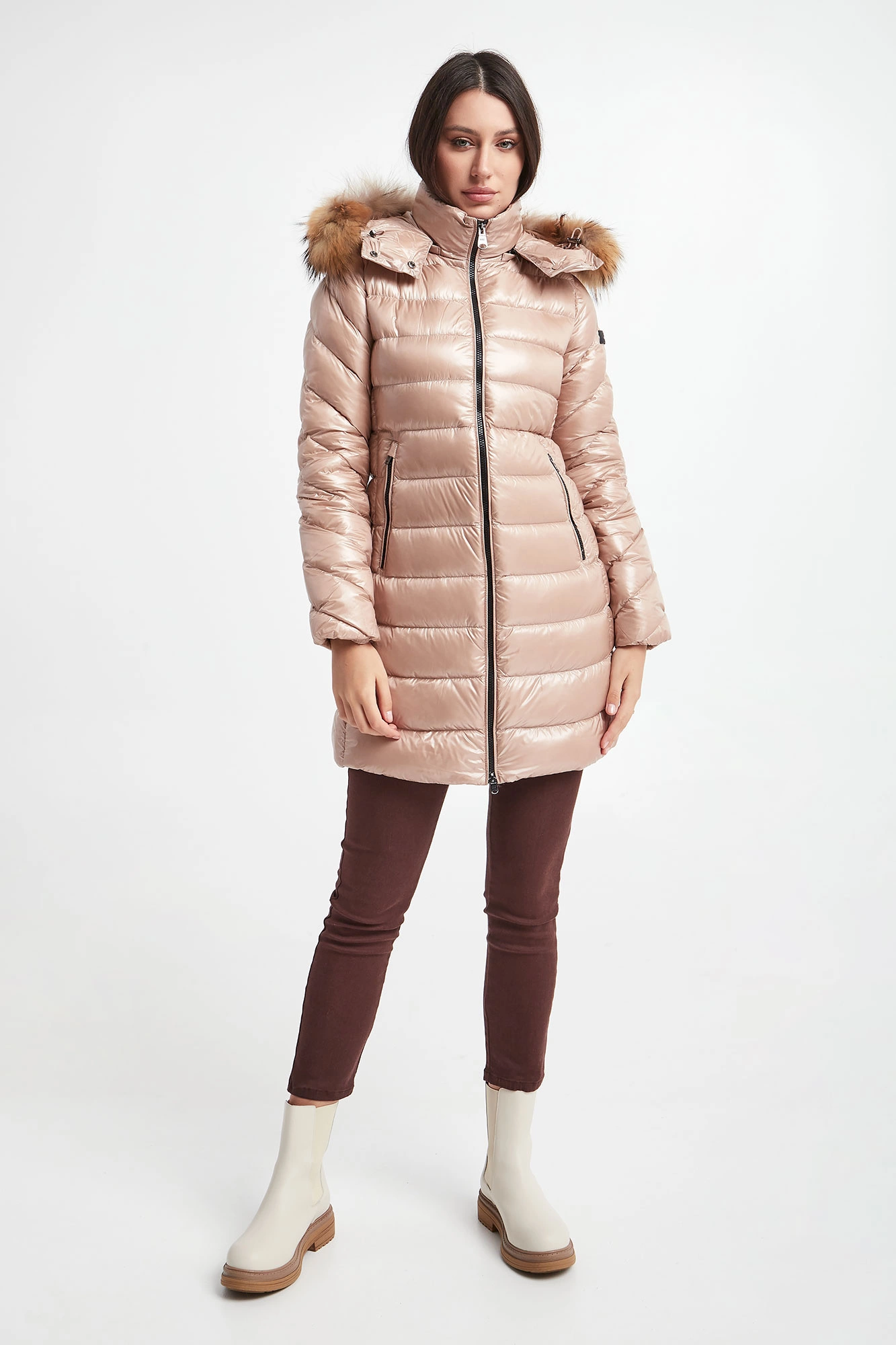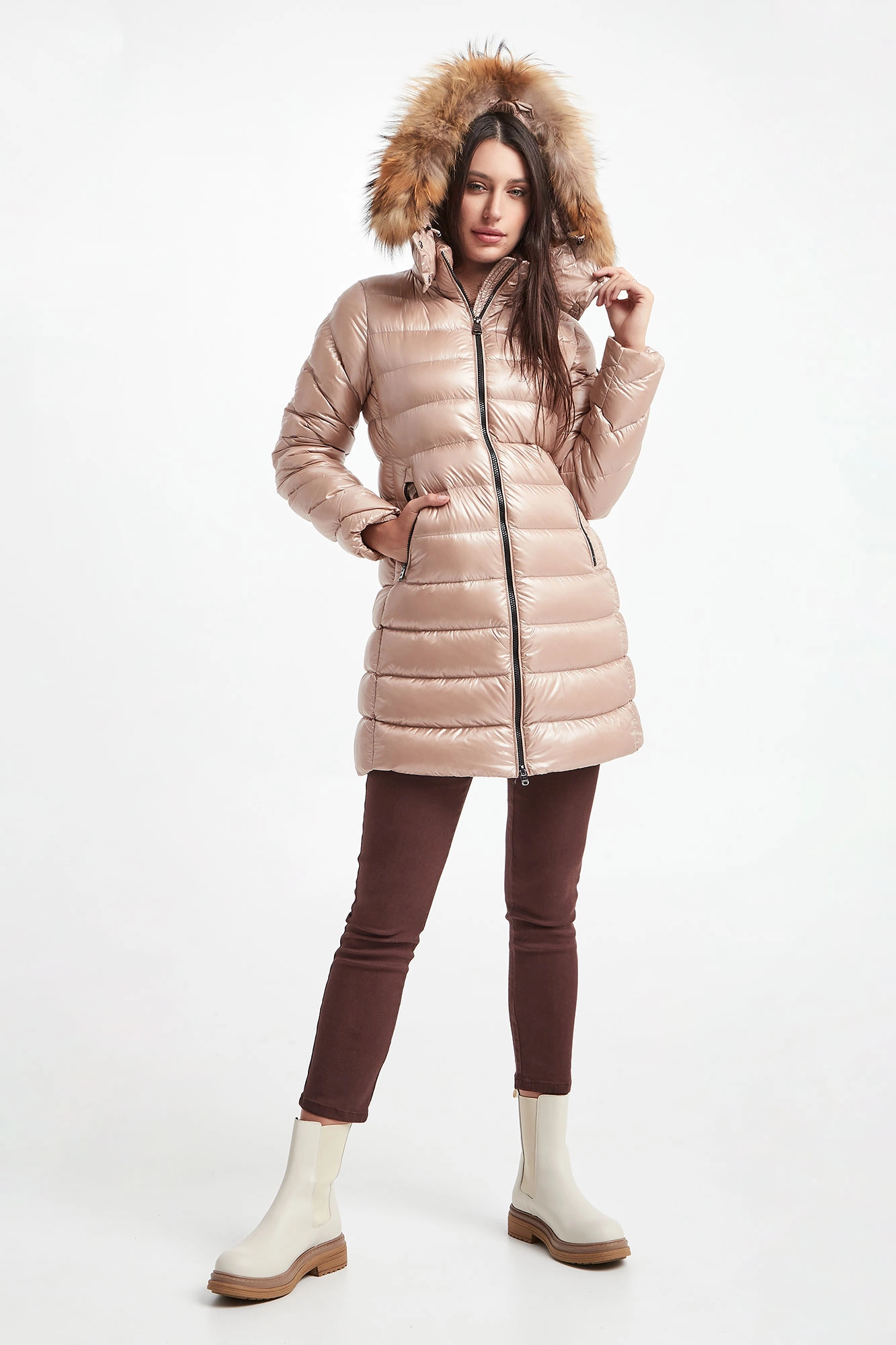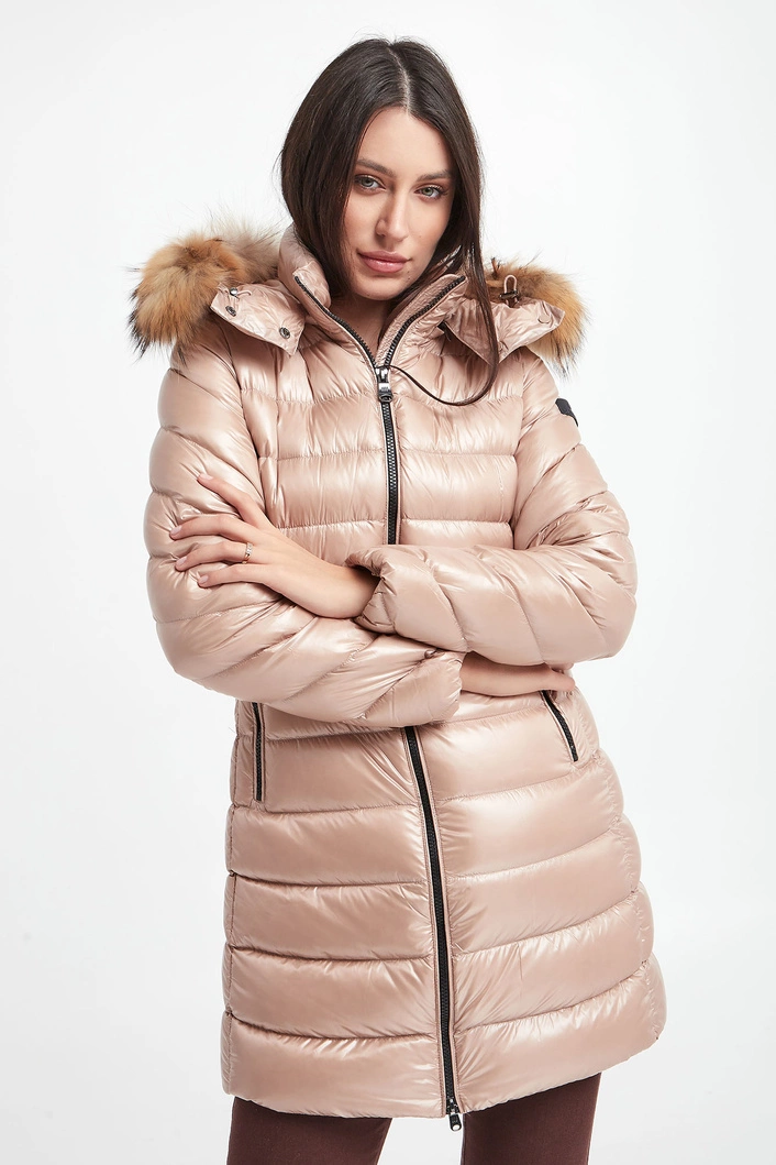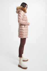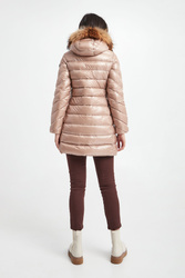 Puchowy płaszcz z kapturem marki Hetrego w beżowym kolorze. Całość pikowana z matowym połyskiem. Kaptur odpinany na zamek, wykończony futrem. Z przodu dwie kieszenie na suwak. Na lewym ramieniu sygnowana gumowa metka. Wewnątrz dodatkowa kieszeń. Model zapinany na dwukierunkowy zamek. Wypełniony puchem pochodzącym z recyklingu, który oferuje te same cechy i zalety, co pierwotny puch, ale przy niższych kosztach środowiskowych. Fason typu slim.