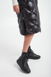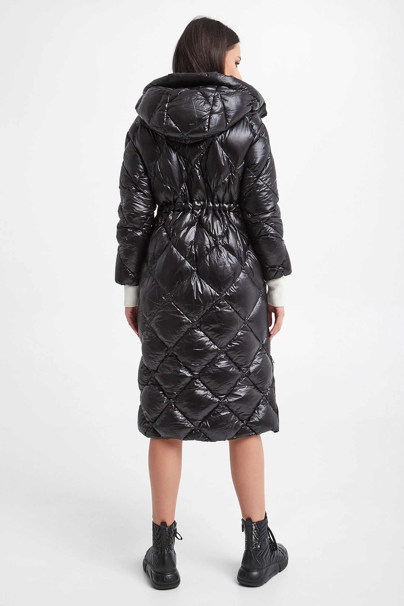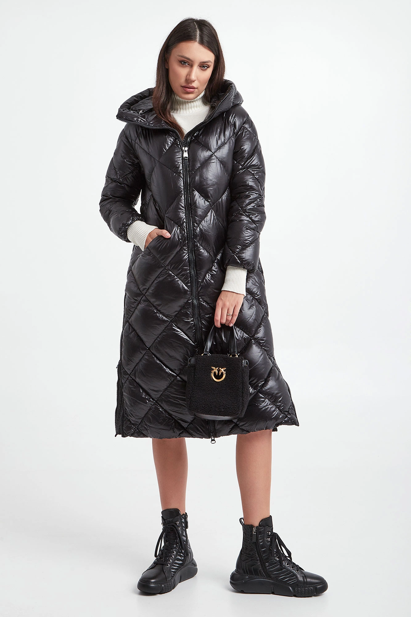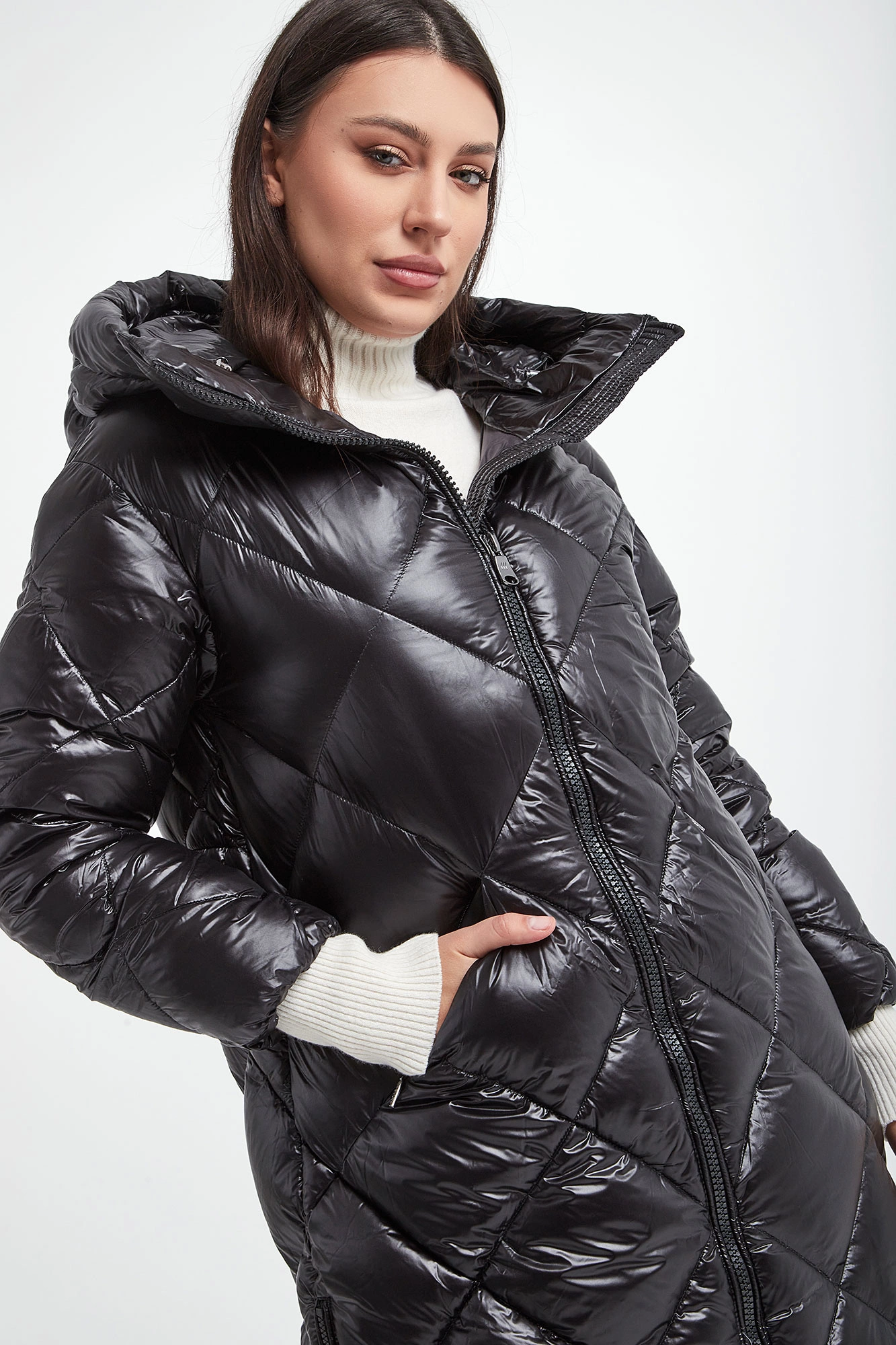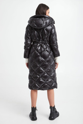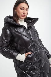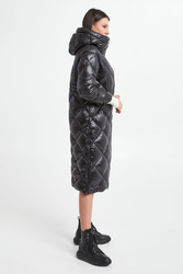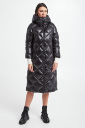 Pikowany, puchowy płaszcz Hetrego w czarnym kolorze. Fason typu slim. Model ze stójką i kapturem. Zapinana na dwukierunkowy zamek błyskawiczny. Posiada dwie zapinane kieszenie. W pasie regulowana na troczki. Podszewka z dodatkową kieszenią. Naturalne wypełnienie.