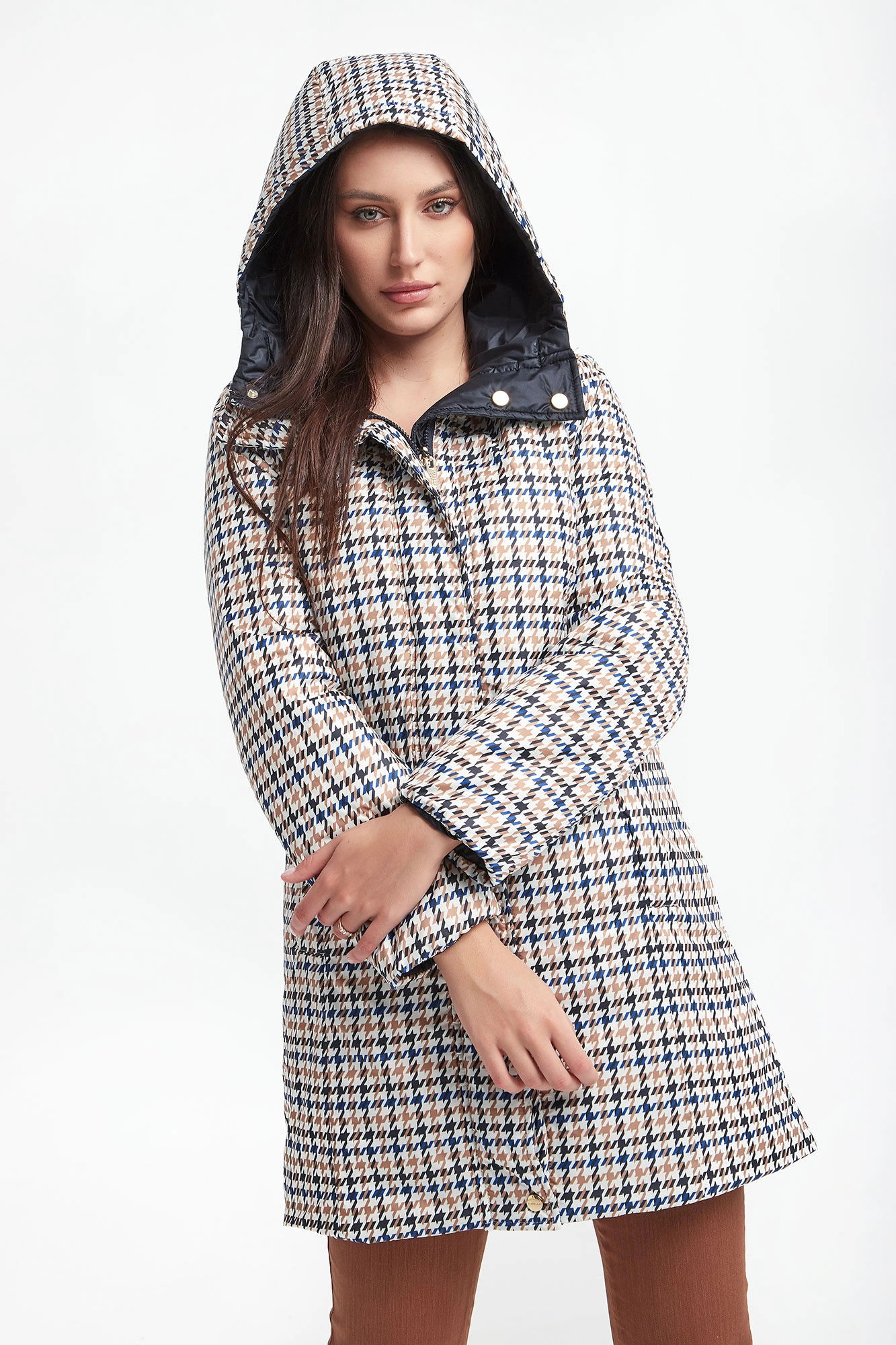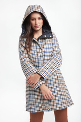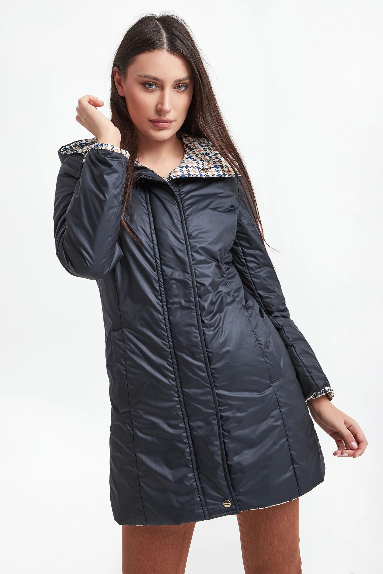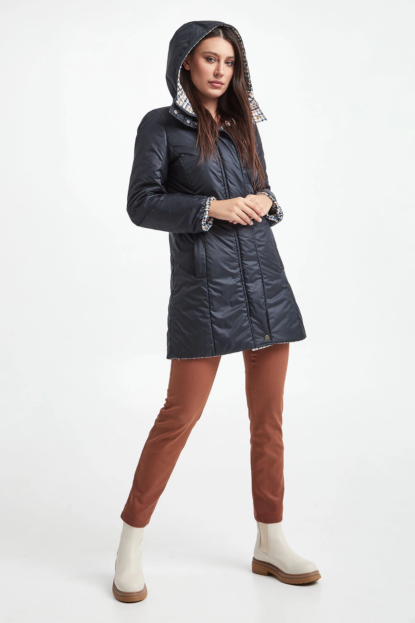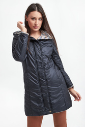 Dwustronny puchowy płaszcz z kapturem marki Marella Sport. Na jednej stronie wielokolorowy nadruk. Druga strona w granatowym kolorze. Zapinany na kryty zamek oraz napy. Kieszenie z obu stron. Fason typu slim. Wykonany z materiałów z recyklingu.