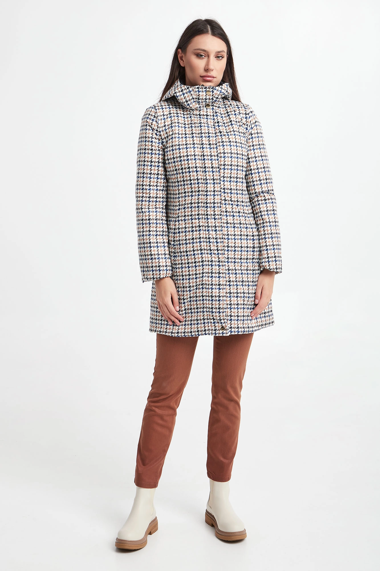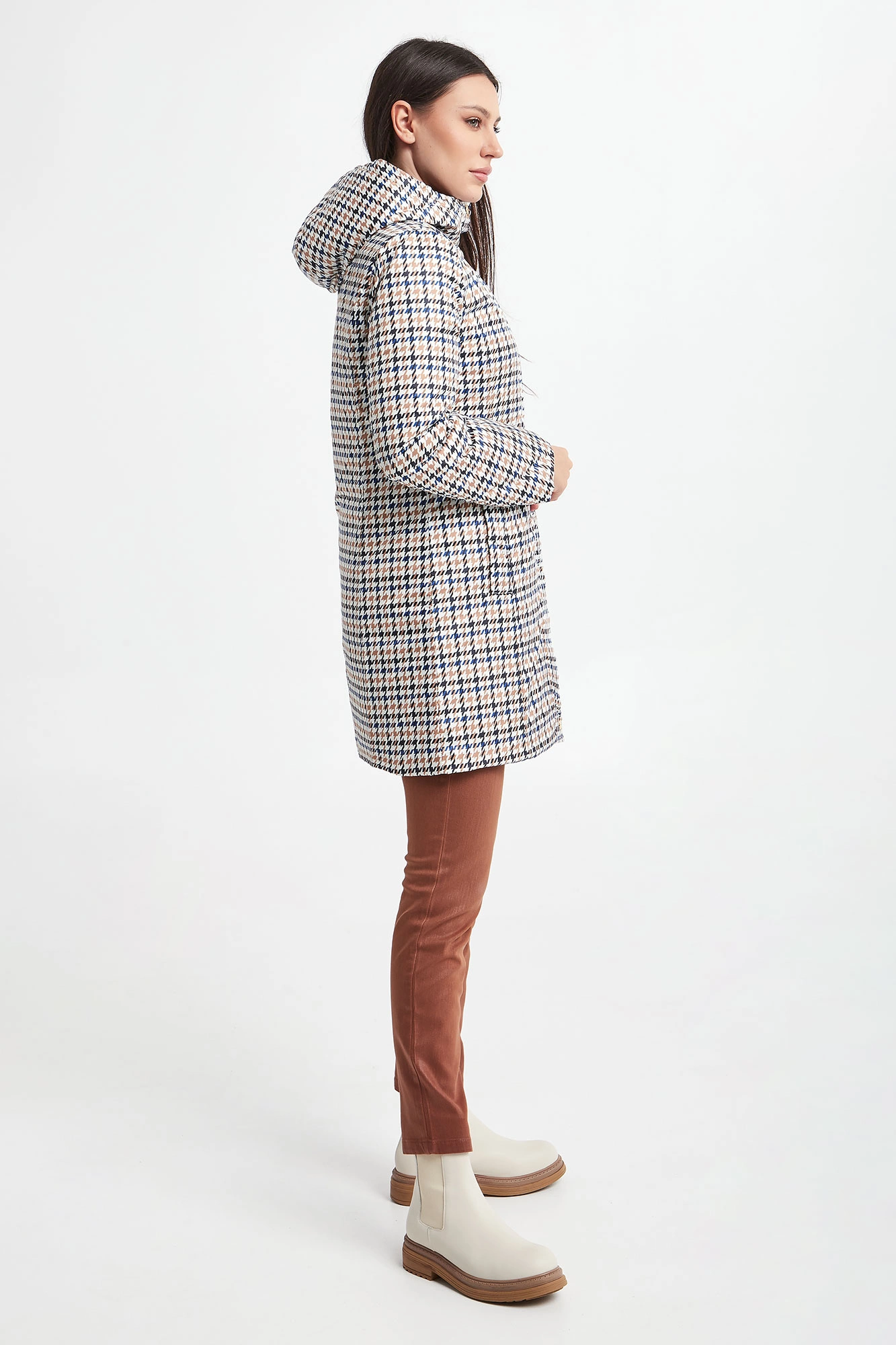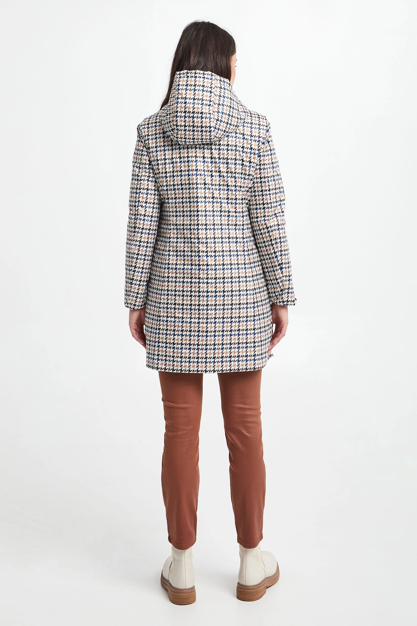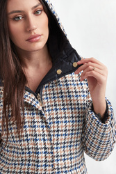 Dwustronny puchowy płaszcz z kapturem marki Marella Sport. Na jednej stronie wielokolorowy nadruk. Druga strona w granatowym kolorze. Zapinany na kryty zamek oraz napy. Kieszenie z obu stron. Fason typu slim. Wykonany z materiałów z recyklingu.