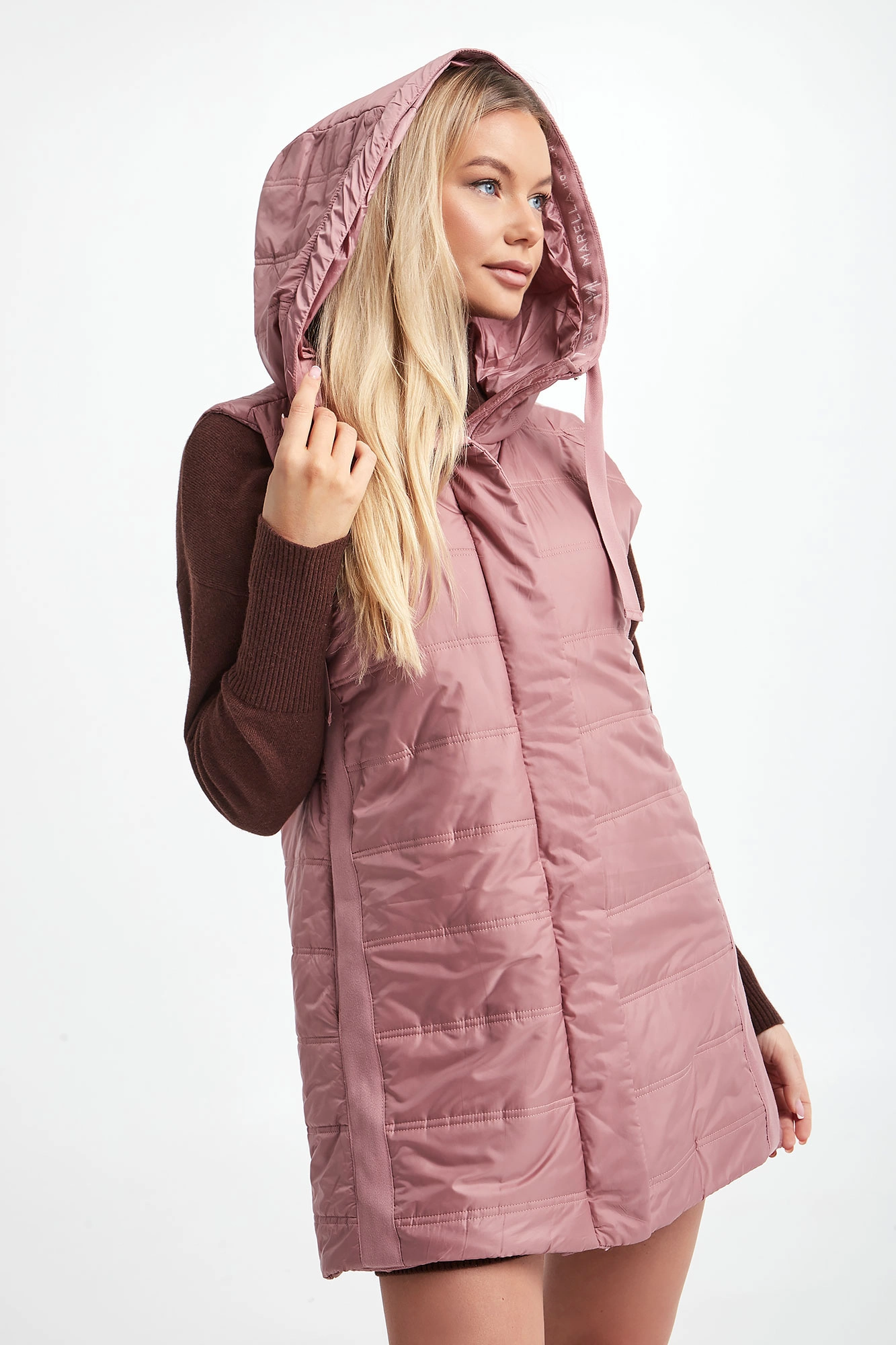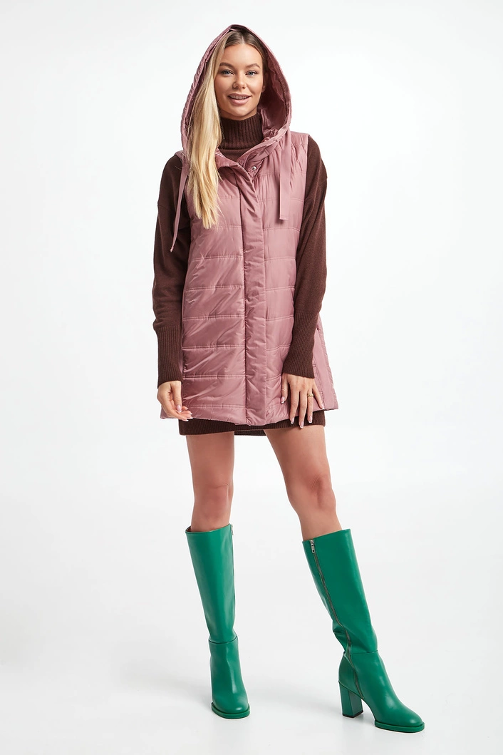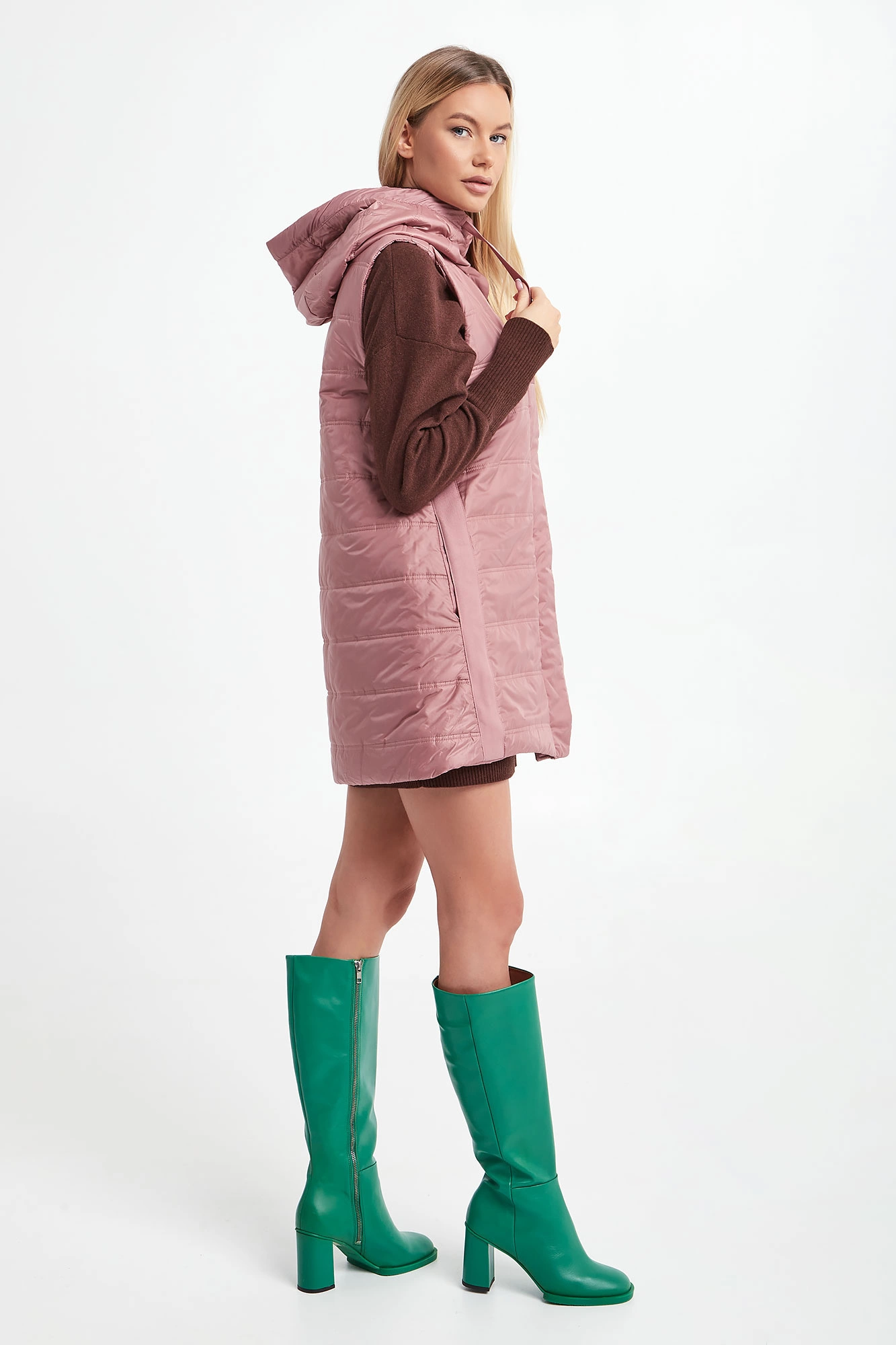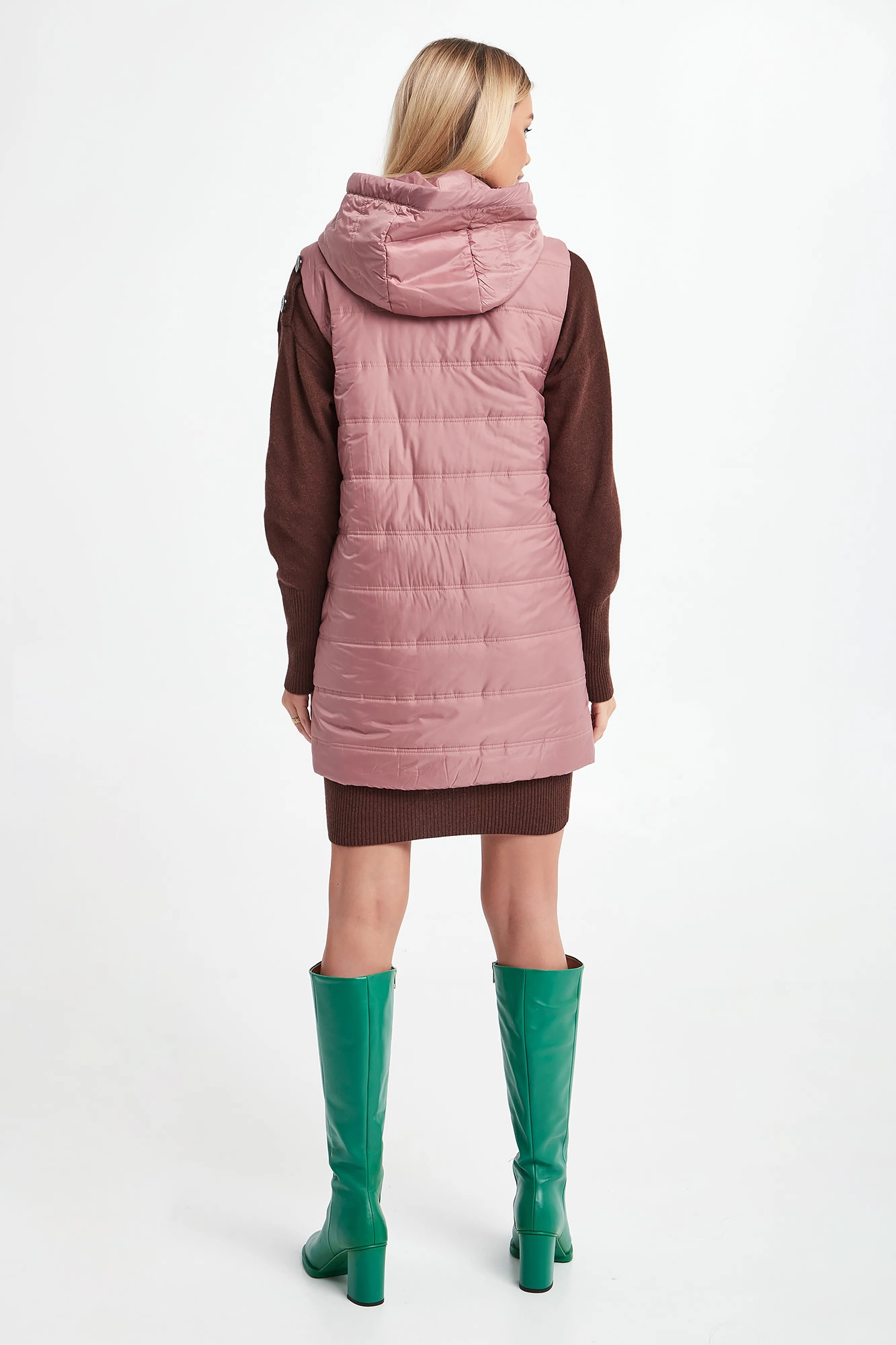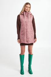 Pikowana kamizelka z kapturem marki Marella w różowym kolorze. Kaptur regulowany za pomocą wiązanych troczków. Model z dwiema wpuszczanymi kieszeniami. Po bokach materiałowe lampasy. Zapinana za pomocą dwukierunkowego zamka oraz zatrzasków. Materiał pochodzący z recyklingu. Produkt stworzony zgodnie z zasadami zrównoważonej mody.