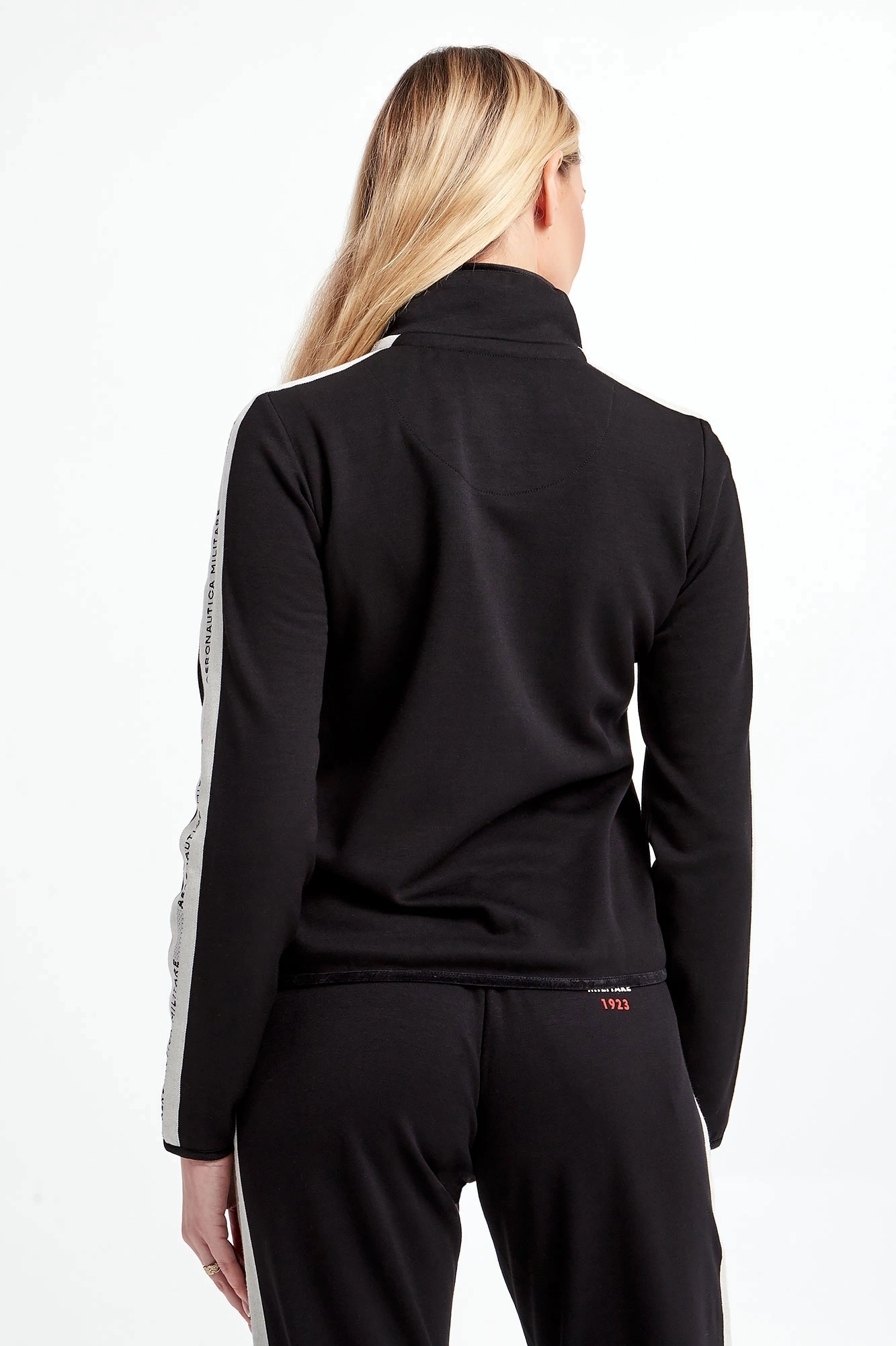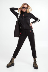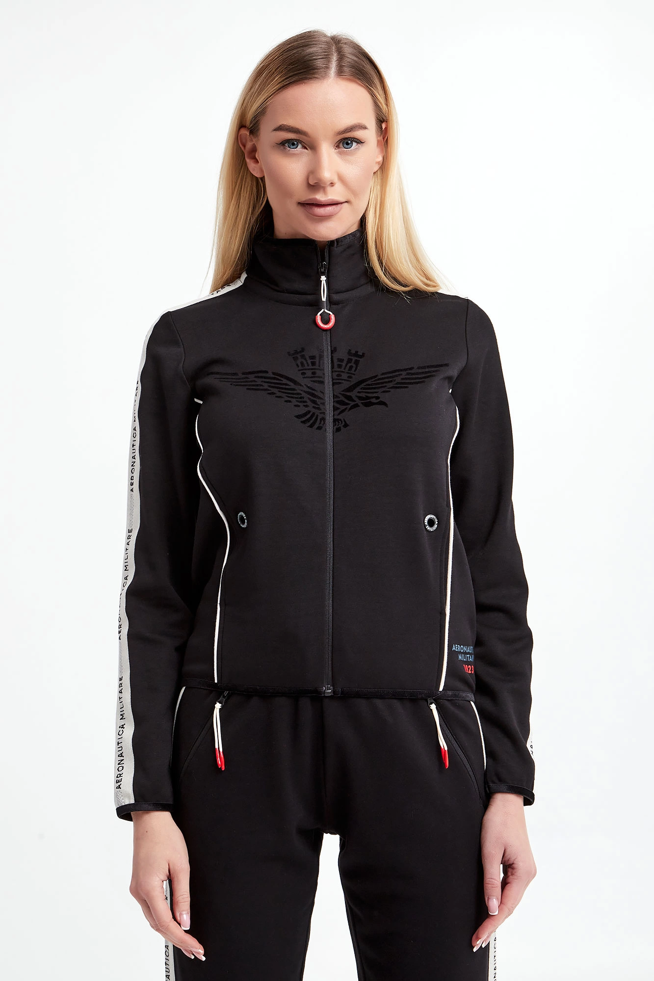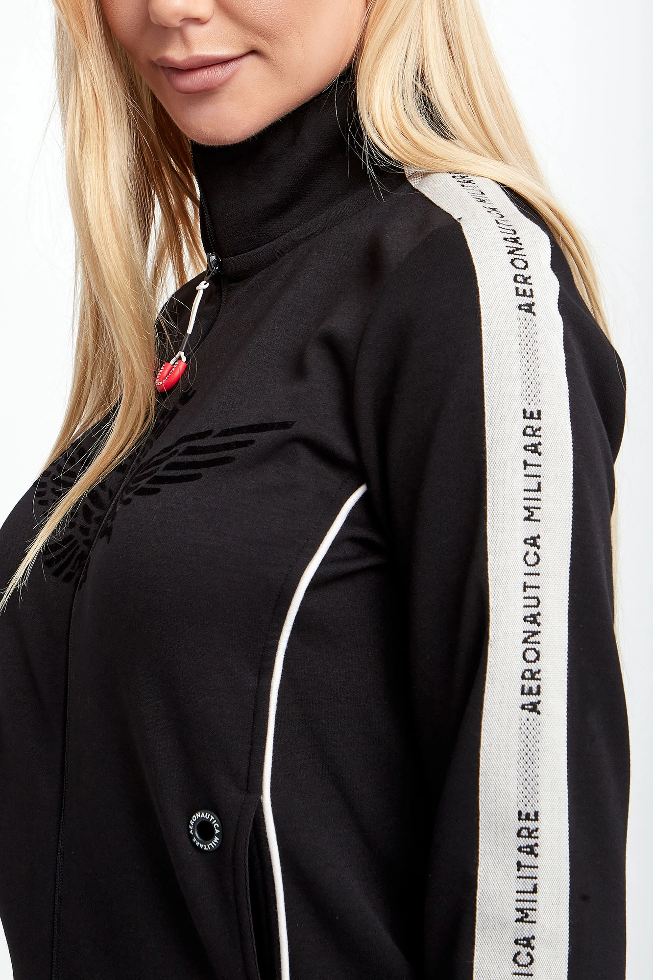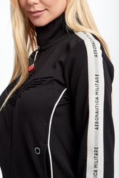 Bluza dresowa marki Aeronautica Militare w czarnym kolorze. Model ze stójką, od wewnątrz obszytą beżowym materiałem. Na całości liczne lampasy i przeszycia. Zapinana za pomocą zamka z sygnowaną zawieszką. Na piersi czarna, welurowa aplikacja z logo marki. Dwie boczne, wpuszczane kieszenie. Na całości rękawów naszywany kontrastowy lampas z nazwą marki. Rękawy oraz dół wykończone obszyciem welurowym. Wykonana z miękkiej, elastycznej, dresowej tkaniny. Fason typu slim.