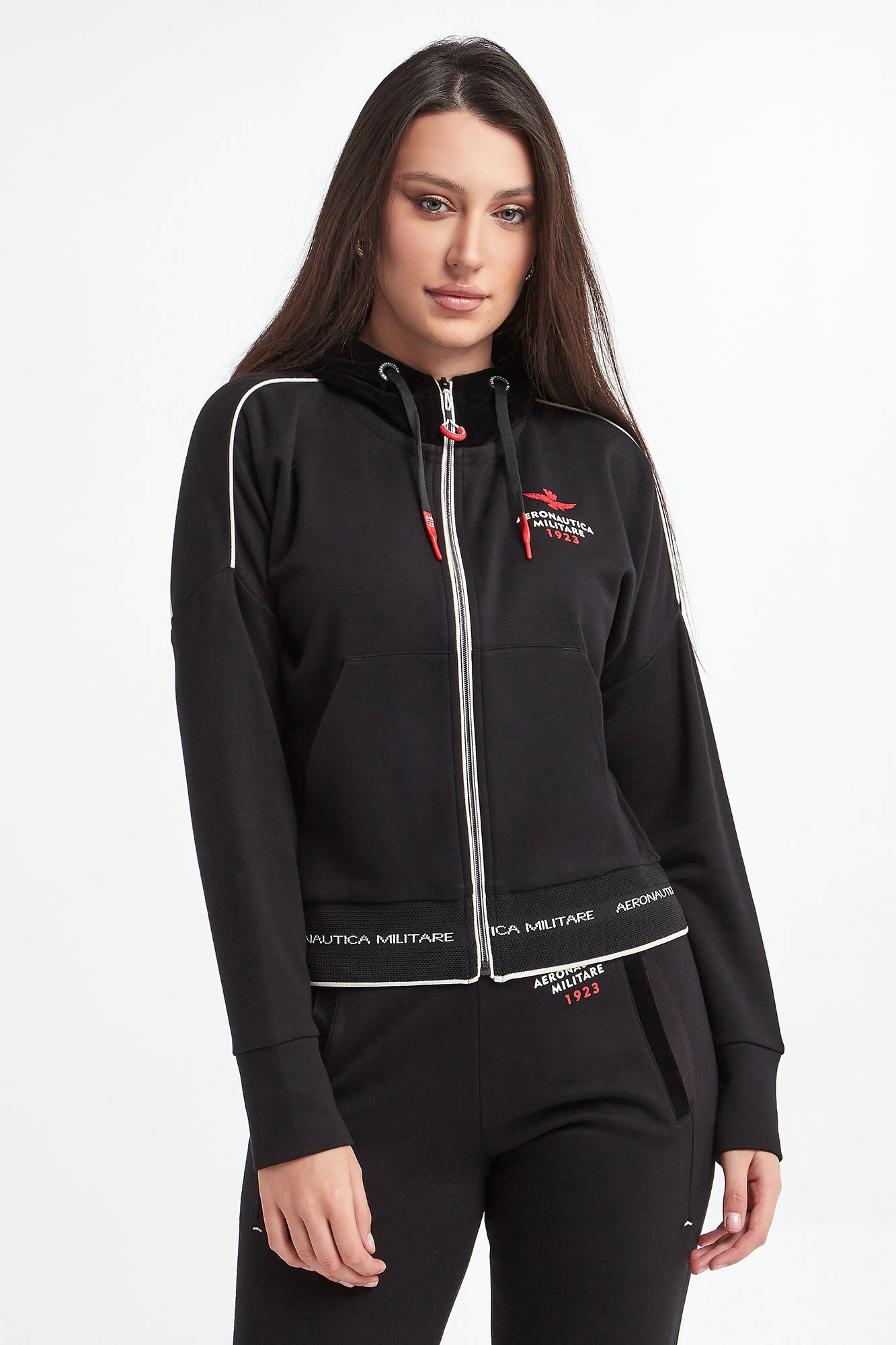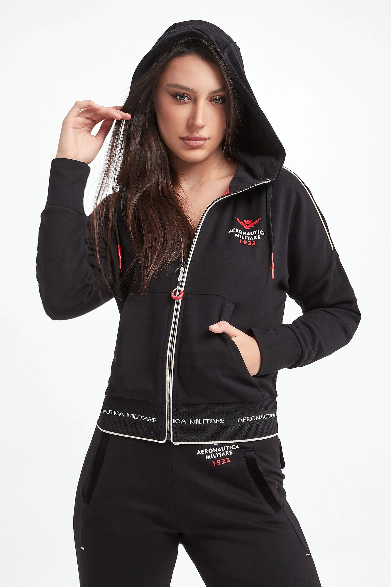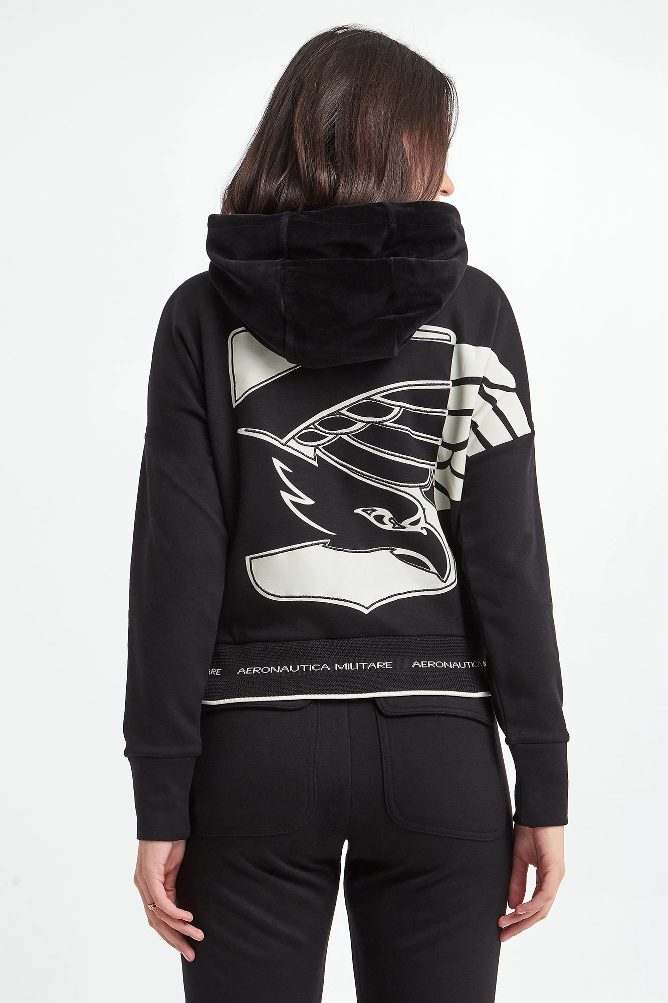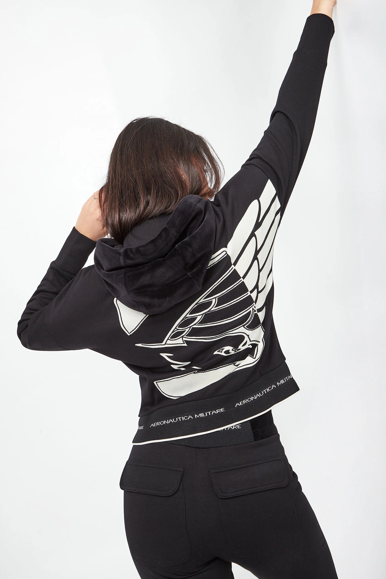 Wiskozowa bluza z kapturem marki Aeronautica Militare w czarnym kolorze. Wykonana z wiskozowej, elastycznej tkaniny. Welurowy kaptur regulowany za pomocą troczków wykończonych na czerwono. Na przodzie dwie otwarte kieszenie. Z tyłu duży biały nadruk z haftami tworzący sylwetkę orła charakterystycznego dla marki. Dół wykończony elastycznym, logowanym ściągaczem. Zapinana na kontrastowy, biały zamek. Fason typu regular.