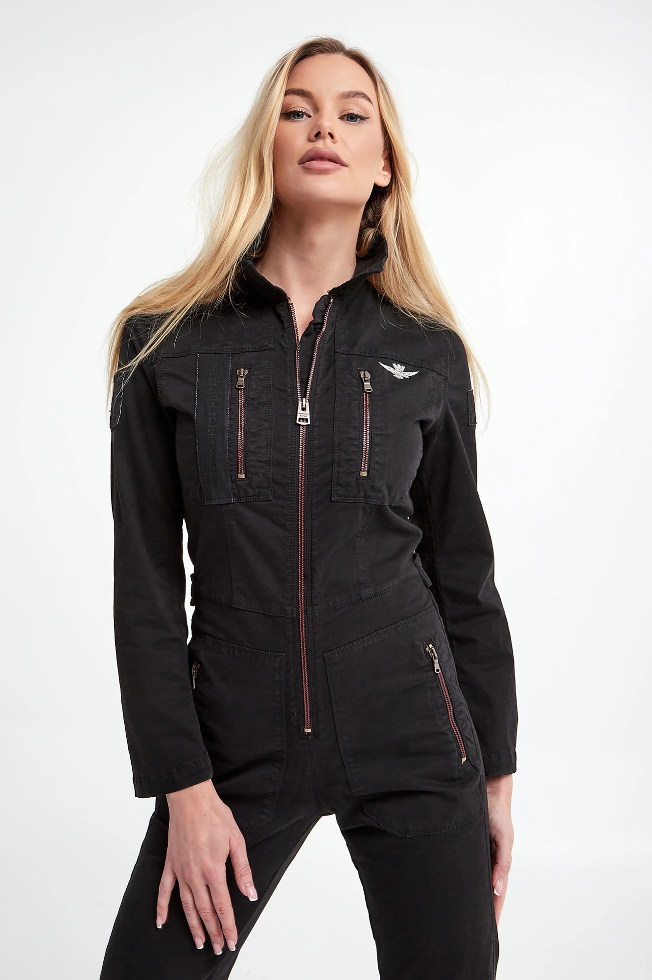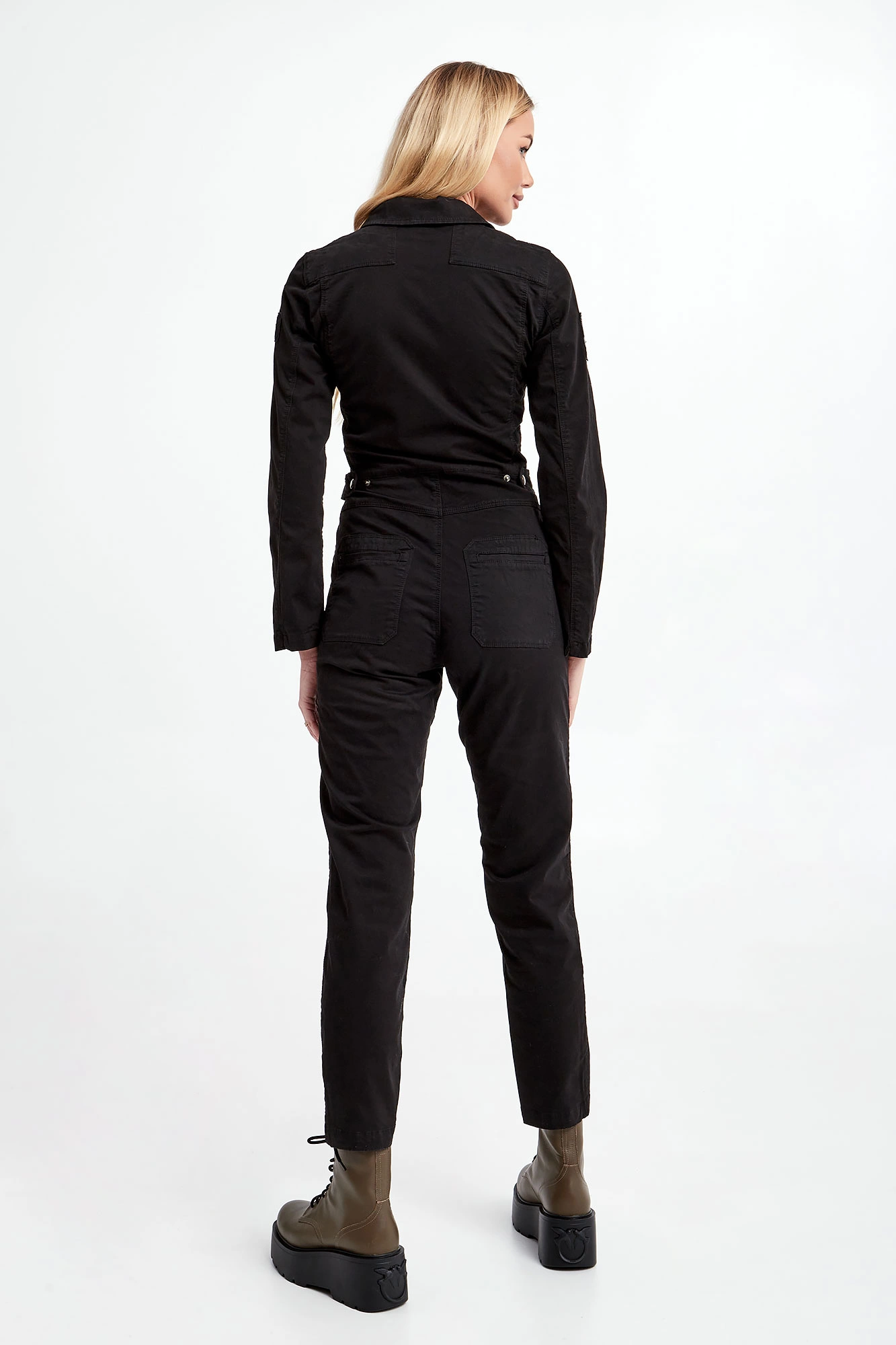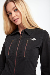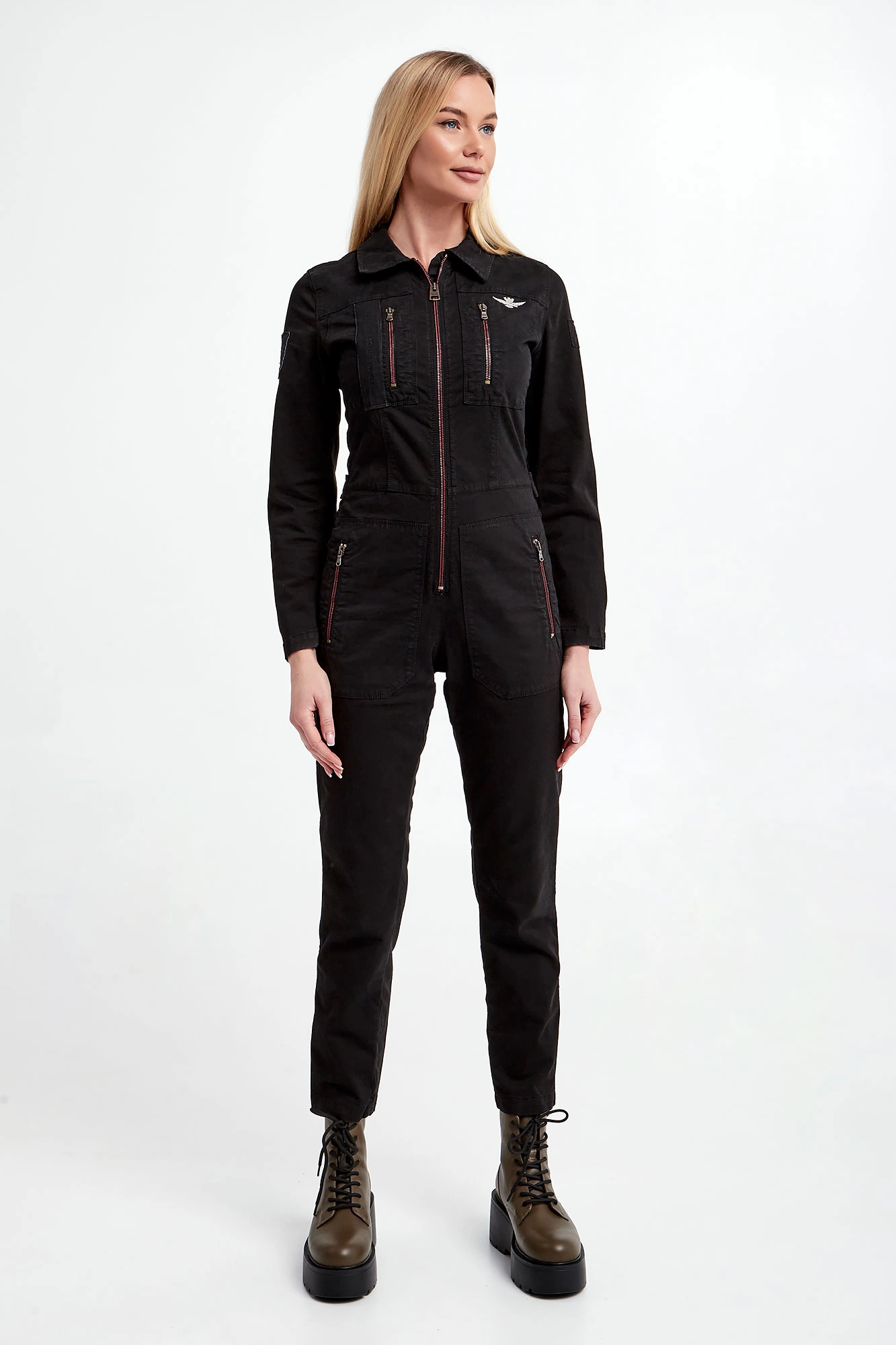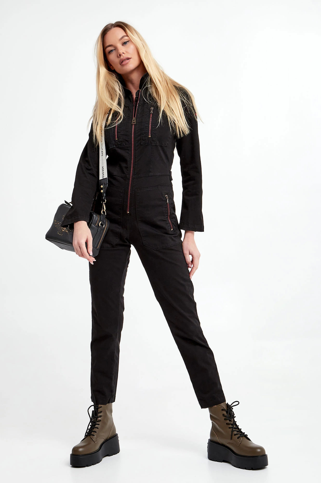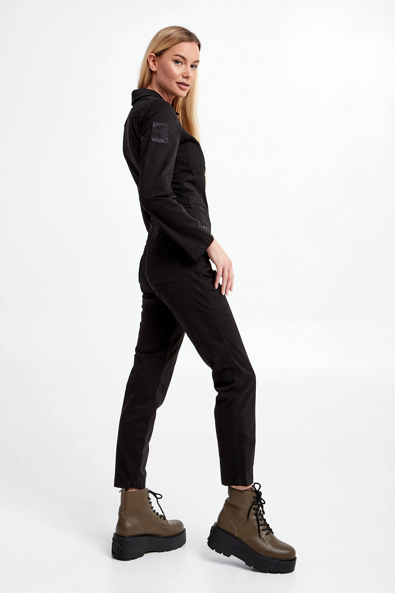 Kombinezon marki Aeronautica Militare w czarnym kolorze. W militarnym stylu. Kombinezon wykonany z przyjemnej w dotyku, miękkiej bawełny z elastycznymi włóknami. Zapinany z przodu na sygnowany zamek. Dekolt wykończony kołnierzykiem. Model z dwoma wpuszczanymi kieszeniami i czteroma zapinanymi za pomocą zamka. Na piersi haft w postaci logo marki. Na rękawach naszywki aplikacje o charakterze militarnym. Nogawki delikatnie zwężające się ku dołowi. Talia regulowana za pomocą pasków zapinanych na napy. Fason typu regular.