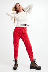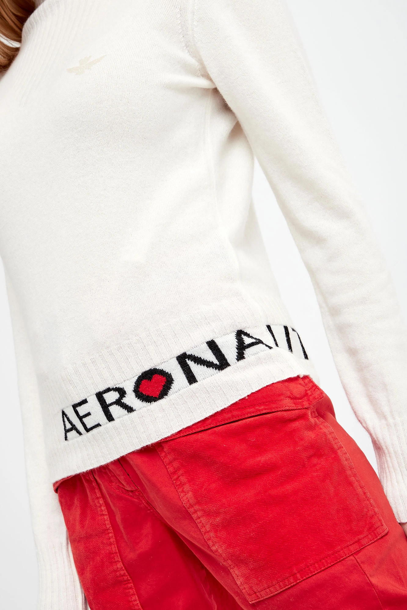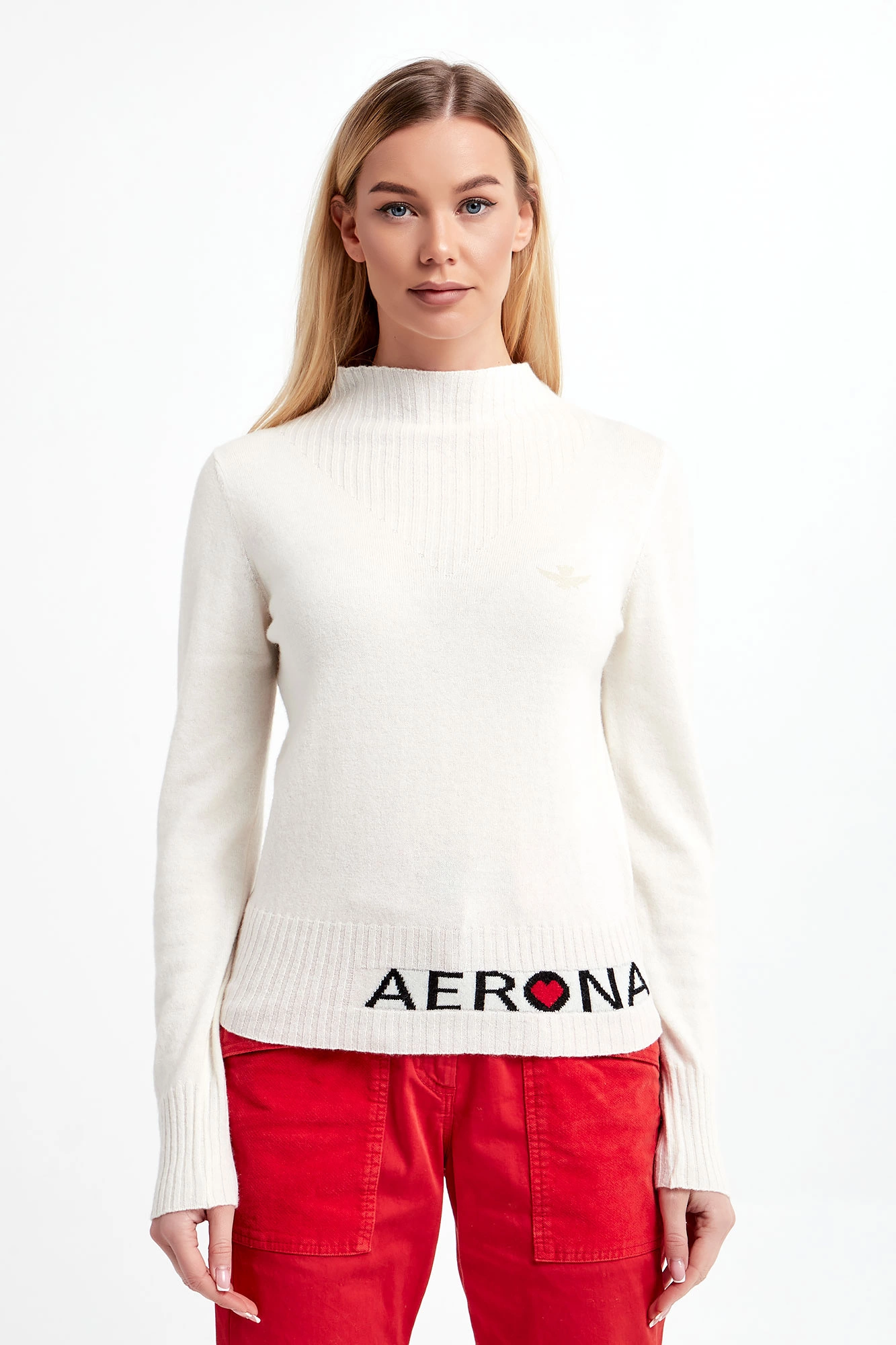 Dzianinowy sweter marki Aeronautica Militare w kolorze ecru. Z przodu nadruk logo marki w białym kolorze. Dekolt typu high neck. Długie rękawy i dół wykończone ściągaczem. Na dole wyszyta nazwa marki przechodząca na tył. Wykonany z miękkiej mieszanki materiałów z dodatkiem wełny i kaszmiru. Fason typu regular.