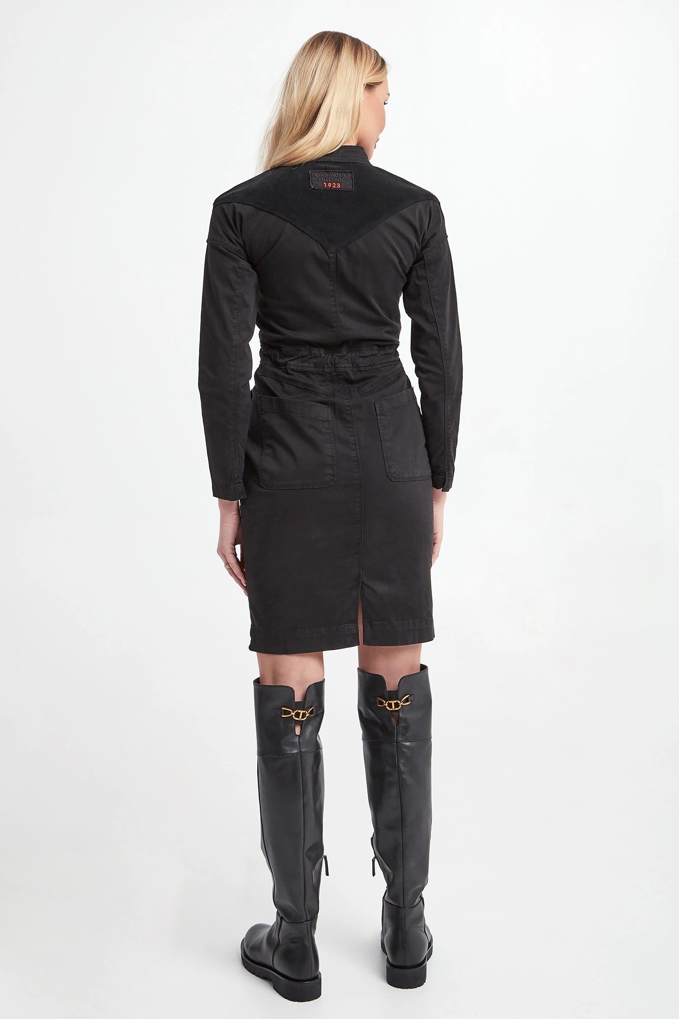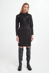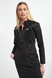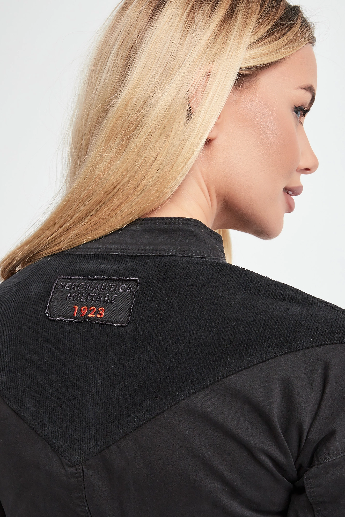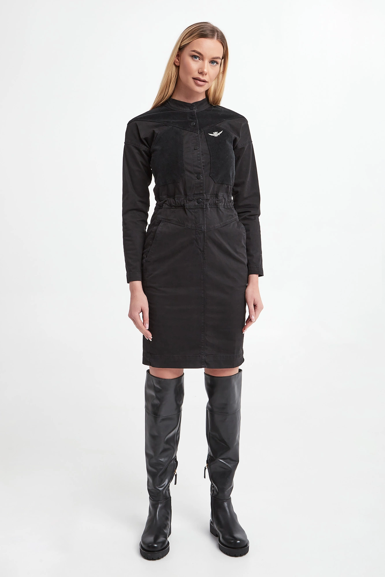 Sukienka marki Aeronautica Militare w czarnym kolorze. W militarnym stylu. Wykonana z bawełny z dodatkiem elastycznych włókien. Fason typu regular, o długości mini. Zapinana za pomocą nap. Ze stójka. Model z sześcioma kieszeniami. Na całości wstawki sztruksowego materiału. W talii elastyczny ściągacz. Z przodu haft z logo i nazwą marki. Rękaw 3/4. Z tyłu naszywka z haftem.