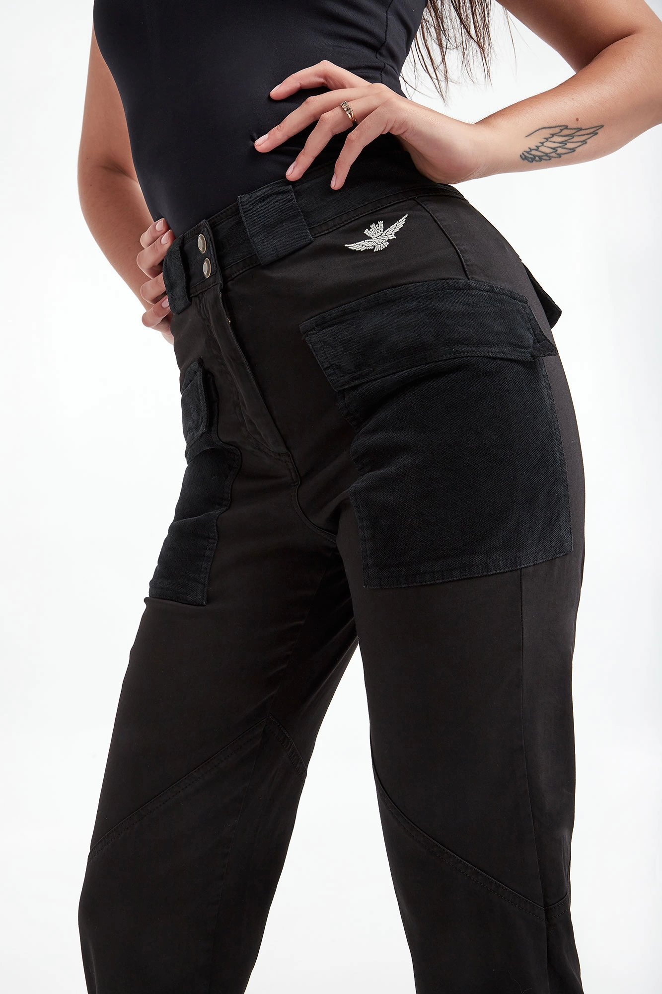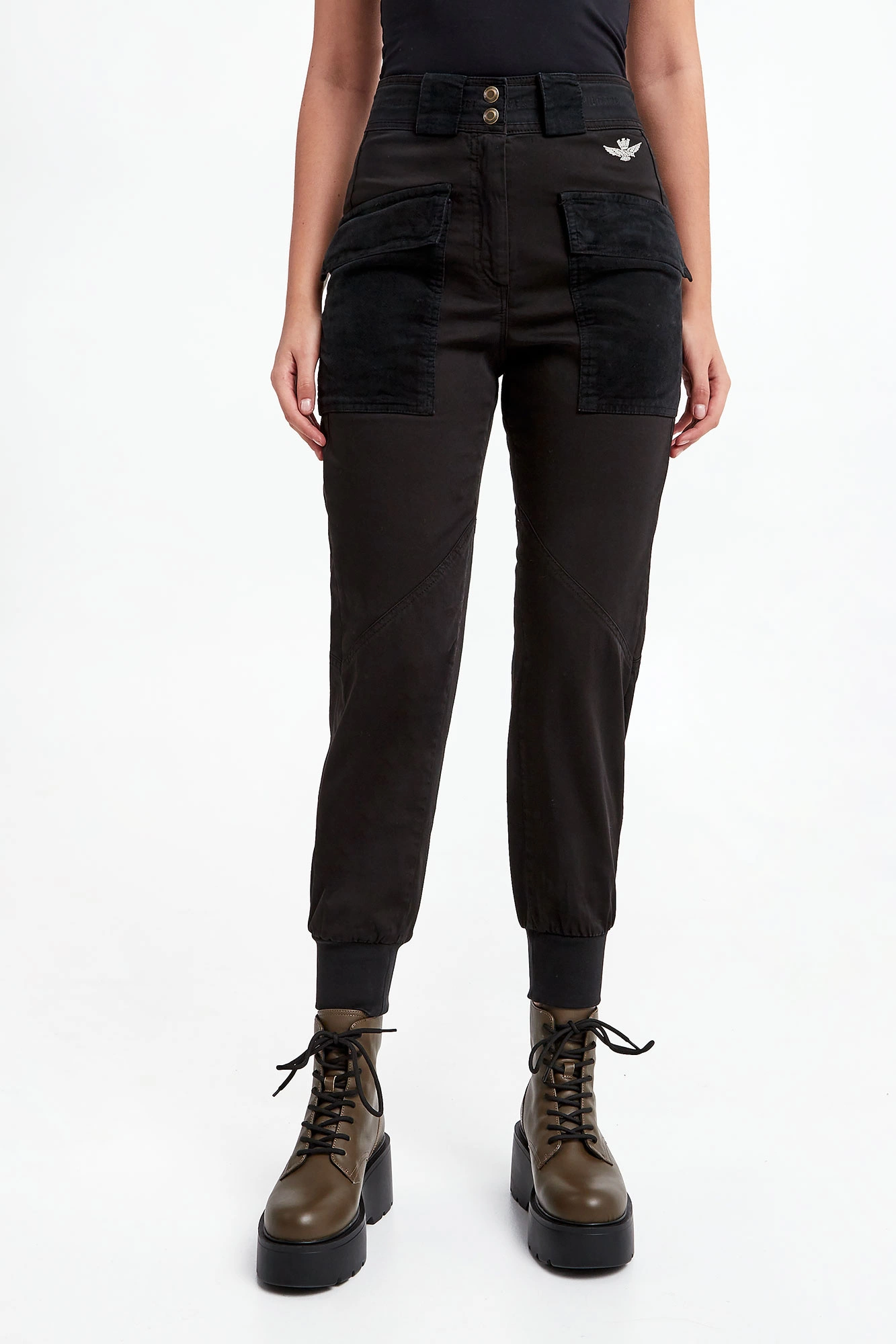 Spodnie cargo marki Aeronautica Militare w czarnym kolorze. Wykonane z bawełny z domieszką elastycznych włókien. Fason jogger. Zapinane za pomocą zamka i sygnowanych guzików. Model z czteroma kieszeniami z patką. Z przodu haft z logo marki. Na części sztruksowe wstawki. W pasie szerokie szlufki. Nogawki zakończone elastycznym ściągaczem.