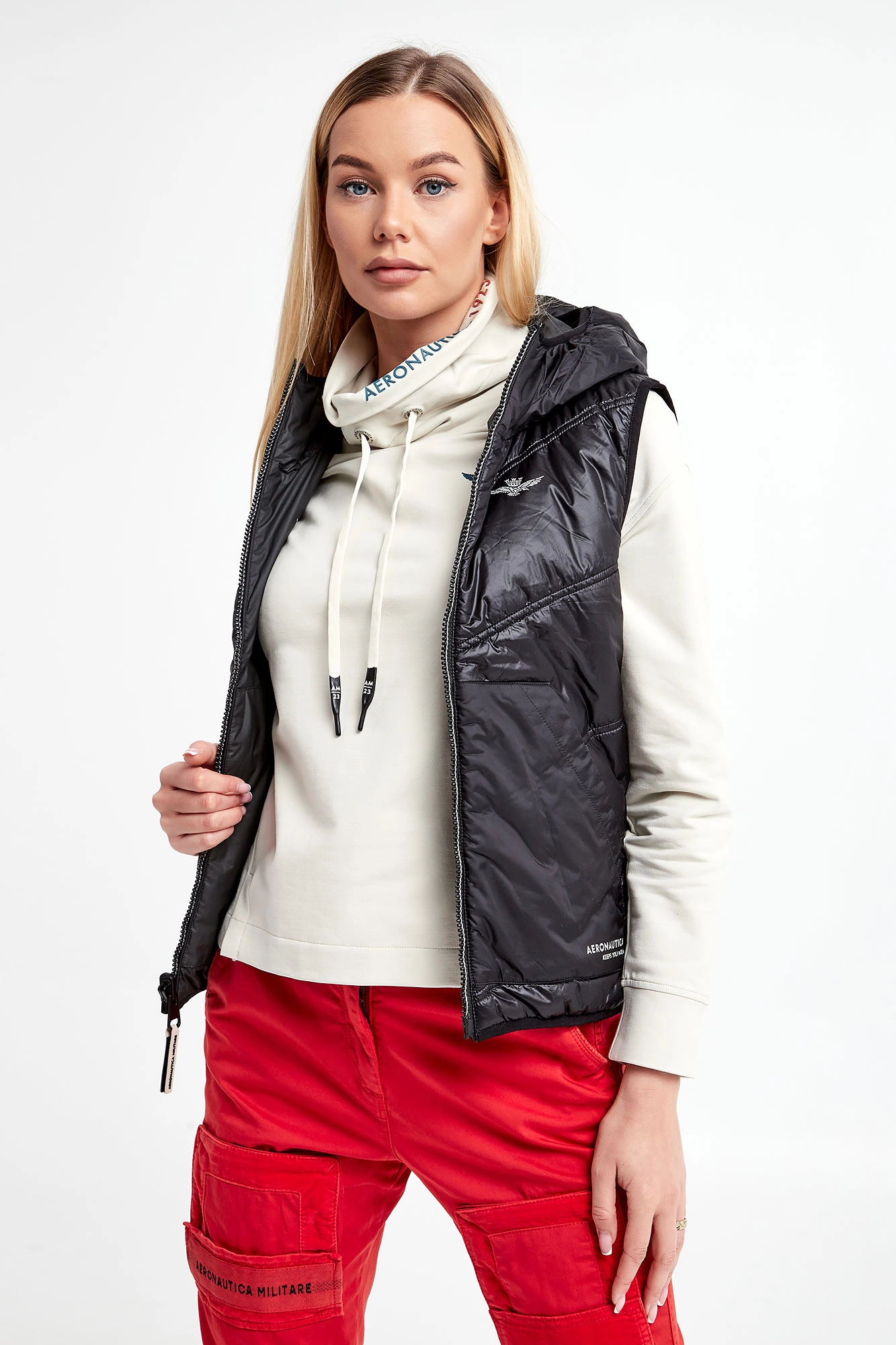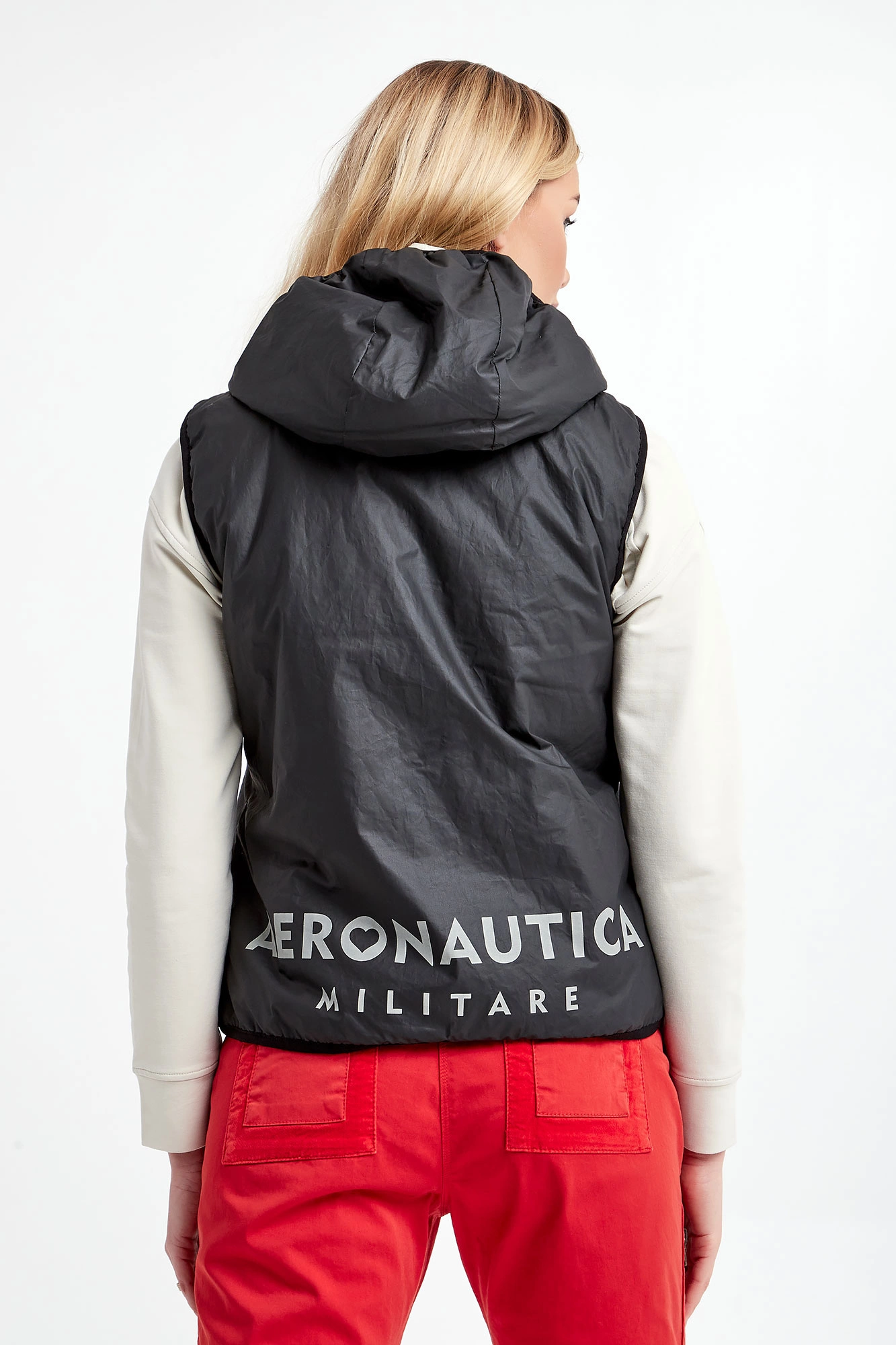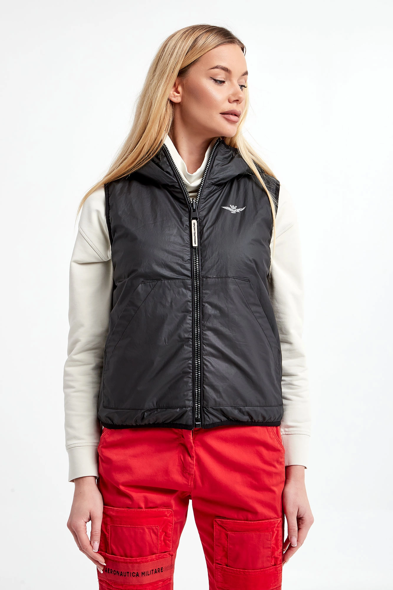 Dwustronna kamizelka marki Aeronautica Militare w czarnym kolorze. Jedna strona pikowana, druga gładka wykonana z bardziej sztywnego materiału. Z tyłu jasny nadruk z nazwą firmy. Syntetyczne wypełnienie. Model z dwiema kieszeniami na każdej stronie. Zapinana na dwustronny zamek. Fason typu regular.