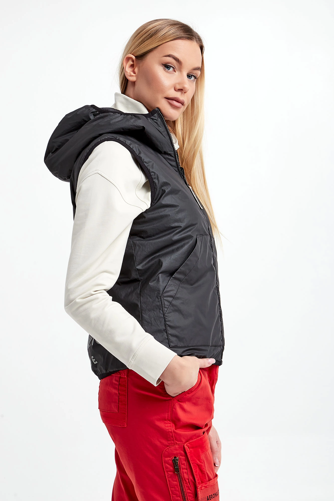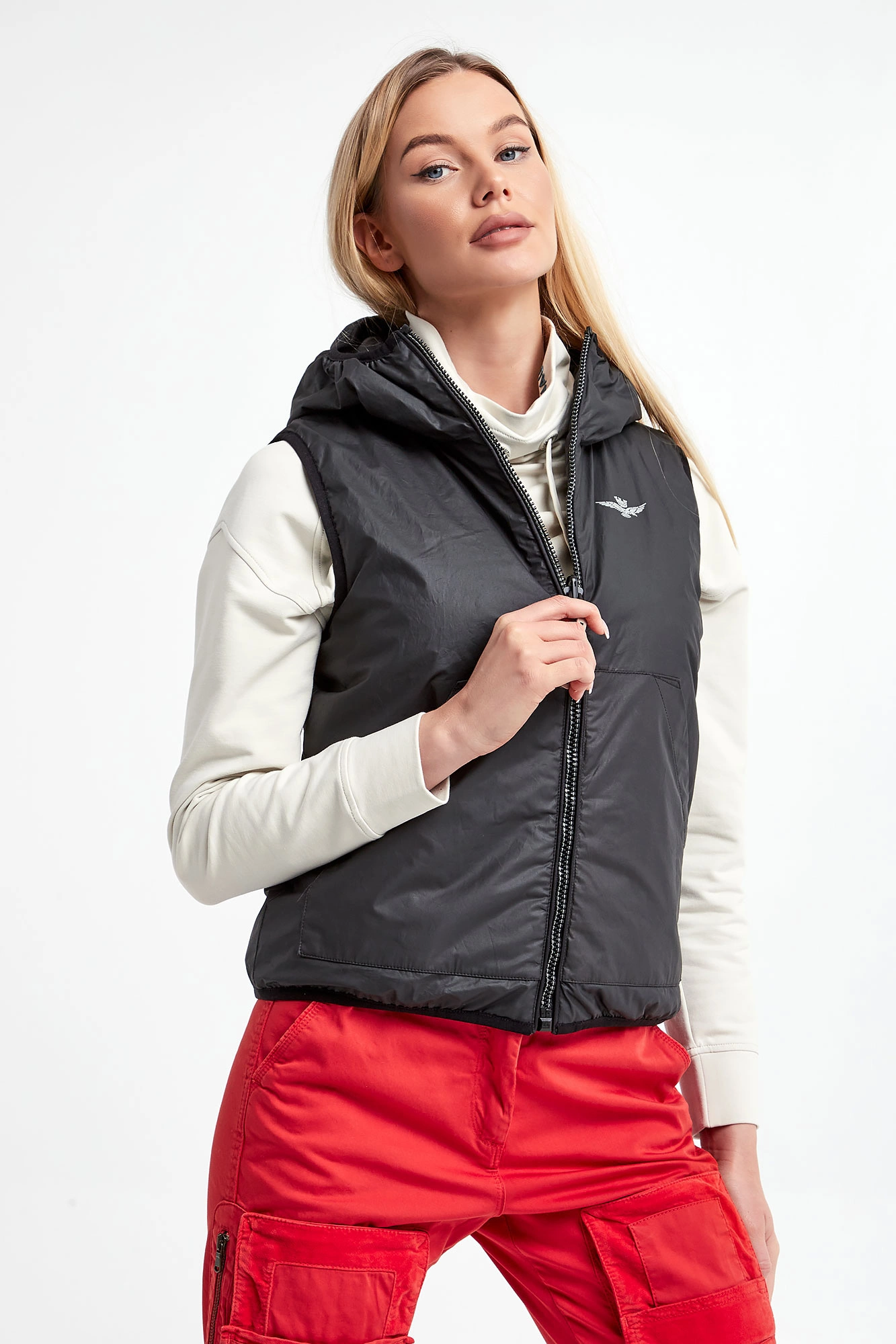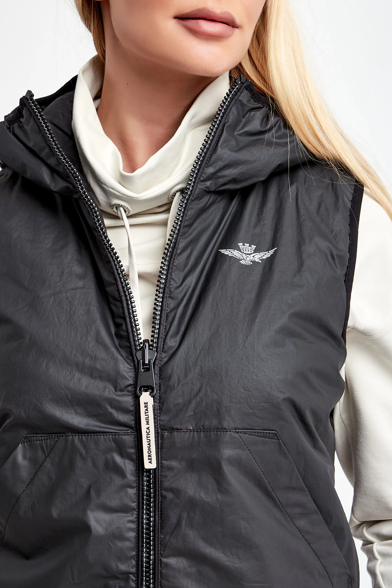 Dwustronna kamizelka marki Aeronautica Militare w czarnym kolorze. Jedna strona pikowana, druga gładka wykonana z bardziej sztywnego materiału. Z tyłu jasny nadruk z nazwą firmy. Syntetyczne wypełnienie. Model z dwiema kieszeniami na każdej stronie. Zapinana na dwustronny zamek. Fason typu regular.
