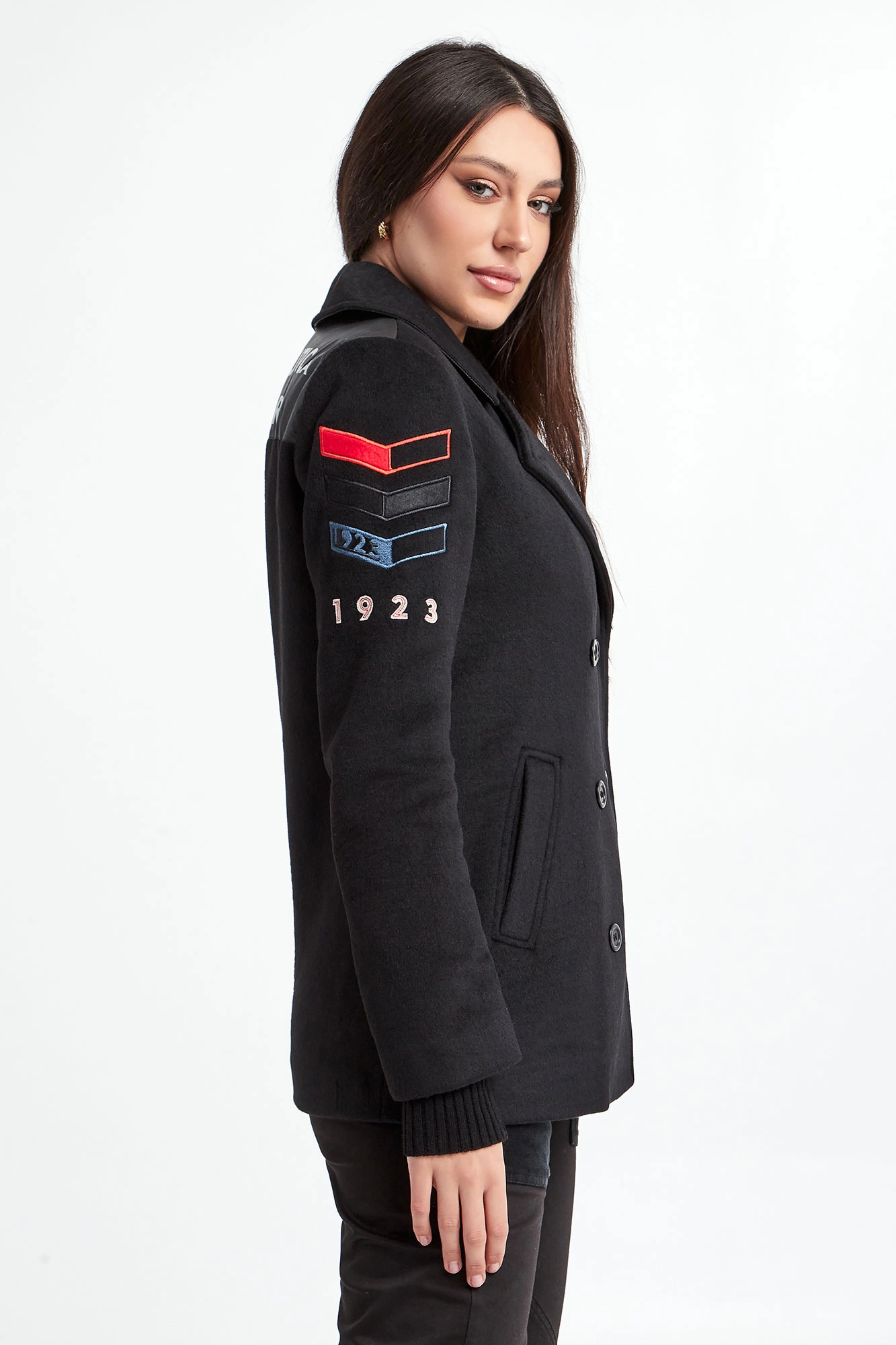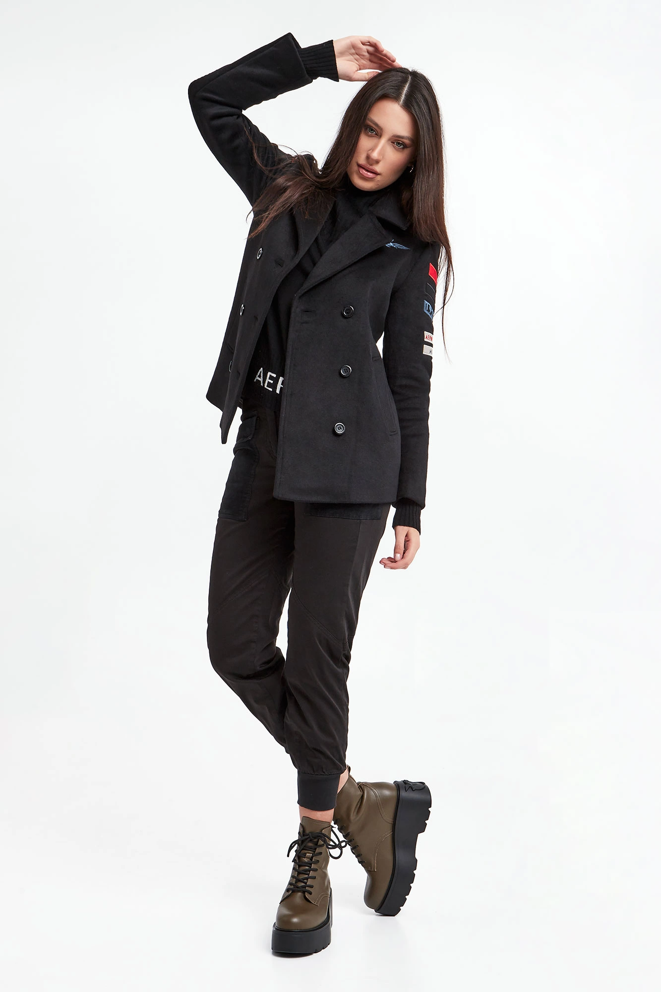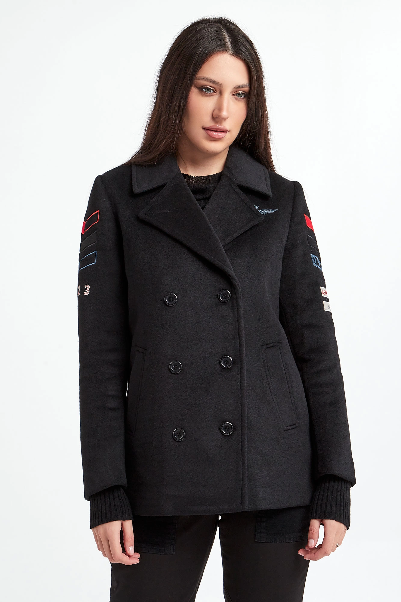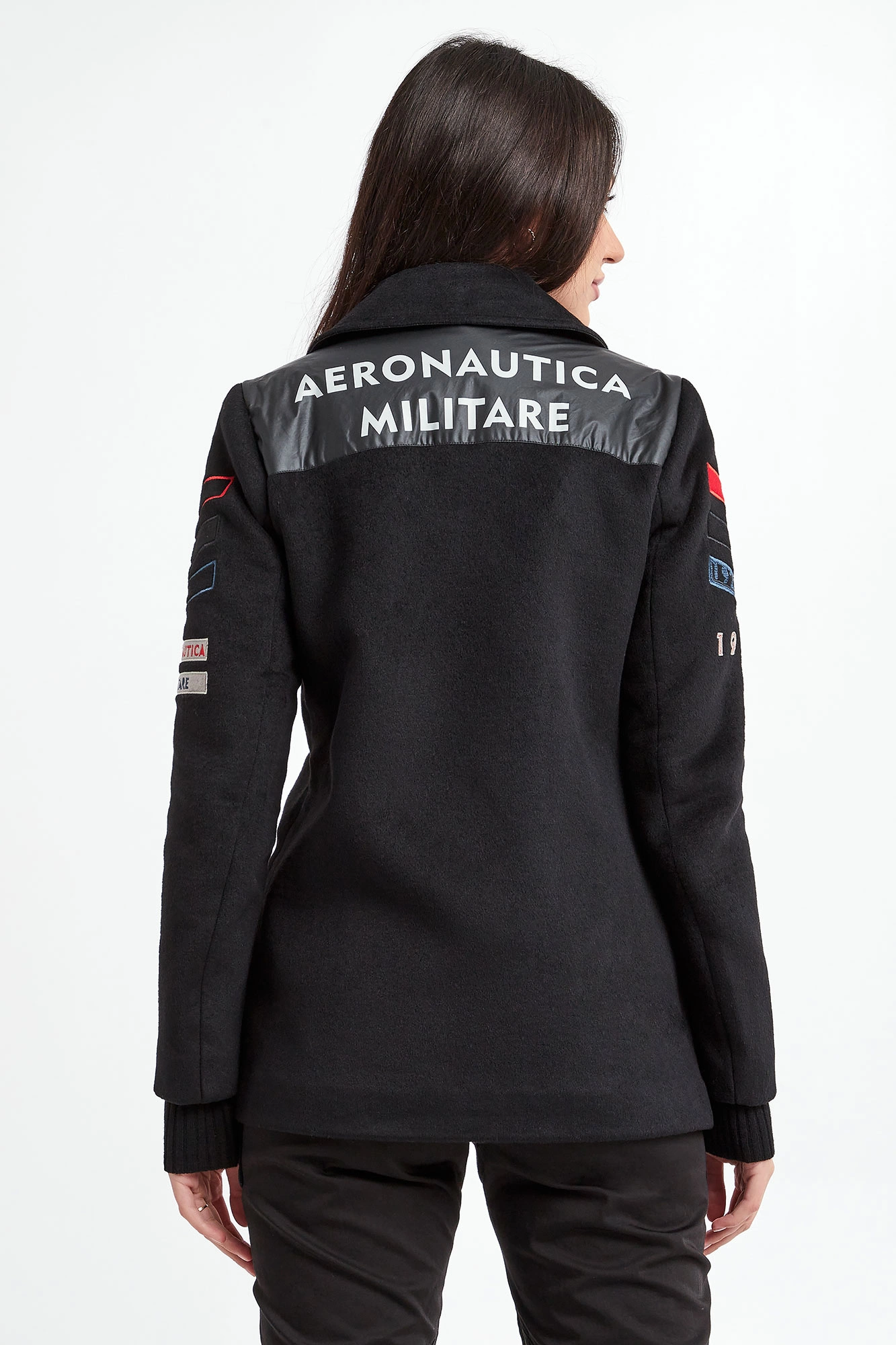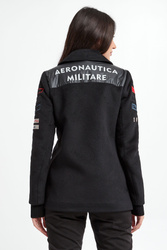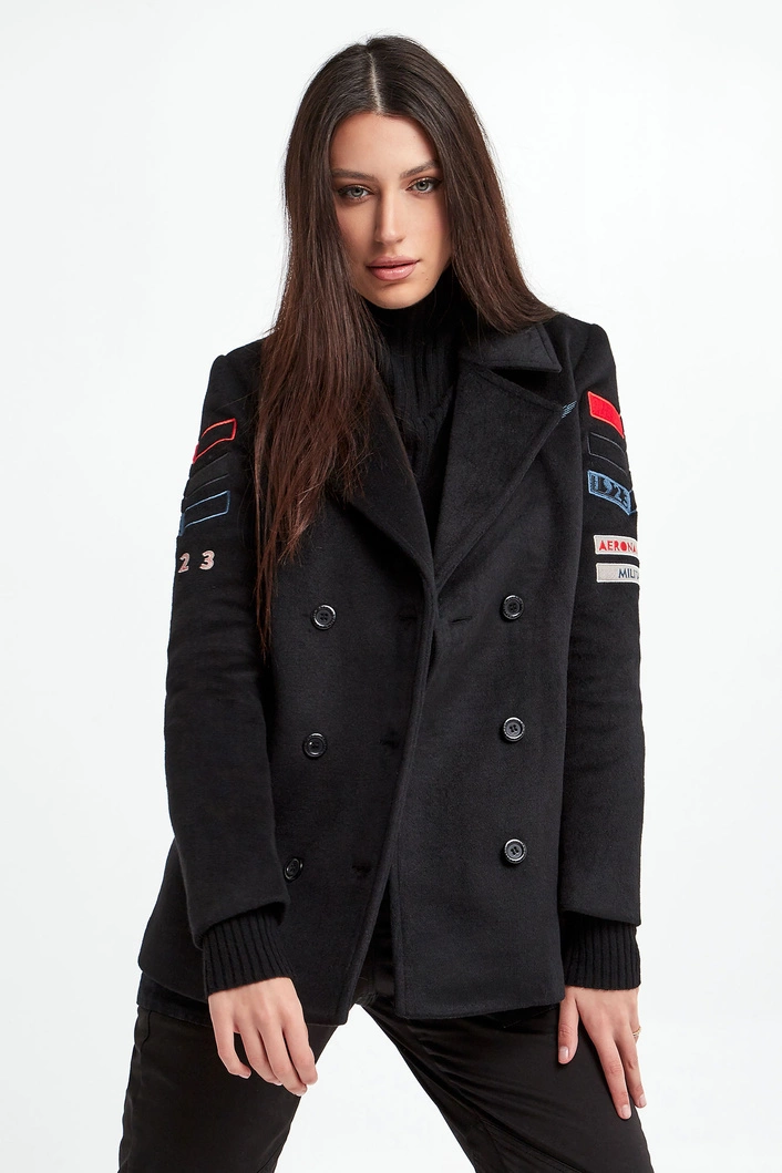 Płaszcz marki Aeronautica Militare w czarnym kolorze. Model dwurzędowy typu bosmanka. Fason relaxed. Dekolt wykończony kołnierzykiem. Zapinany na czarne sygnowane guziki. Model z dwoma wpuszczanymi kieszeniami. Na ramionach militarne naszywki charakterystyczne dla marki. Z tyłu pod kołnierzem duża, naszyta aplikacja z nazwą marki. Wykonany z miękkiej tkaniny z dodatkiem wełny.