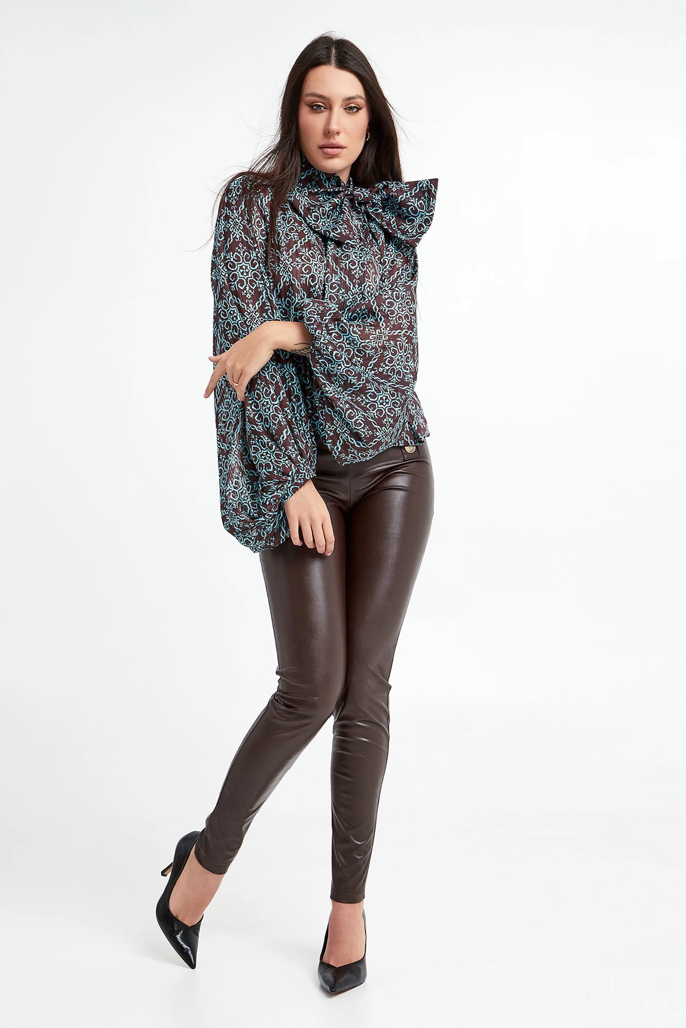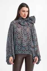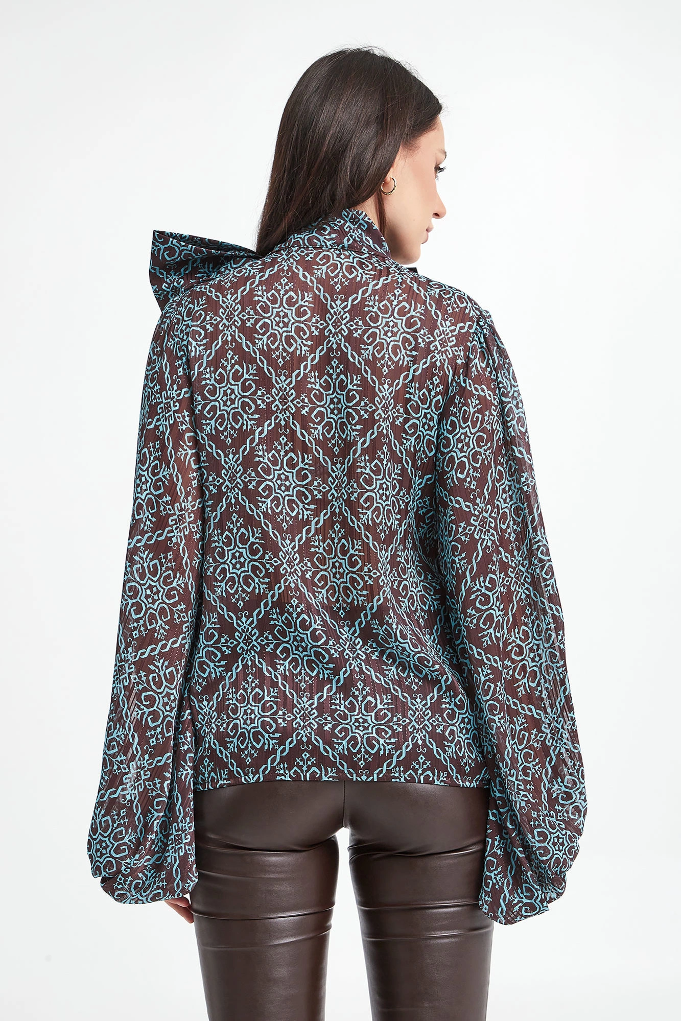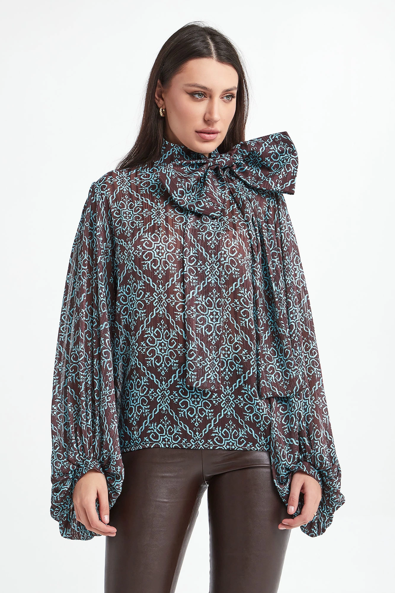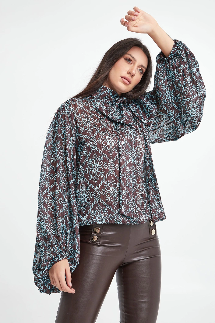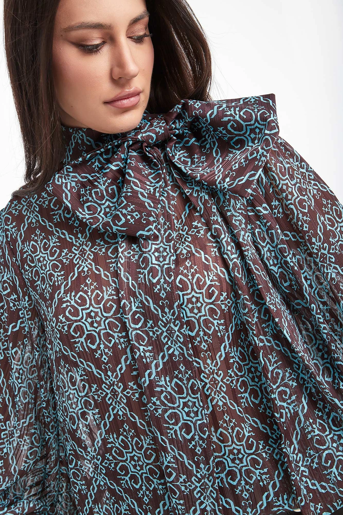 Bluzka z kokardą marki Babylon w kolorze brązowo-niebieskim. Na całości wzór z motywem nordyckim, wykończony złotą nitką. Model ze stójką, zapinany na guziki, z odpinaną kokardą. Długie, szerokie i mocno bufiaste rękawy. Dół zakończony ściągaczem. Bluzka wykonana z delikatnego, półtransparentnego materiału. Fason typu regular.