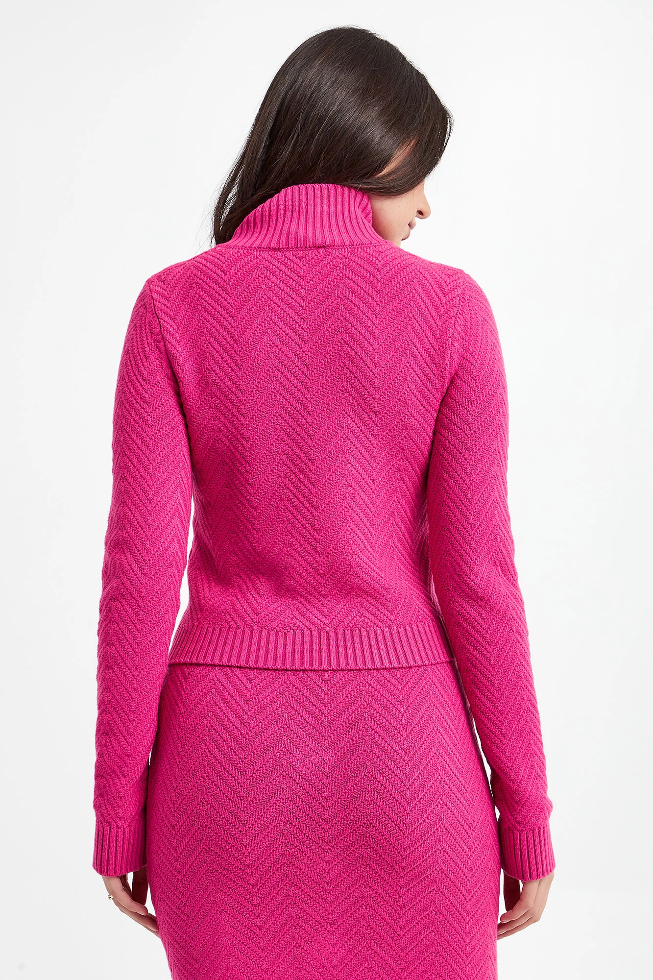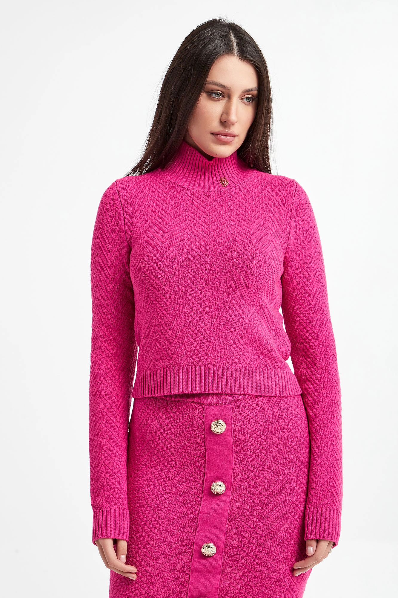 Sweter marki Babylon w fuksjowym kolorze. Wykonana z miękkiej dzianiny. Na całości pleciony wzór. Prążkowany półgolf z aplikacją z logo marki. Dół i rękawy zakończone szerokimi ściągaczami. Przylegający fason slim.