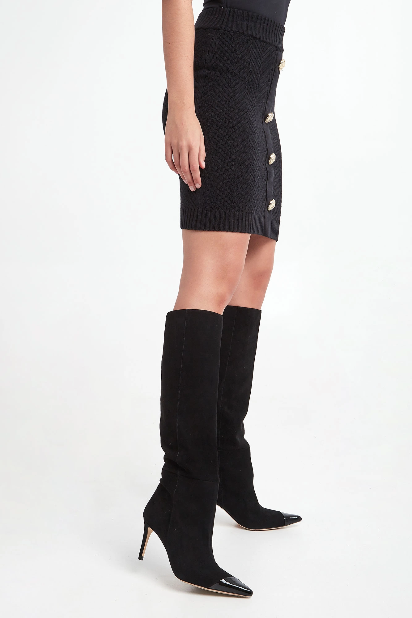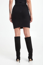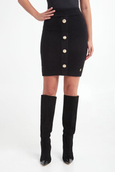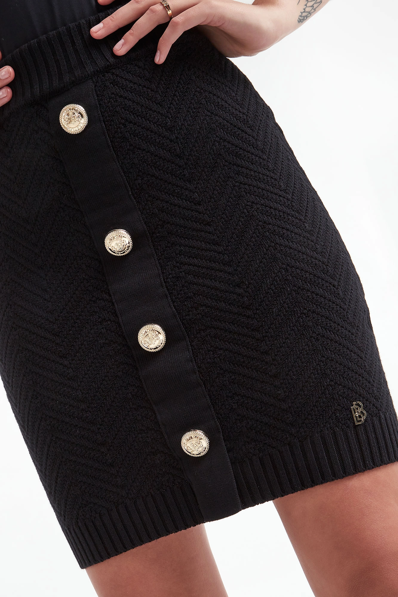 Spódnica marki Babylon w czarnym kolorze. Wykonana z elastycznej, miękkiej dzianiny. Na całości pleciony wzór. Wzdłuż patka ze złotymi guzikami z monogramem marki. W talii elastyczny ściągacz. Fason typu slim o długości mini.