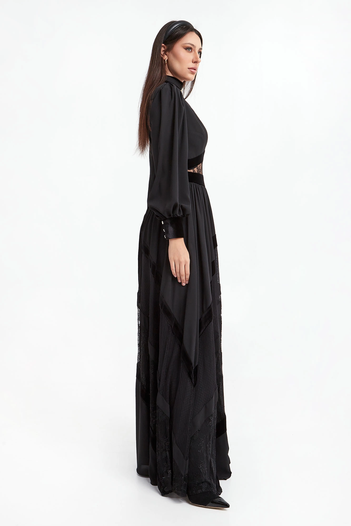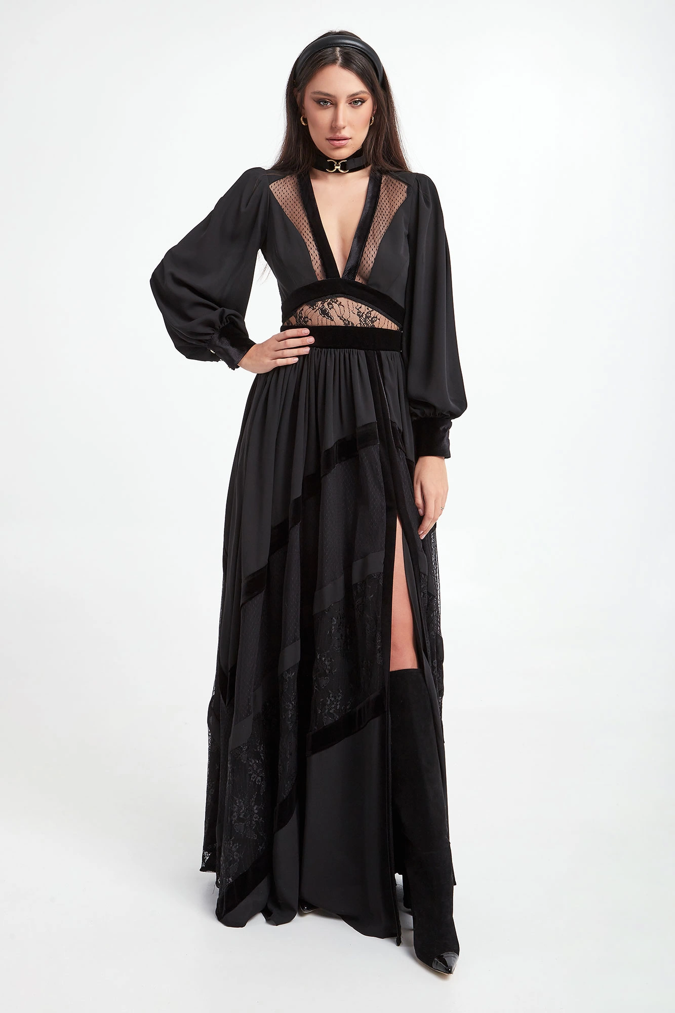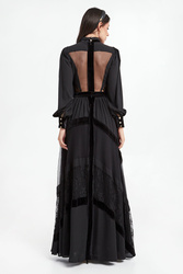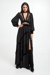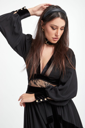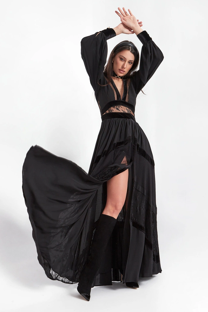 Sukienka Babylon w kolorze czarnym. Głęboki dekolt w kształcie V-neck, z biżuteryjną stójką. Na całości wstawki koronkowe i welurowe. Model z bufiastymi rękawami, zakończonymi welurowymi mankietami zapinanymi na złote guziki z logo marki. Dopasowana w talii. Tył koronkowy, transparentny zapinany na zamek i guziki przy szyi. Dół nieco szerszy z rozporkiem z przodu. Fason slim o długości maxi.