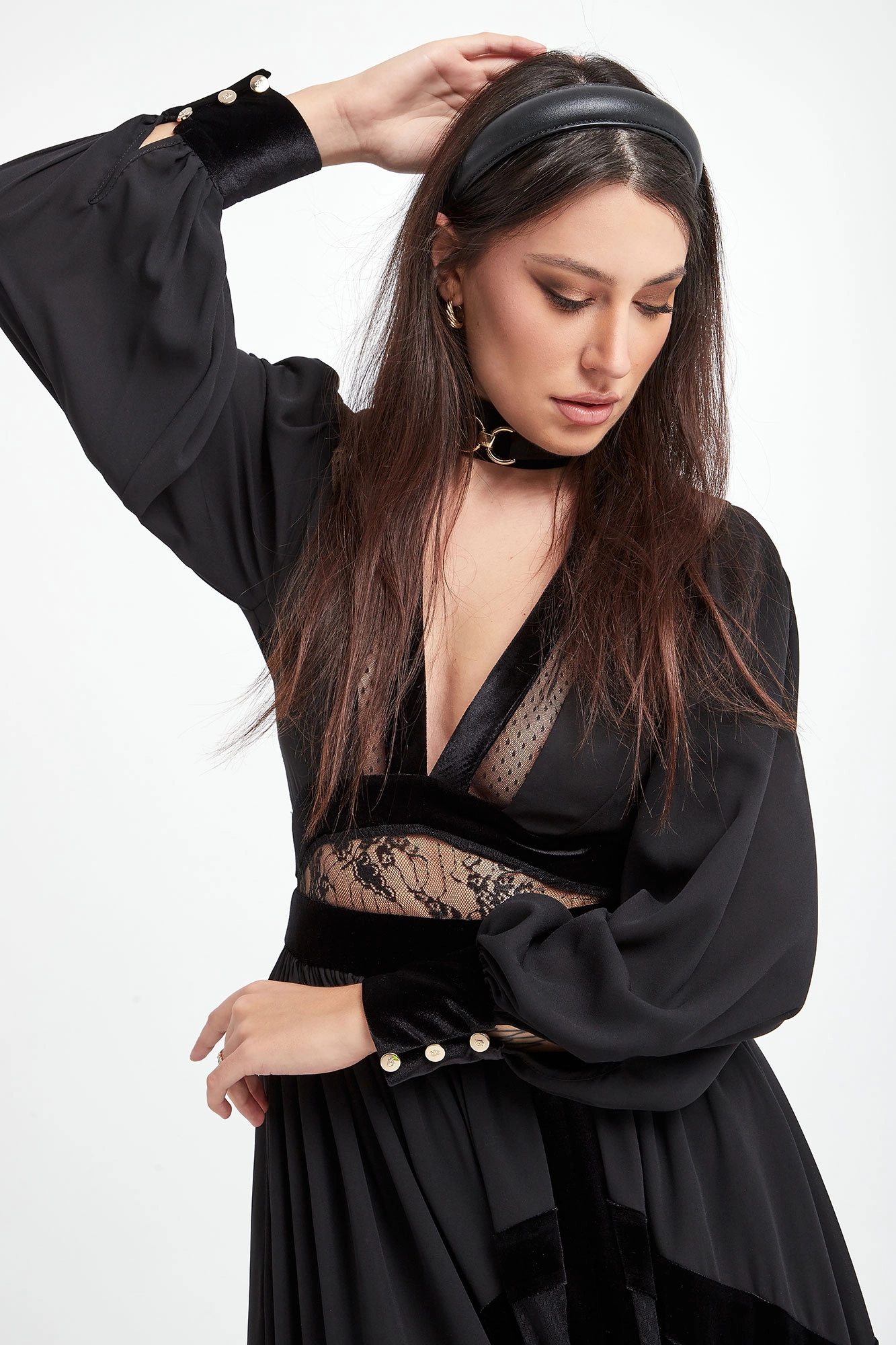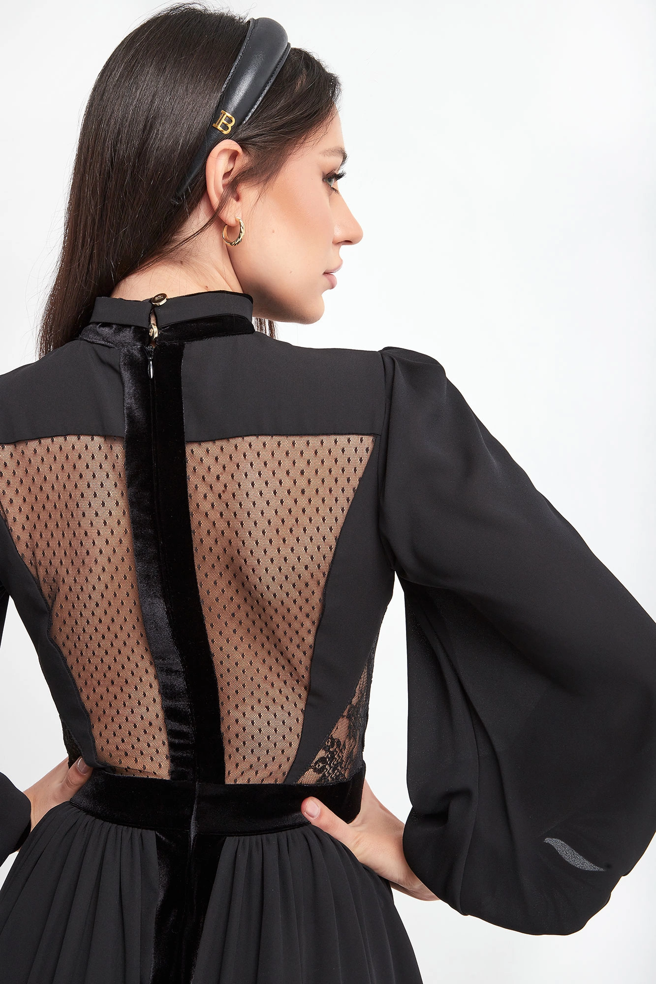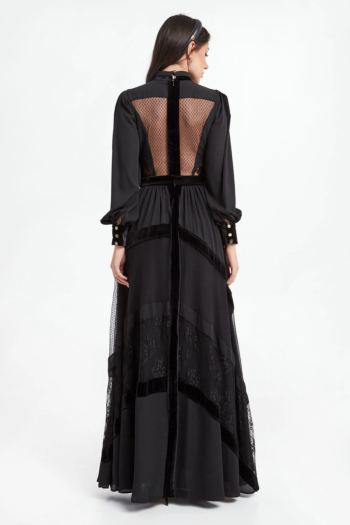Sukienka Babylon w kolorze czarnym. Głęboki dekolt w kształcie V-neck, z biżuteryjną stójką. Na całości wstawki koronkowe i welurowe. Model z bufiastymi rękawami, zakończonymi welurowymi mankietami zapinanymi na złote guziki z logo marki. Dopasowana w talii. Tył koronkowy, transparentny zapinany na zamek i guziki przy szyi. Dół nieco szerszy z rozporkiem z przodu. Fason slim o długości maxi.
