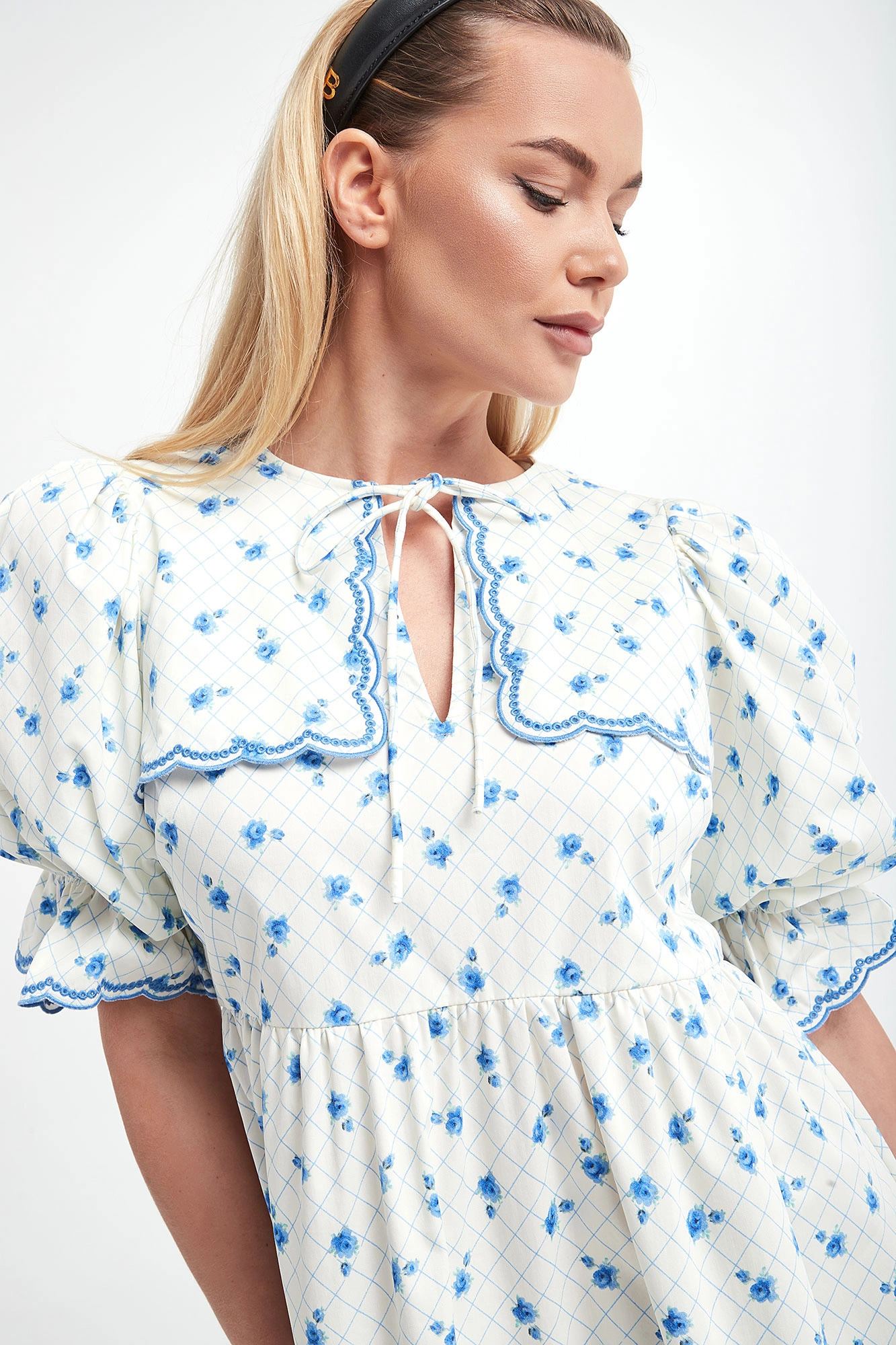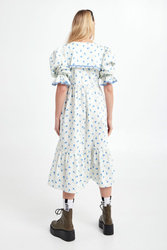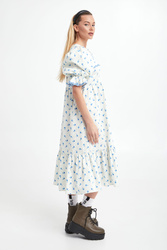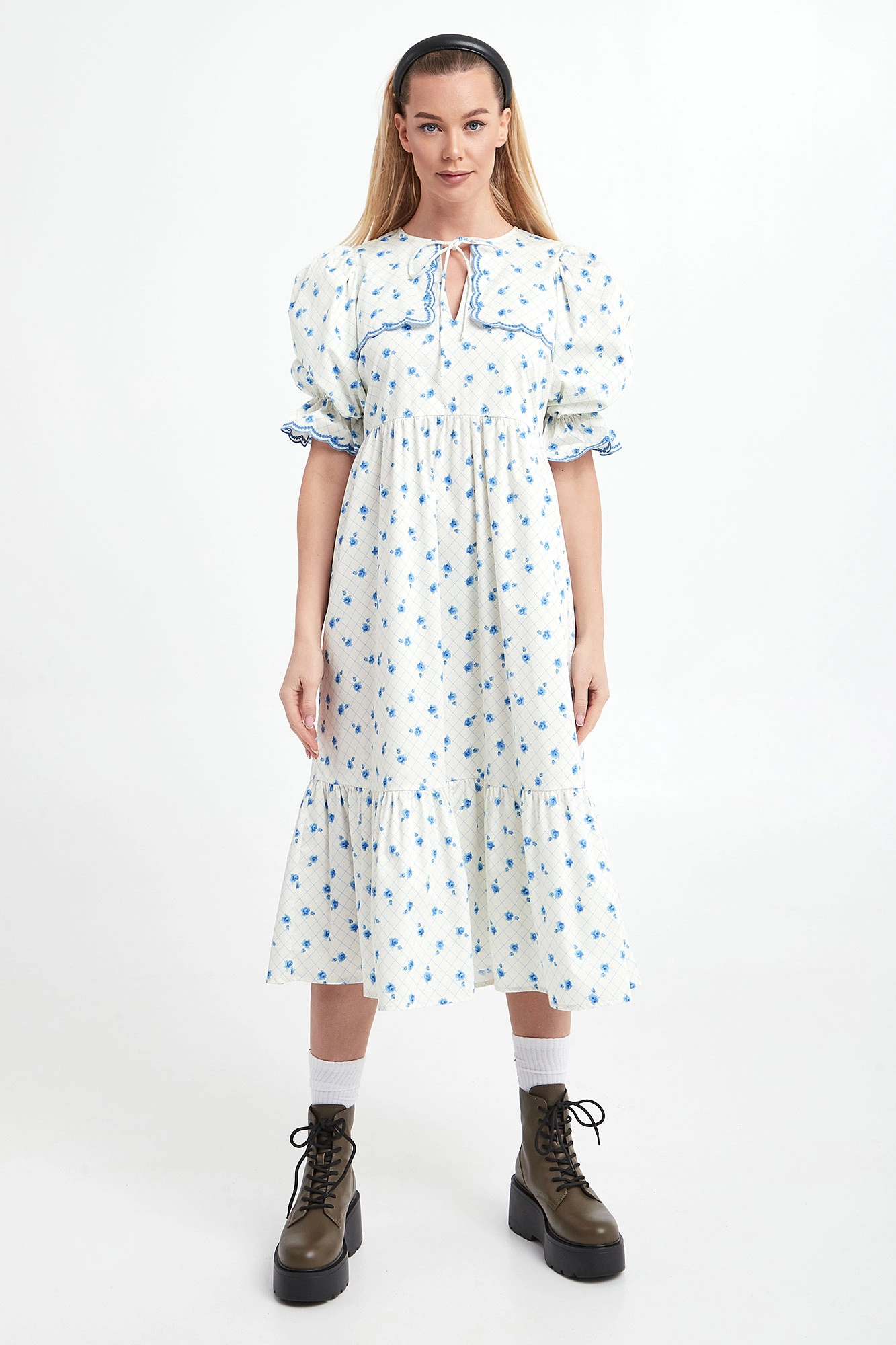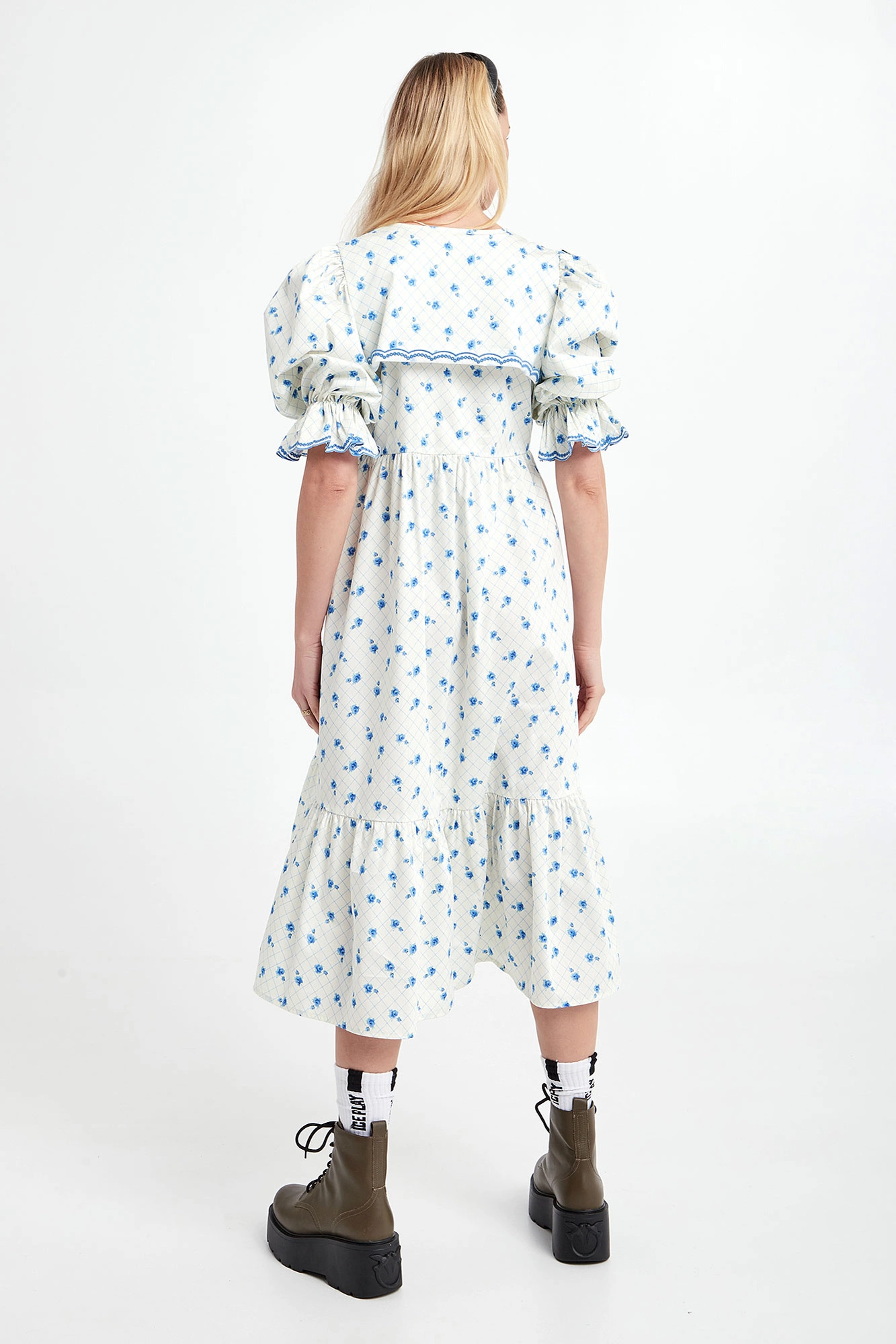 Bawełniana sukienka marki Notes du Nord w kolorze złamanej bieli. Na całości niebieski, kwiecisty wzór. Wiązany dekolt typu o-neck. Na klatce piersiowej falbanowa wstawka z ażurowym wykończeniem. Długie, bufiaste rękawy ze ściągaczem i falbanką z ażurem. Zapinana za pomocą zamka na plecach. Odcinana pod piersiami. Dół zakończony falbaną. Fason typu regular, długość midi.