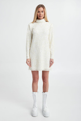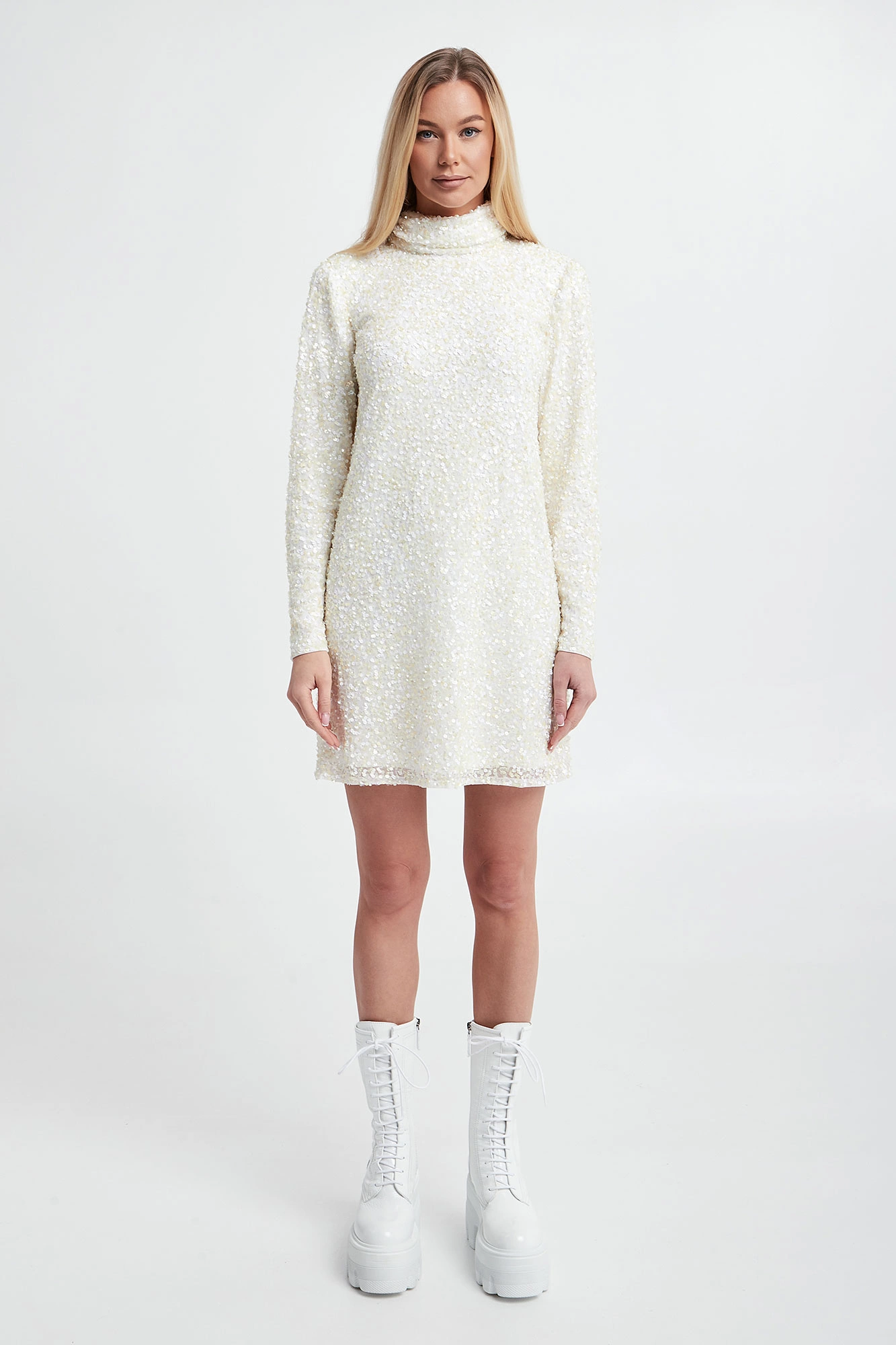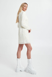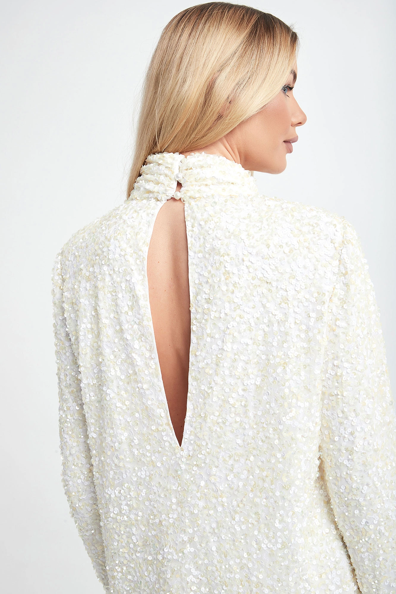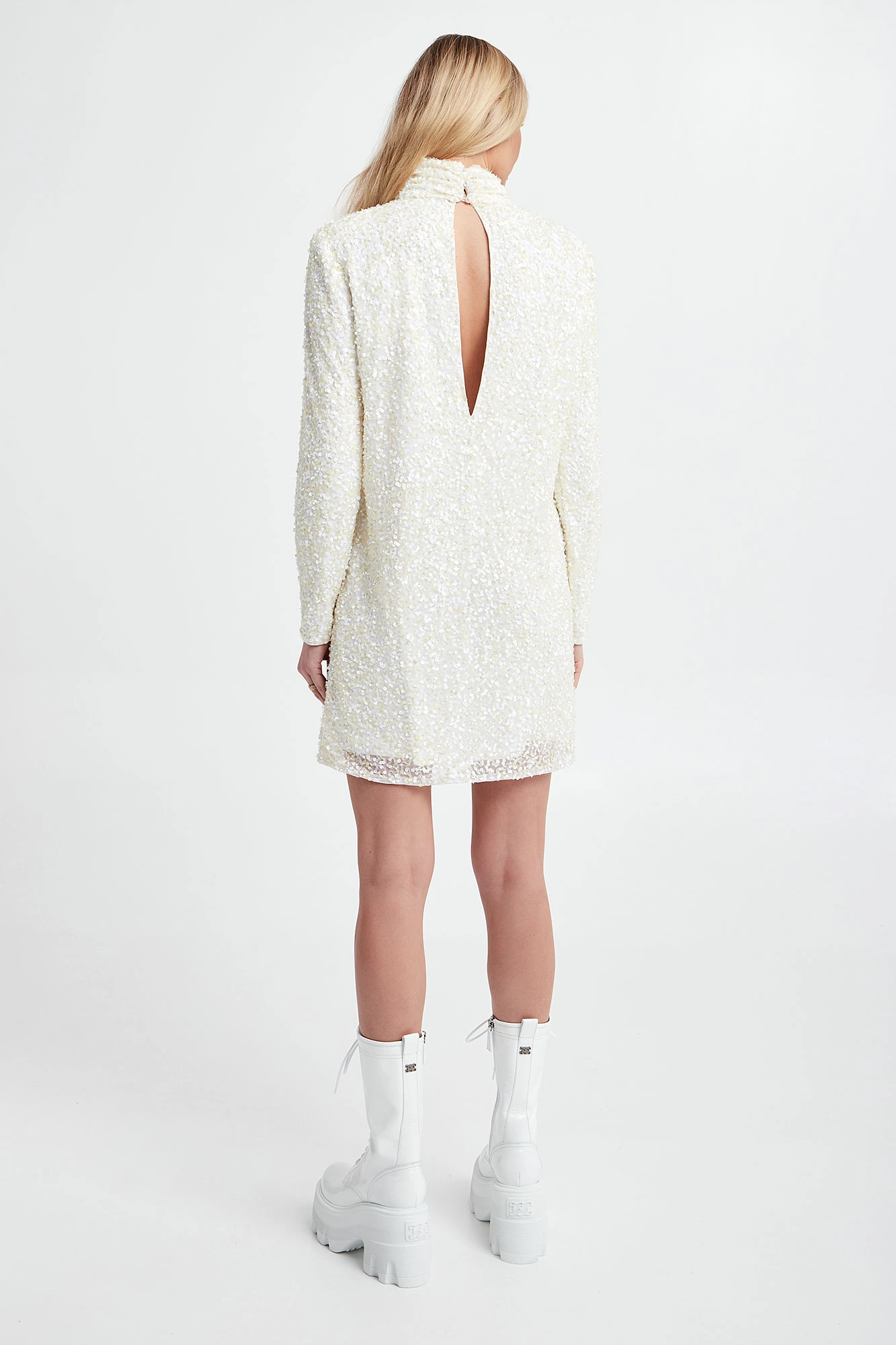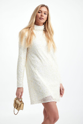 Sukienka marki Notes du Nord w kolorze ecru. Na całości tiul wykończony połyskującymi cekinami. Półgolf zapinany z tyłu za pomocą guzików. Długie rękawy. Wycięcie na plecach. Podszewka wykonana z elastycznego materiału bez prześwitów. Fason typu regular, długość mini.