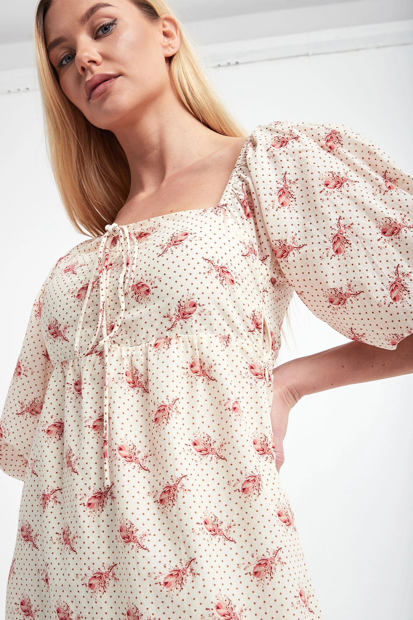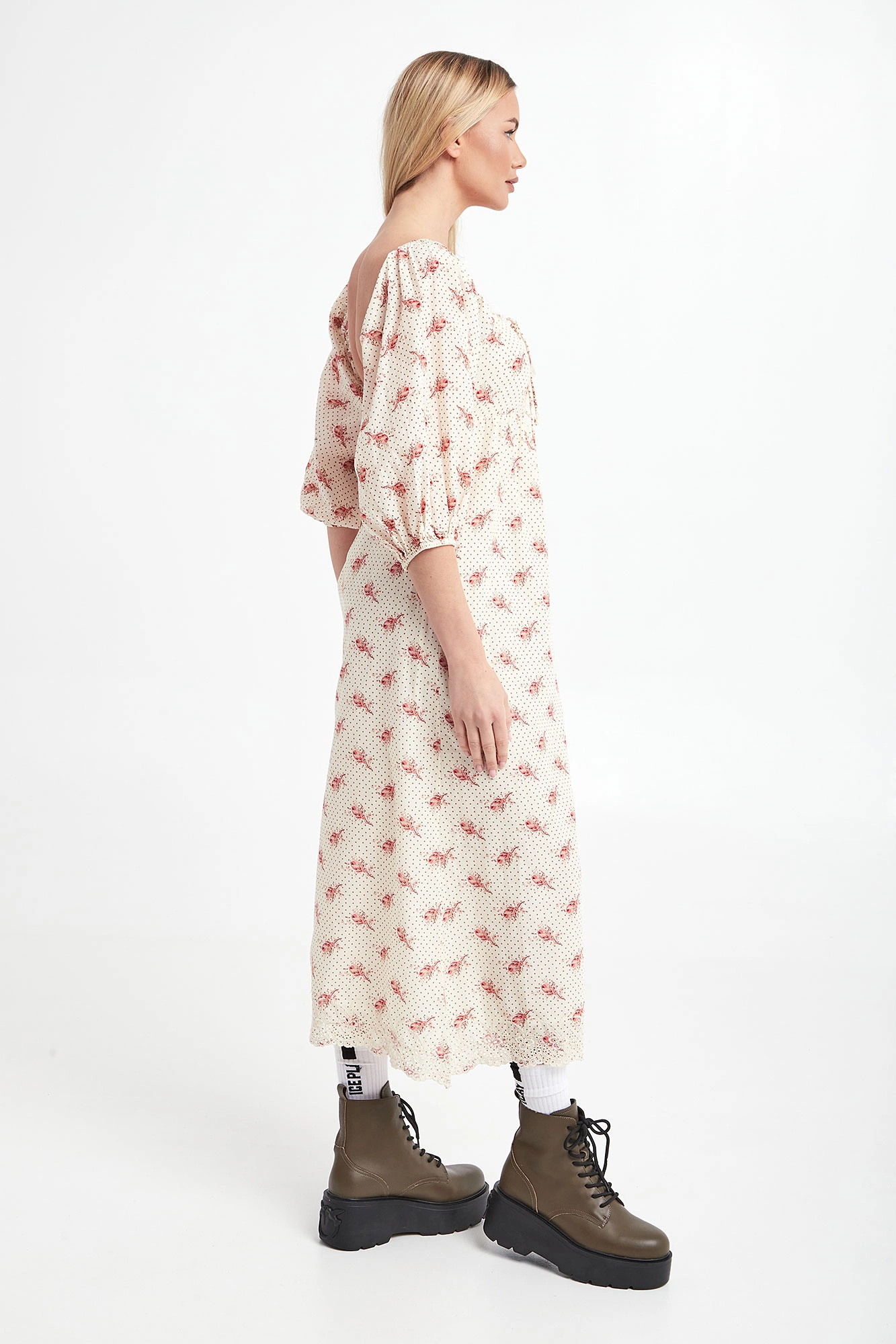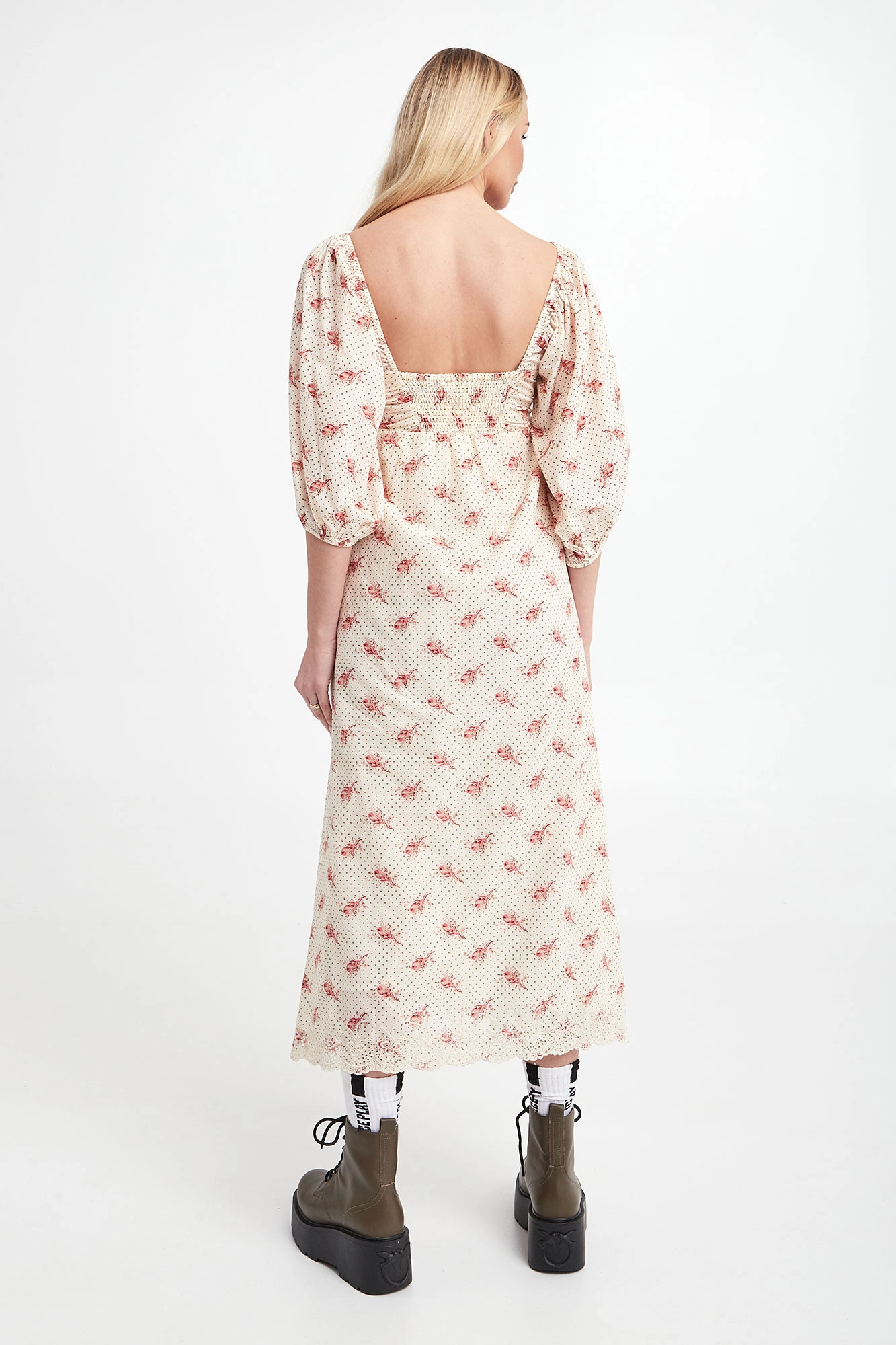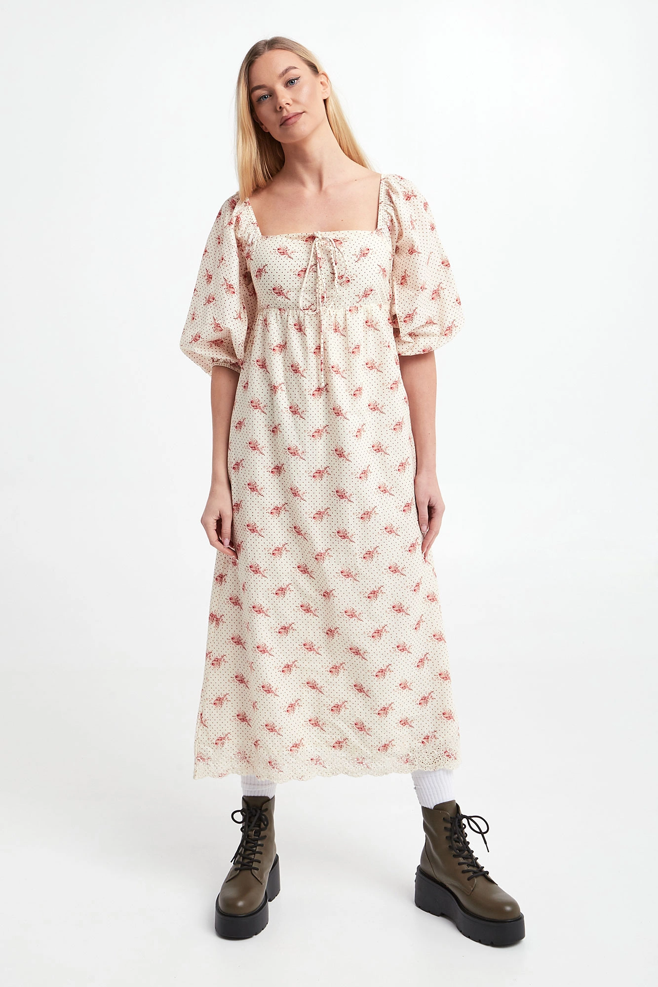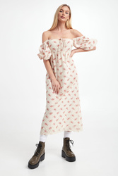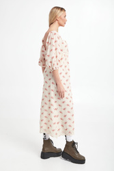 Sukienka marki Notes du Nord w kolorze ecru. Na całości różowo-beżowy, kwiecisty wzór. Wykonana z czystej bawełny. Popelinowa. Kwadratowy dekolt. Na piersiach ściągacz regulowany za pomocą sznurka, z możliwością wiązania na szyi lub na kokardkę z przodu. Gumka u dołu rękawów i wokół krawędzi ramion. Zapinana na boczny zamek. Odcinana pod piersiami. Dół wykończony ozdobnym ażurem. Na plecach marszczony ściągacz. Bawełniana podszewka. Fason typu regular, długość midi.