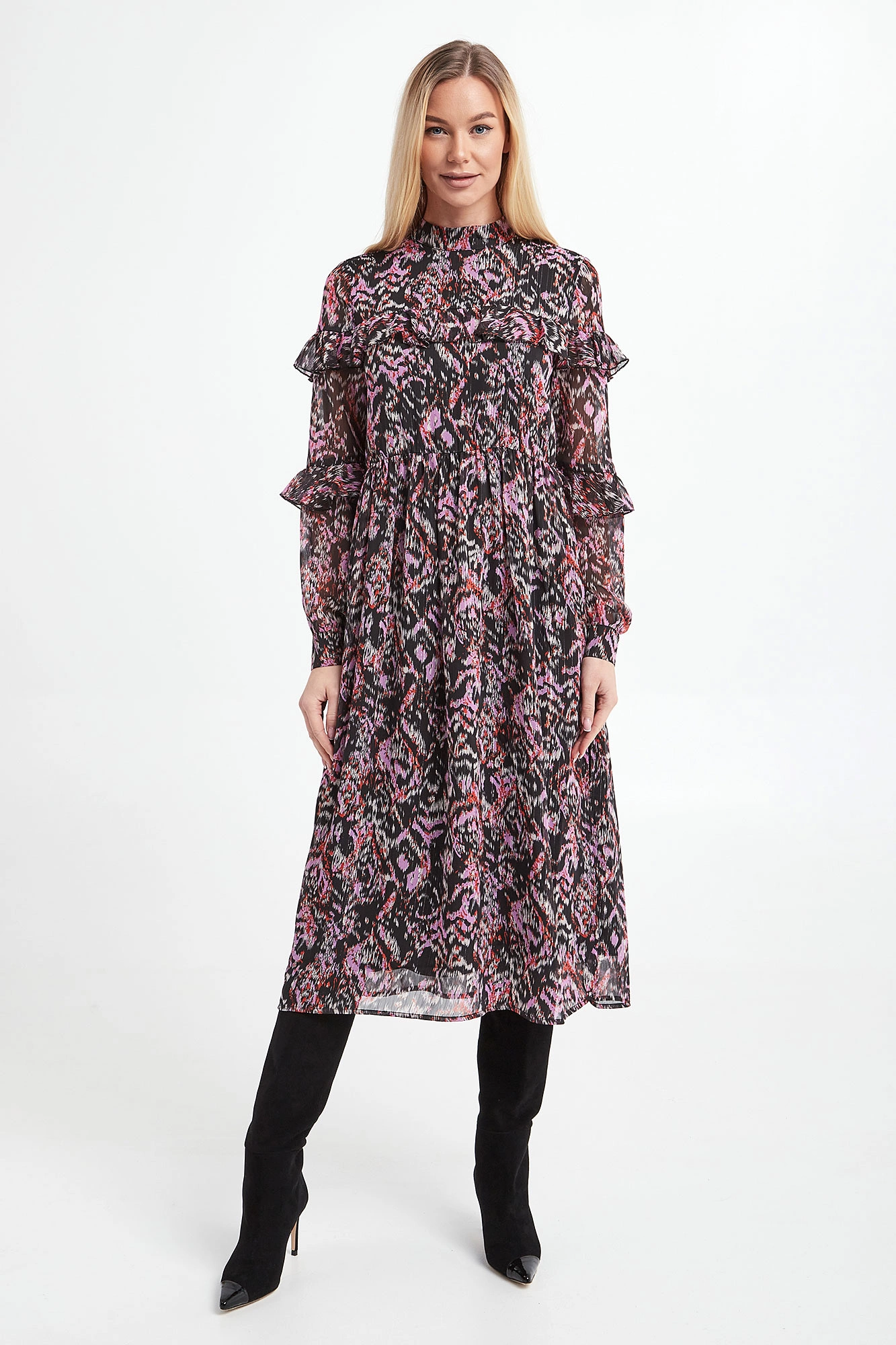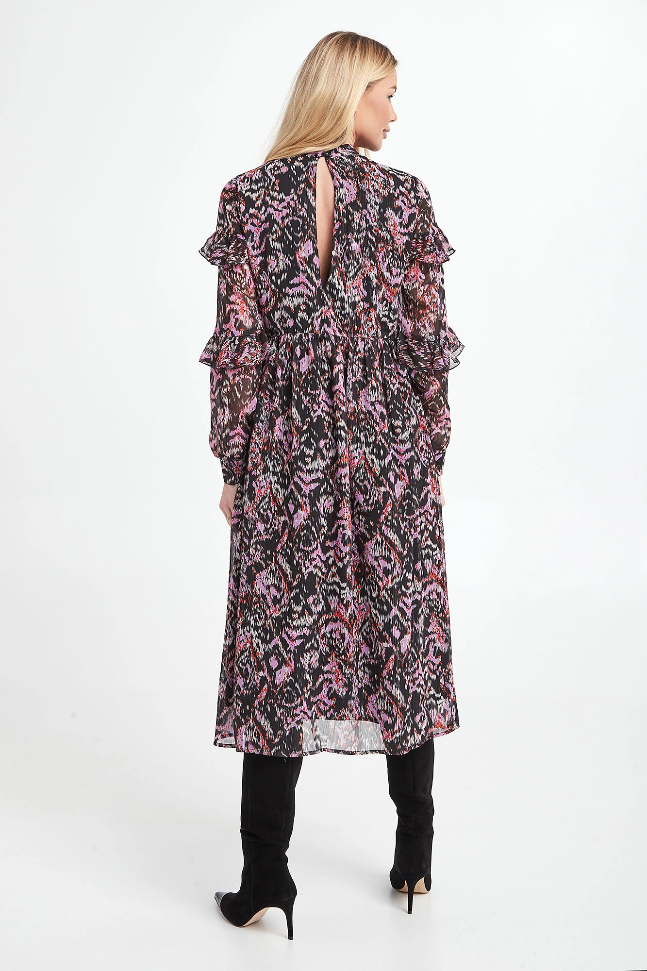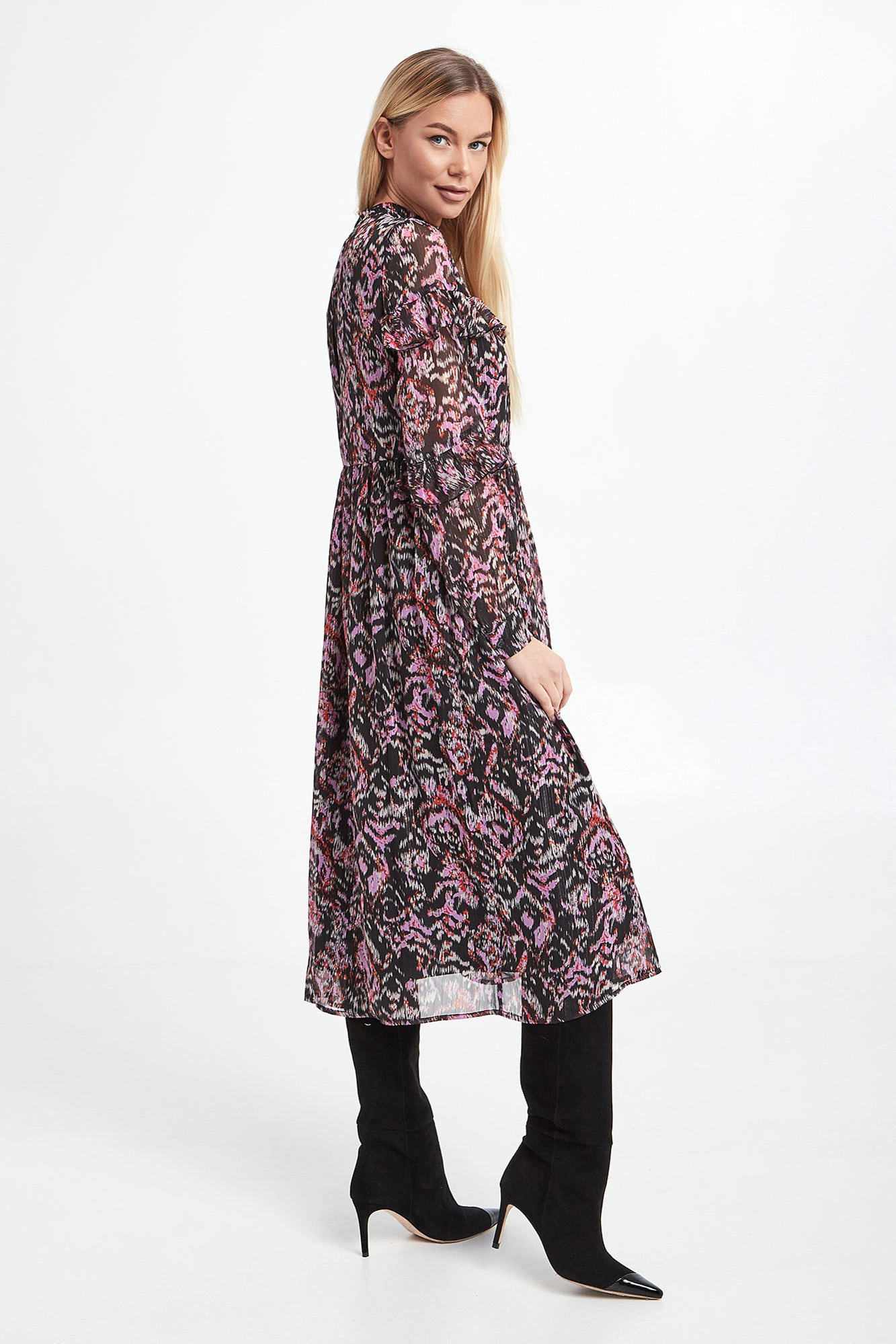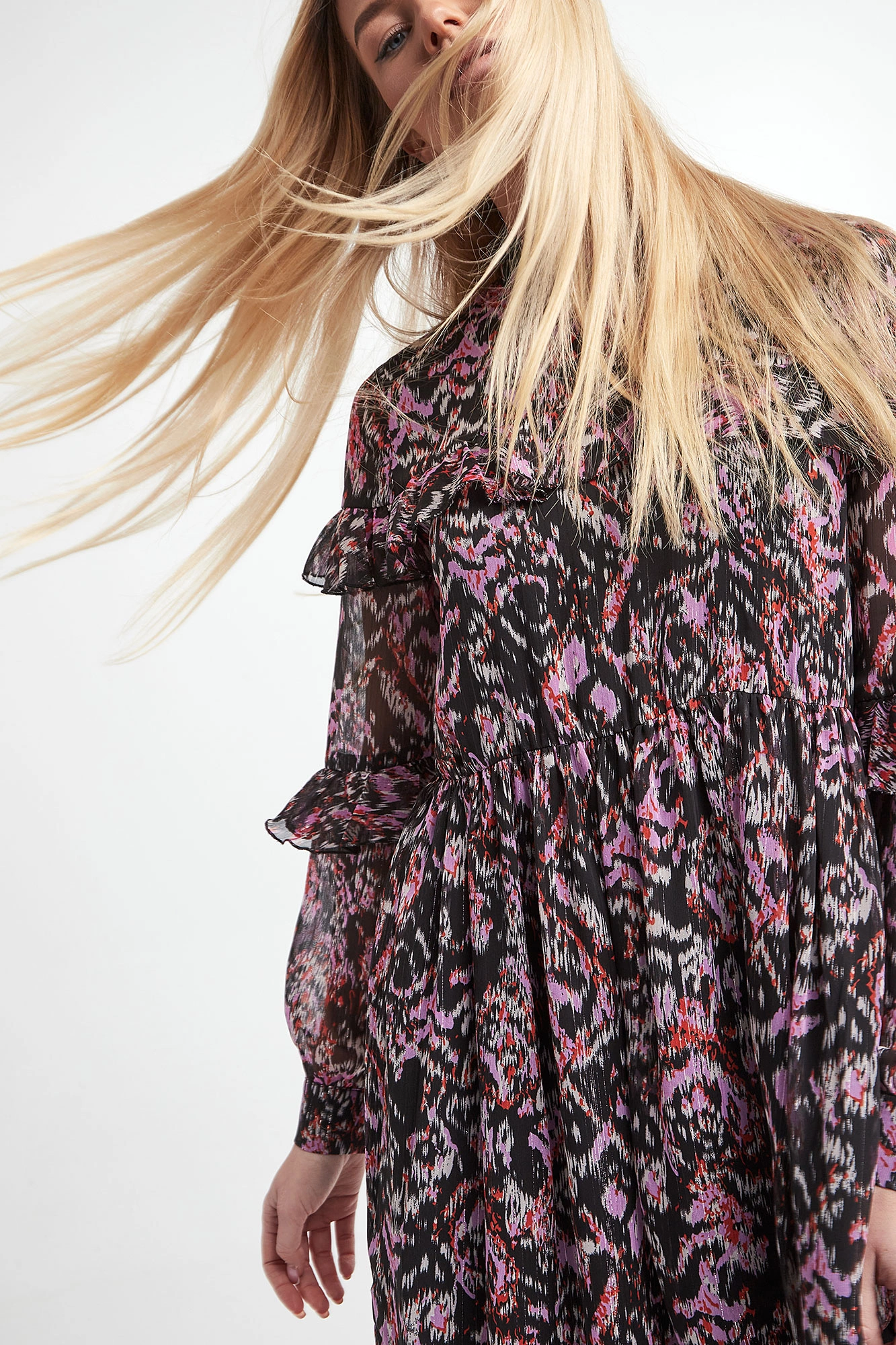 Sukienka marki Notes Du Nord w kolorowy print. Model ze stójką zapinany na guziczki. Dekolt z tyłu w kształcie łezki. Na linii biustu oraz rękawach falbany. Rękawy transparentne z mankietem zapinanym na guzik. Fason regular odcięty pod linią biustu. Długość midi.