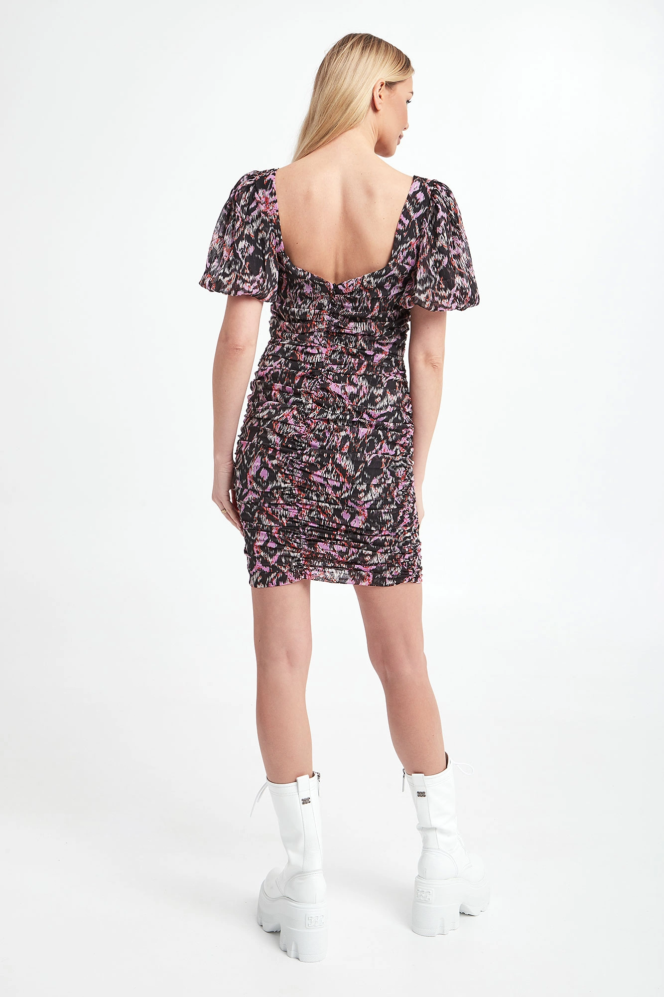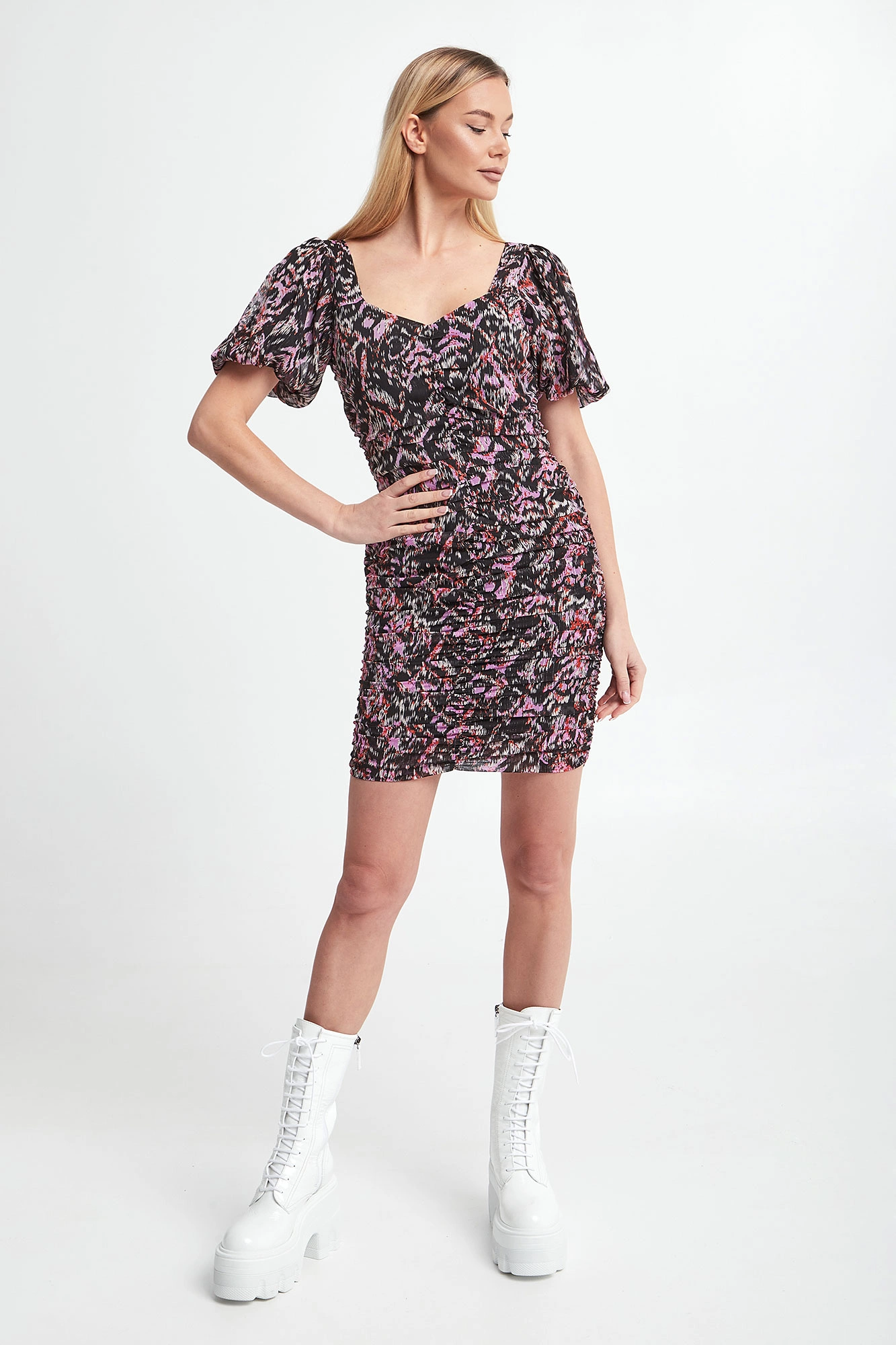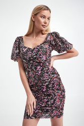 Sukienka marki Notes Du Nord w czarnym kolorze. Na całości abstrakcyjne wielokolorowe wzory i przeszycia srebrną nicią. Warstwa wierzchnia wykonana z tiulu, wnętrze z syntetycznego jedwabiu. Dekolt w stylu Królowej Anny. Bufiaste rękawki. Zapinana za pomocą zamka na plecach. Fason typu slim, długość mini.