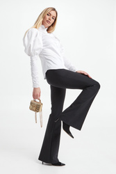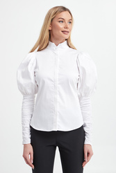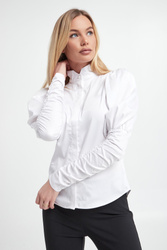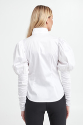 Koszula marki Notes Du Nord w kolorze białym. Model ze stójką z ozdobnym, perłowym guzikiem. Zapinana na guziki pod ukrytą plisą. Długie rękawy z bufkami na ramionach i drapowaniem od łokcia. Fason slim.