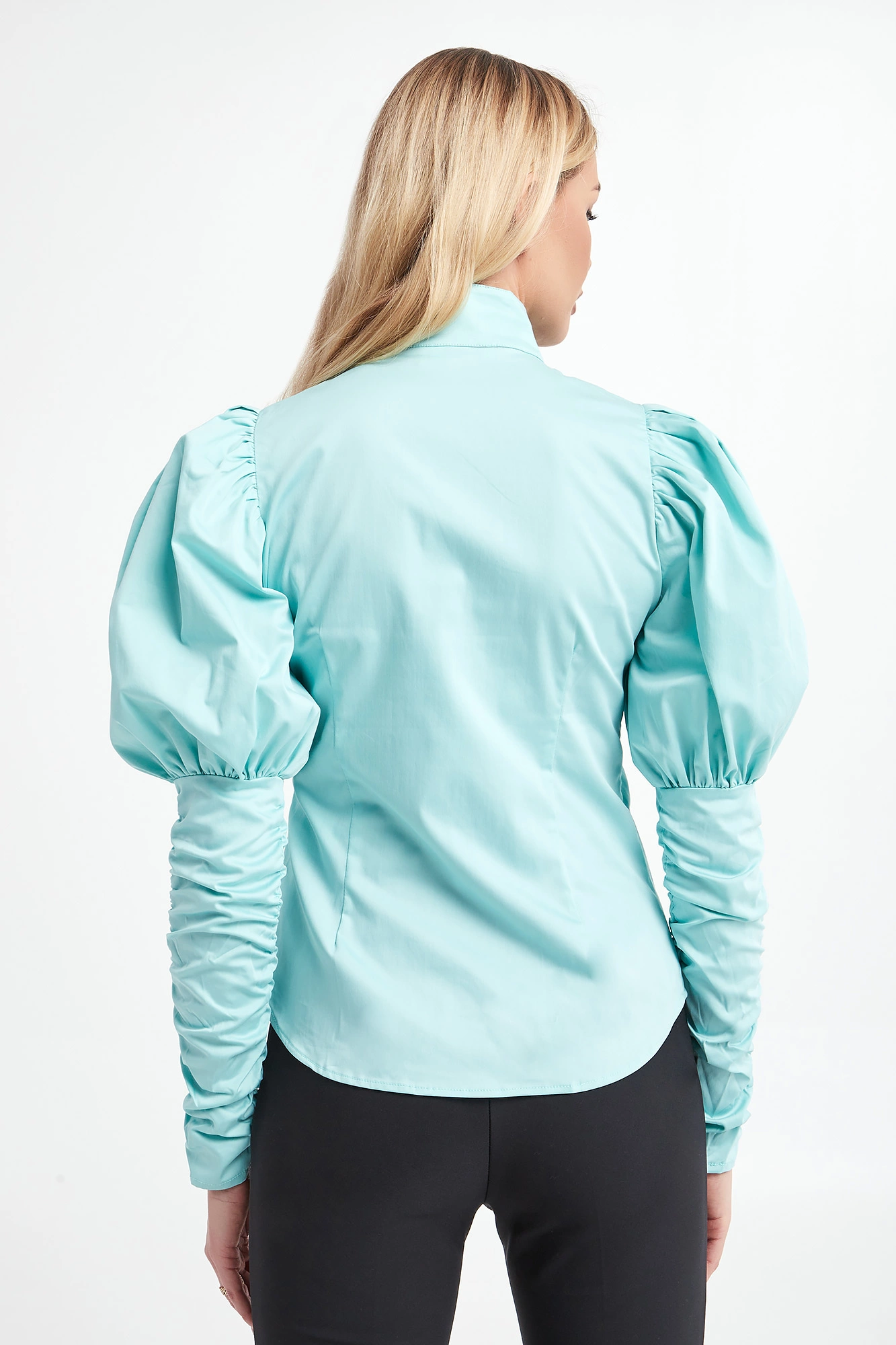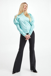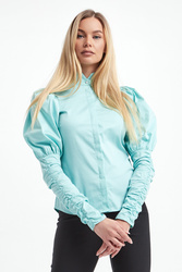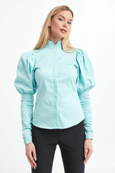 Koszula marki Notes Du Nord w kolorze miętowym. Model ze stójką z ozdobnym, perłowym guzikiem. Zapinana na guziki pod ukrytą plisą. Długie rękawy z bufkami na ramionach i drapowaniem od łokcia. Fason slim.