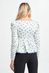 Bawełniana bluzka marki Notes du Nord w kolorze złamanej bieli. Na całości kwiecisty wzór. Dekolt w stylu Królowej Anny. Odcinana pod piersiami. Delikatnie bufiaste rękawy z ozdobnym drapowaniem. Dół wykończony niebieskim ażurem. Zapinana za pomocą zamka na plecach. Fason typu regular.