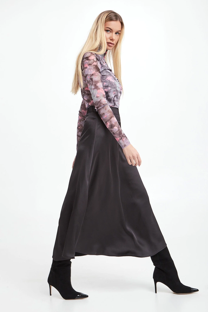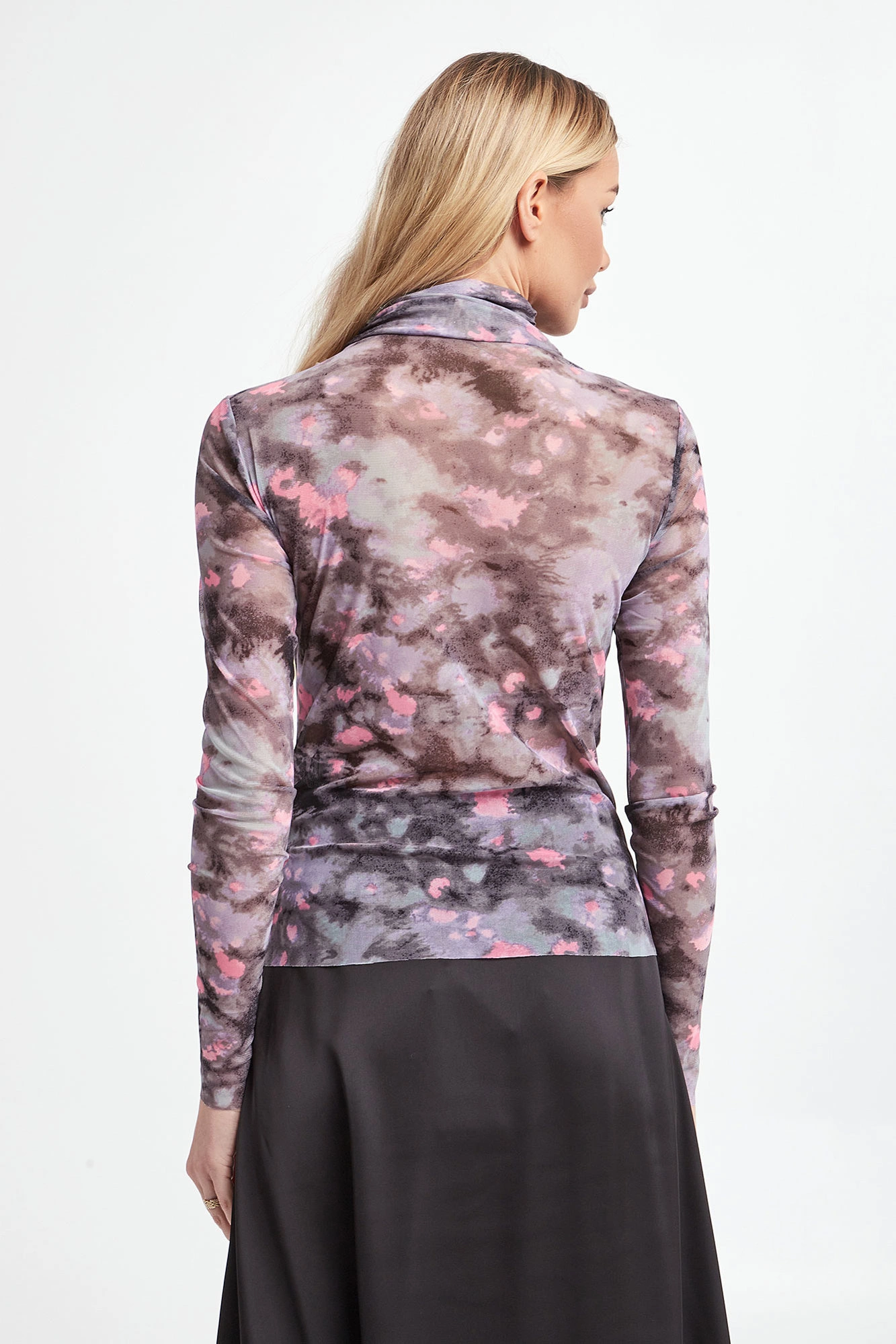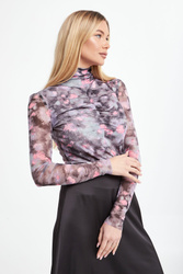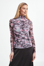 Bluzka marki Notes Du Nord. Na całości wielokolorowy wzór. Model z golfem i drapowaniem. Wykonana z transparentnego materiału. Bardzo elastyczna.