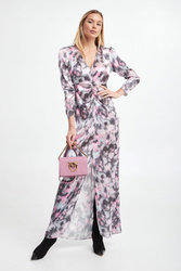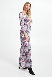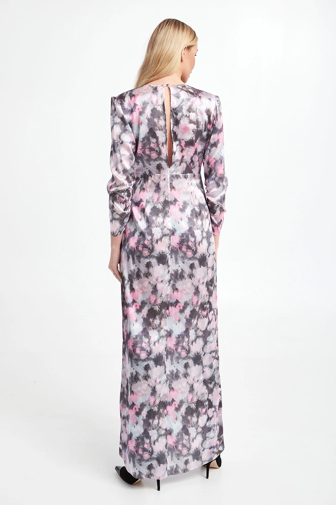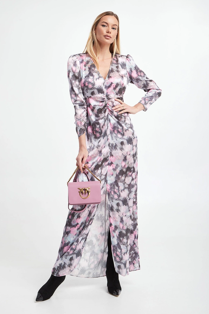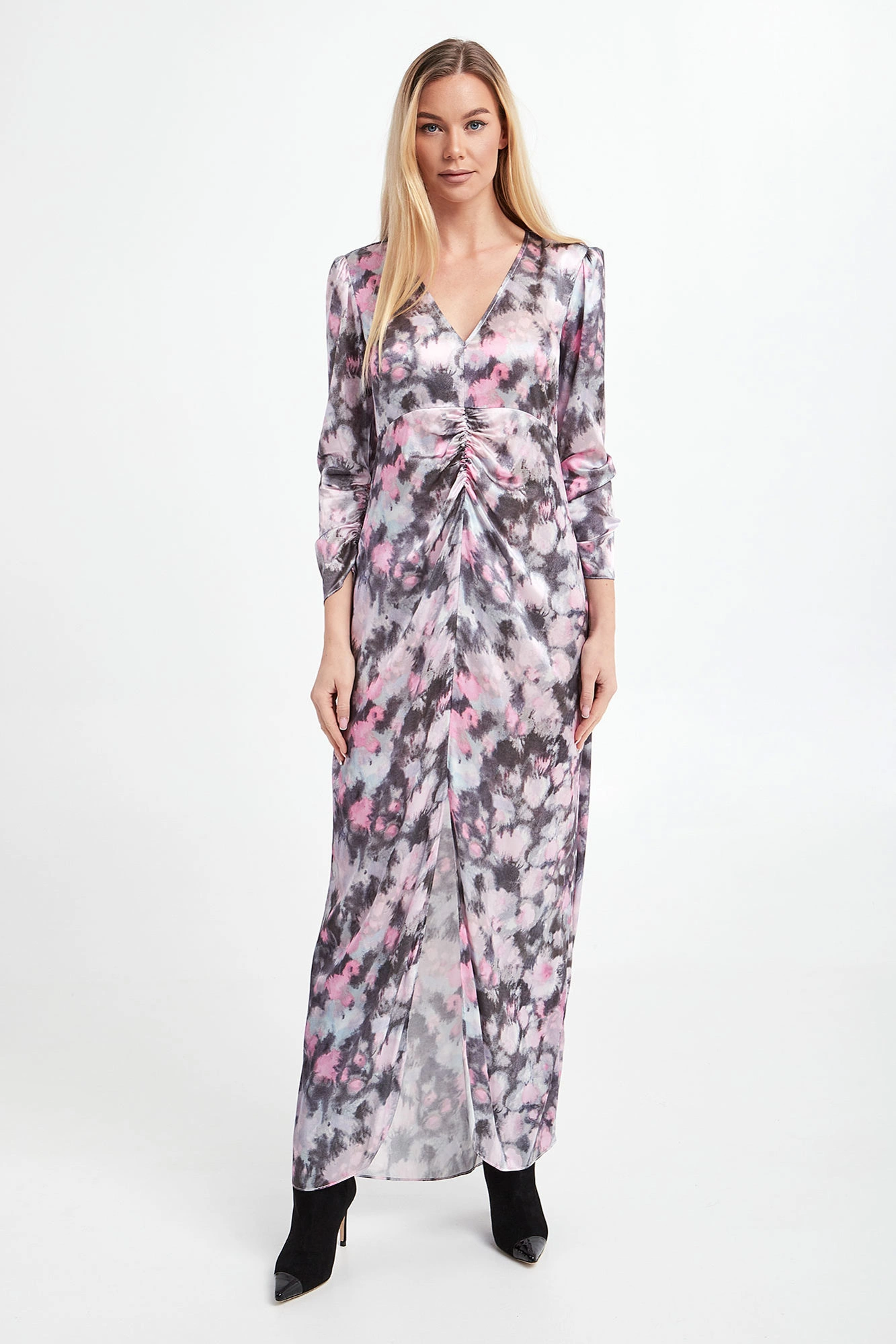 Jedwabna sukienka marki Notes Du Nord w wielokolorowy, pastelowy wzór. Dekolt w kształcie v-neck. Model z głębokim rozcięciem z przodu. Drapowana i odcinana pod linią biustu. Zapinana za pomocą bocznego, niewidocznego zamka. Z tyłu wycięcie na plecach w kształcie łezki. Rękawy o długości 3/4 z drapowaniem i bufkami na ramionach. Fason slim. Długość maxi. Wykonana z jedwabiu.
