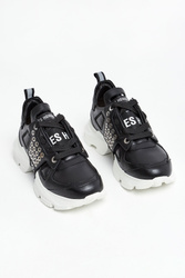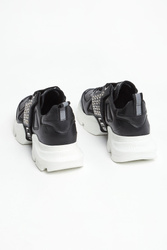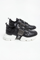 Sneakersy skórzane marki Les Hommes w czarnym kolorze. Wykonane z naturalnej skóry. Wyściółka sygnowana. Wiązane za pomocą sznurówek. Na języku nadruk nazwy marki. W koło elastyczny pas z ozdobnymi dżetami w srebrnym kolorze, przechodzący przez podeszwę, mocowany do buta za pomocą sznurówek i rzep. Wysoka, tłoczona podeszwa w białym kolorze. Z tyłu pętelka ułatwiająca zakładanie. Wyprodukowane we Włoszech.