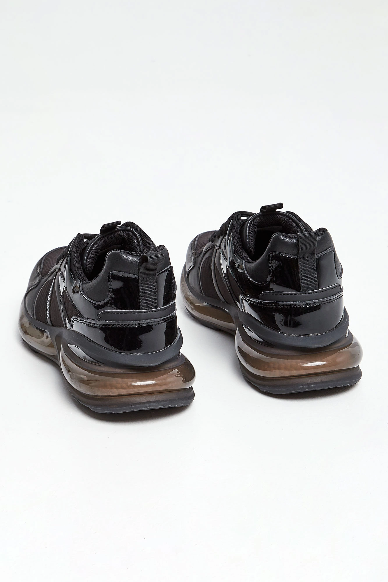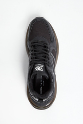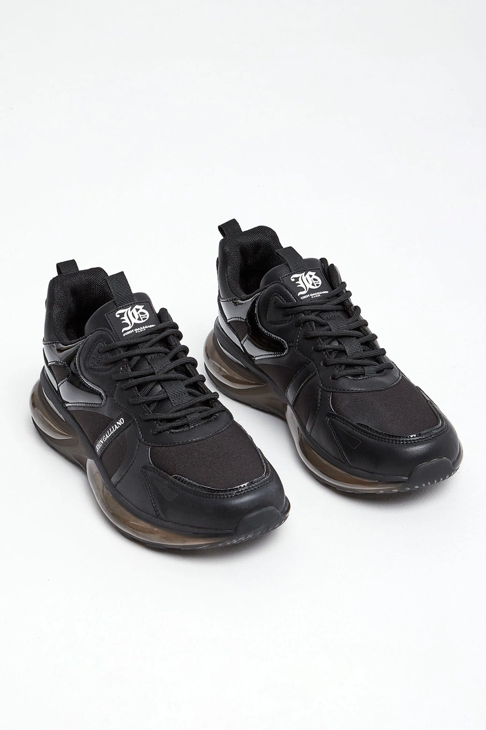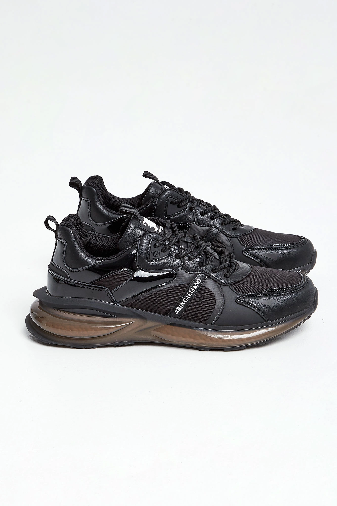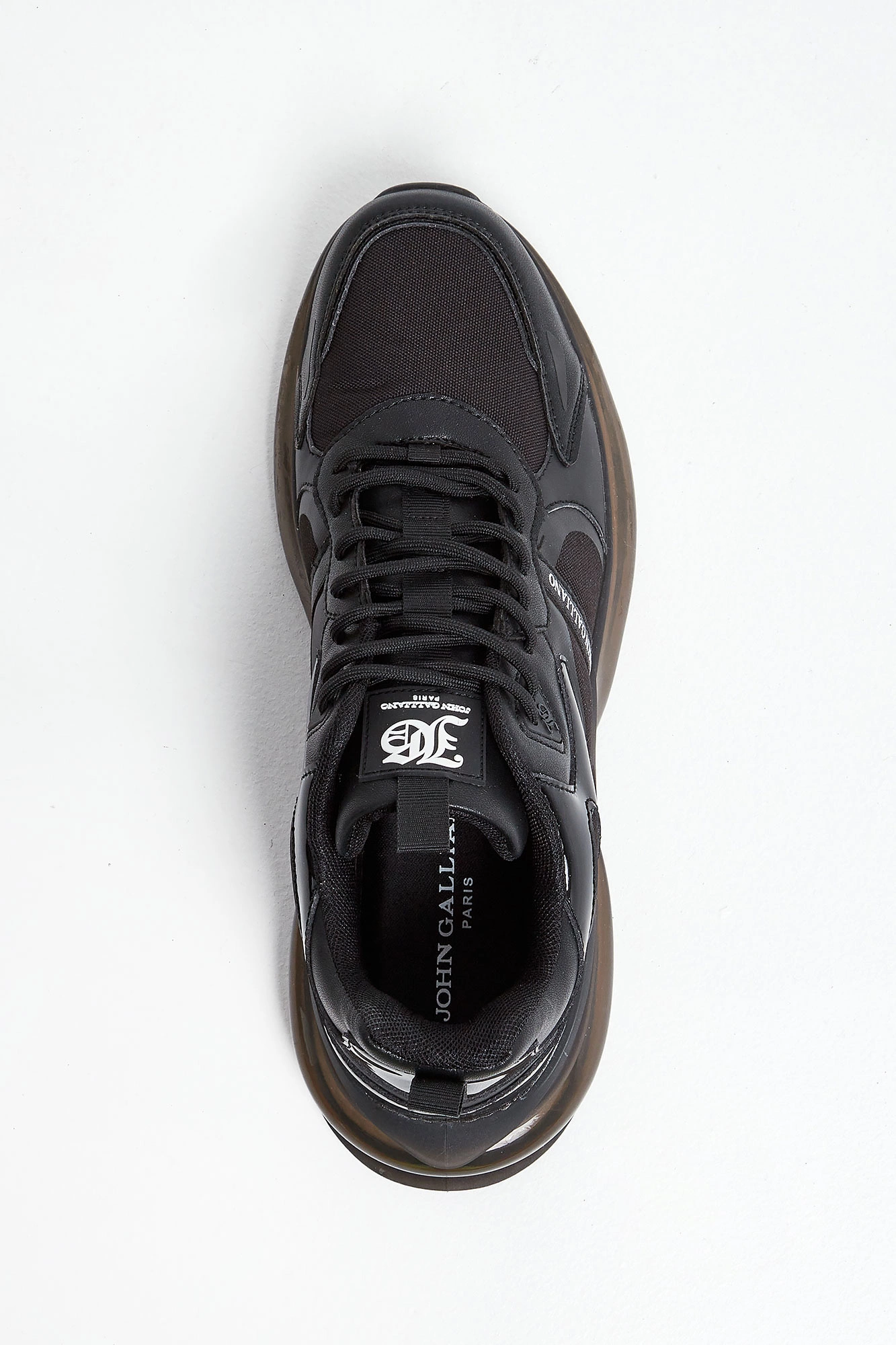 Sneakersy marki John Galliano w czarnym kolorze. Wykonane z gładkiej skóry. Połyskujące wstawki. Na całości ozdobne przeszycia. Po boku biały, kontrastujący nadruk z nazwą marki. Wiązane za pomocą okrągłych sznurówek. Na języku i po bokach gumowana aplikacja z monogramem marki. Z tyłu i na języku pętelki ułatwiające zakładanie. Sygnowana półtransparentna podeszwa. W podeszwie amortyzacja w postaci poduszki powietrznej.
