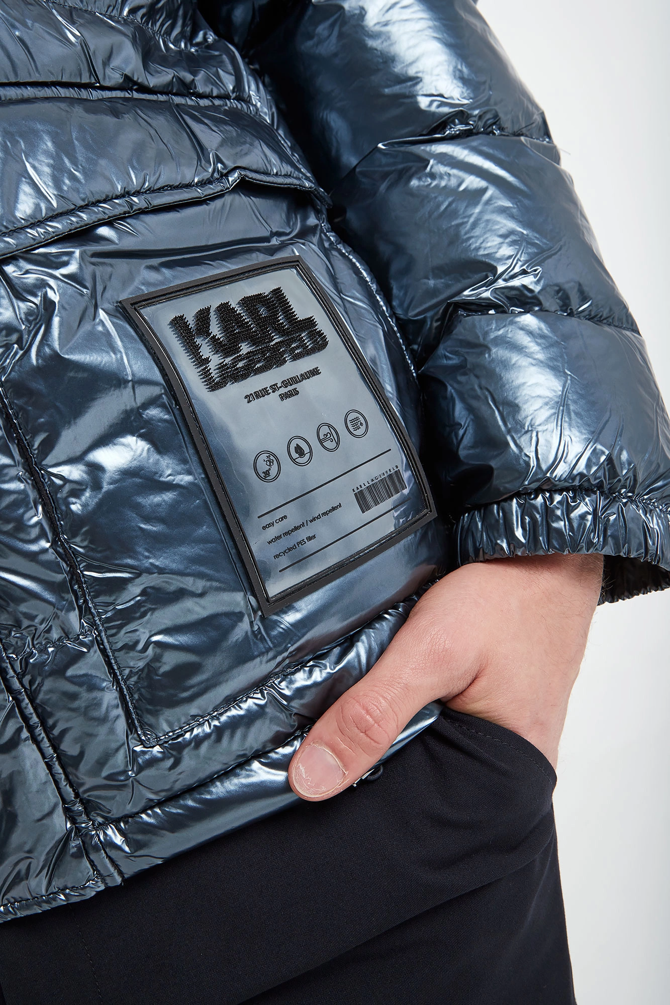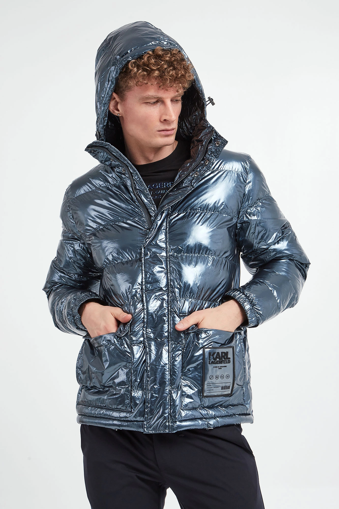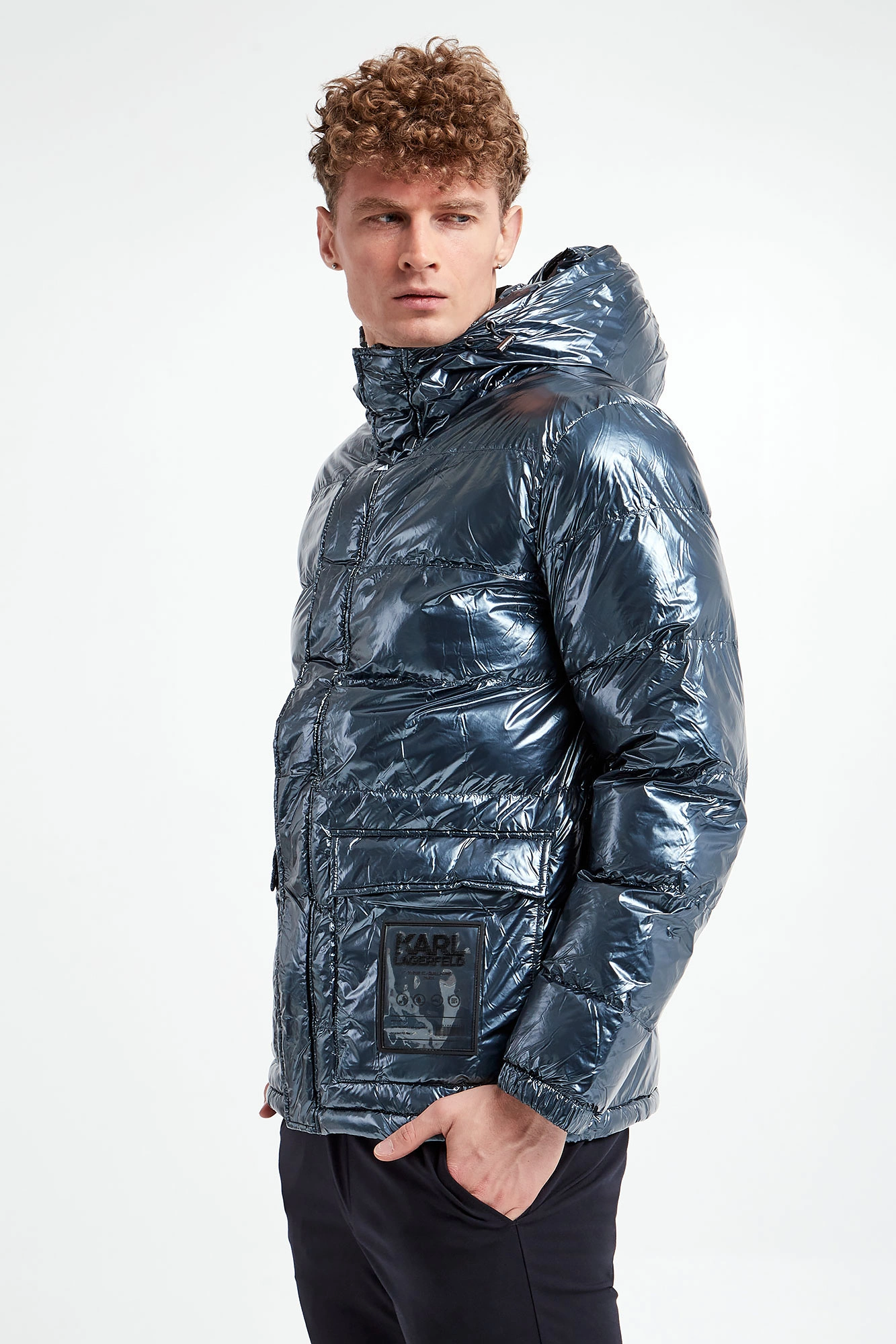 Kurtka z kapturem marki Karl Lagerfeld w niebieskim kolorze. Materiał z metalicznym połyskiem. Na całości poziome pikowania. Syntetyczne wypełnienie. Kaptur regulowany za pomocą troczków ze stoperami. Rękawy wykończone wąskim ściągaczem. Model z czterema zamykanymi kieszeniami. Wsuwane, otwarte kieszenie oraz zamykane na zatrzask kieszenie z patkami. Na kieszeni gumowa transparentna metka z czarnymi nadrukami i nazwą marki. Wewnątrz dwie dodatkowe kieszenie na suwak. Dół kurtki regulowany. Fason typu regular.