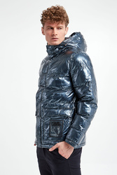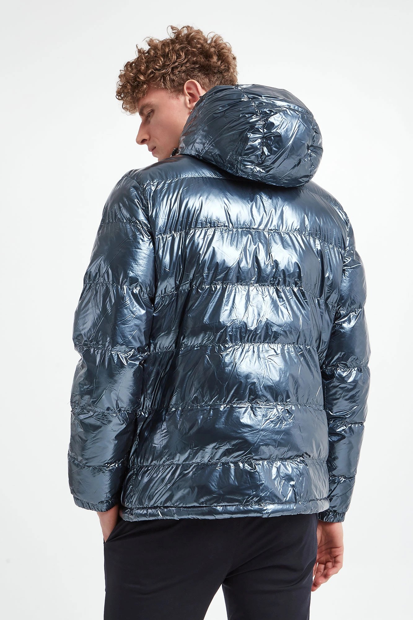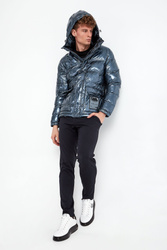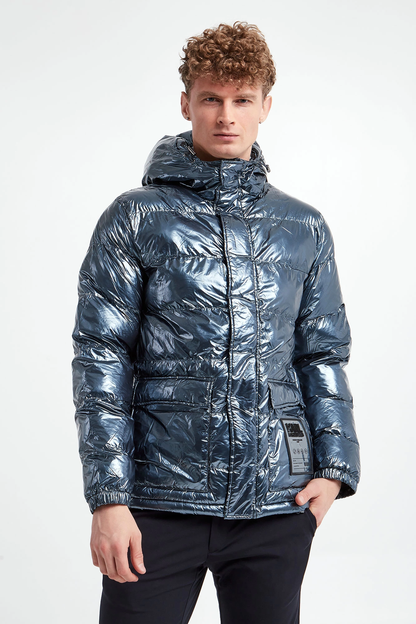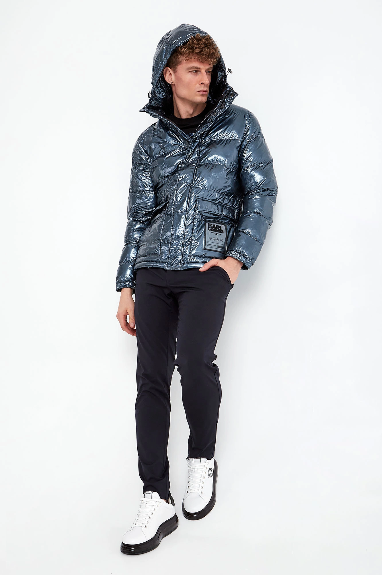 Kurtka z kapturem marki Karl Lagerfeld w niebieskim kolorze. Materiał z metalicznym połyskiem. Na całości poziome pikowania. Syntetyczne wypełnienie. Kaptur regulowany za pomocą troczków ze stoperami. Rękawy wykończone wąskim ściągaczem. Model z czterema zamykanymi kieszeniami. Wsuwane, otwarte kieszenie oraz zamykane na zatrzask kieszenie z patkami. Na kieszeni gumowa transparentna metka z czarnymi nadrukami i nazwą marki. Wewnątrz dwie dodatkowe kieszenie na suwak. Dół kurtki regulowany. Fason typu regular.
