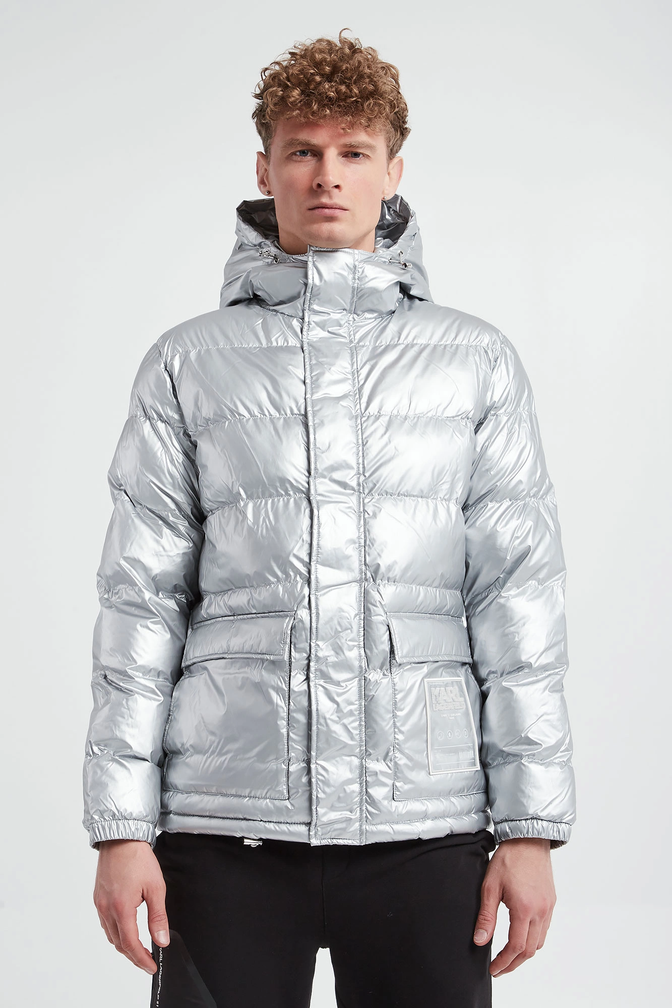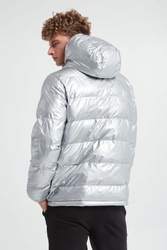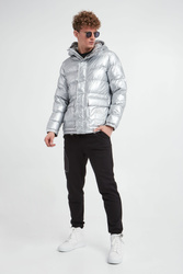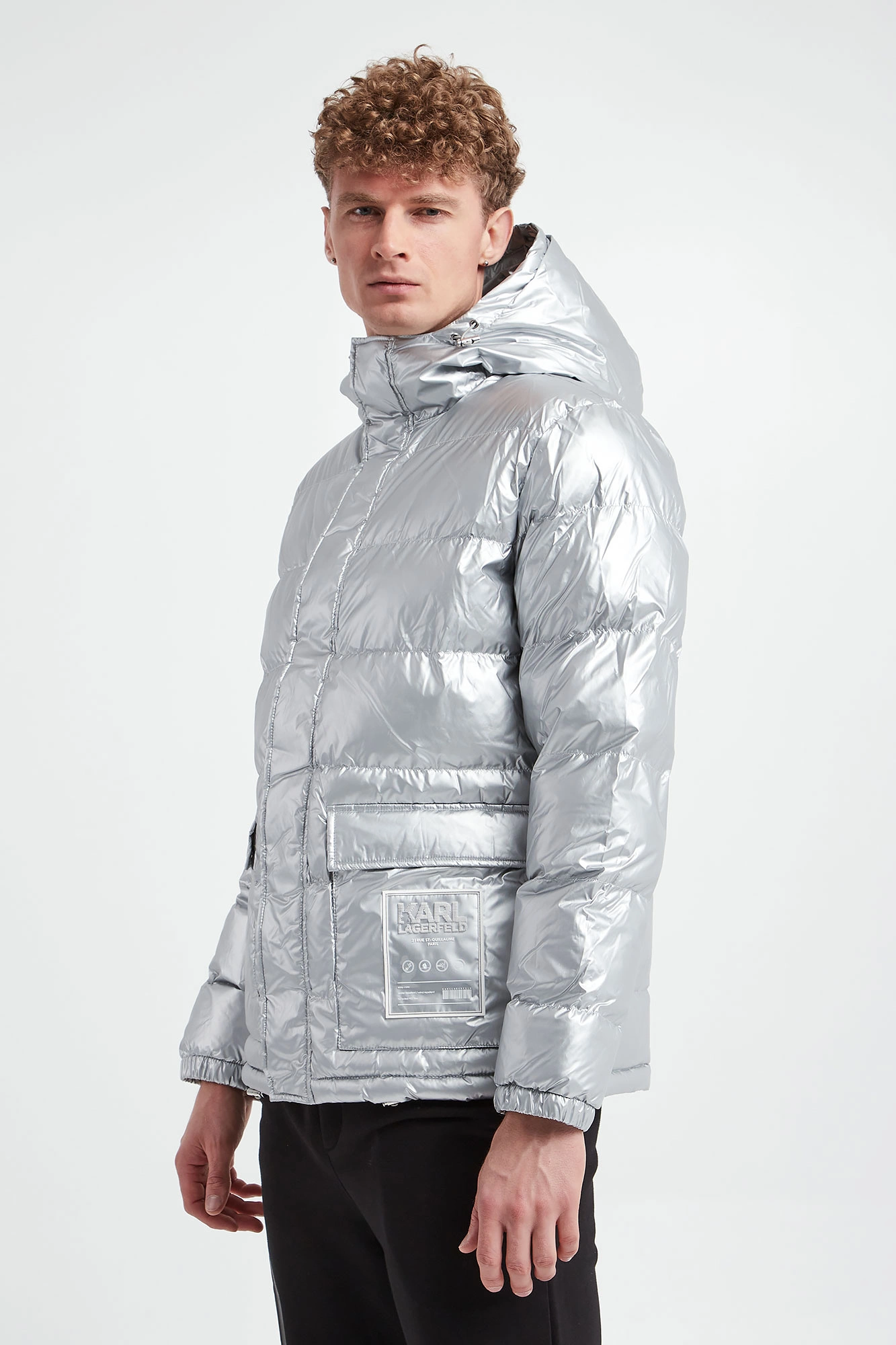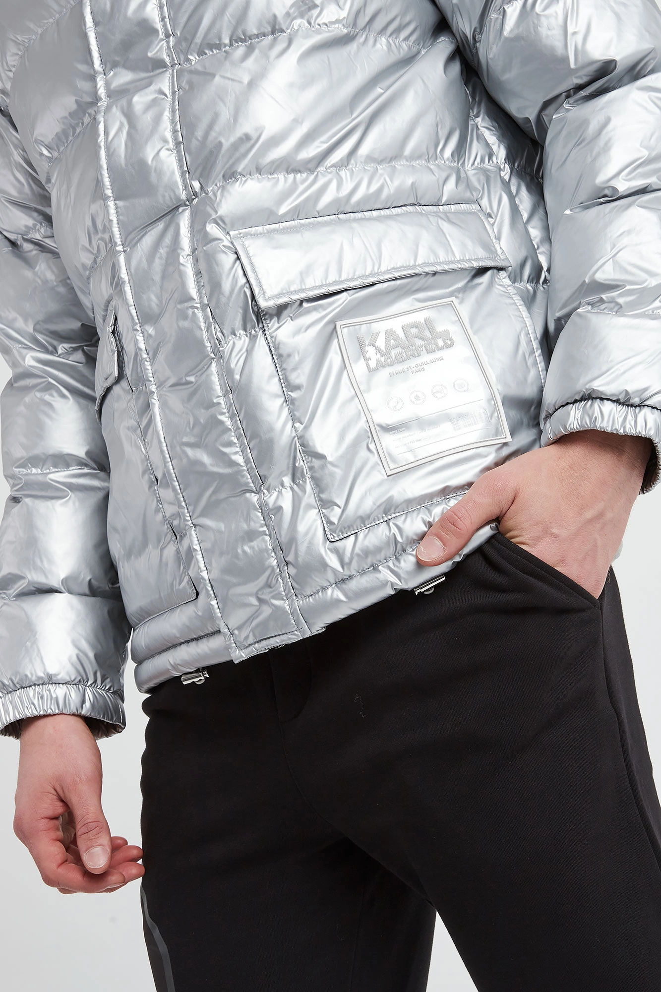 Kurtka z kapturem marki Karl Lagerfeld w srebrnym kolorze. Materiał z matowym połyskiem. Na całości poziome pikowania. Syntetyczne wypełnienie. Kaptur regulowany za pomocą troczków ze stoperami. Rękawy wykończone wąskim ściągaczem. Model z czterema zamykanymi kieszeniami. Wsuwane, otwarte kieszenie oraz zamykane na zatrzask kieszenie z patkami. Na kieszeni gumowa transparentna metka z czarnymi nadrukami i nazwą marki. Wewnątrz dwie dodatkowe kieszenie na suwak. Dół kurtki regulowany. Fason typu regular.