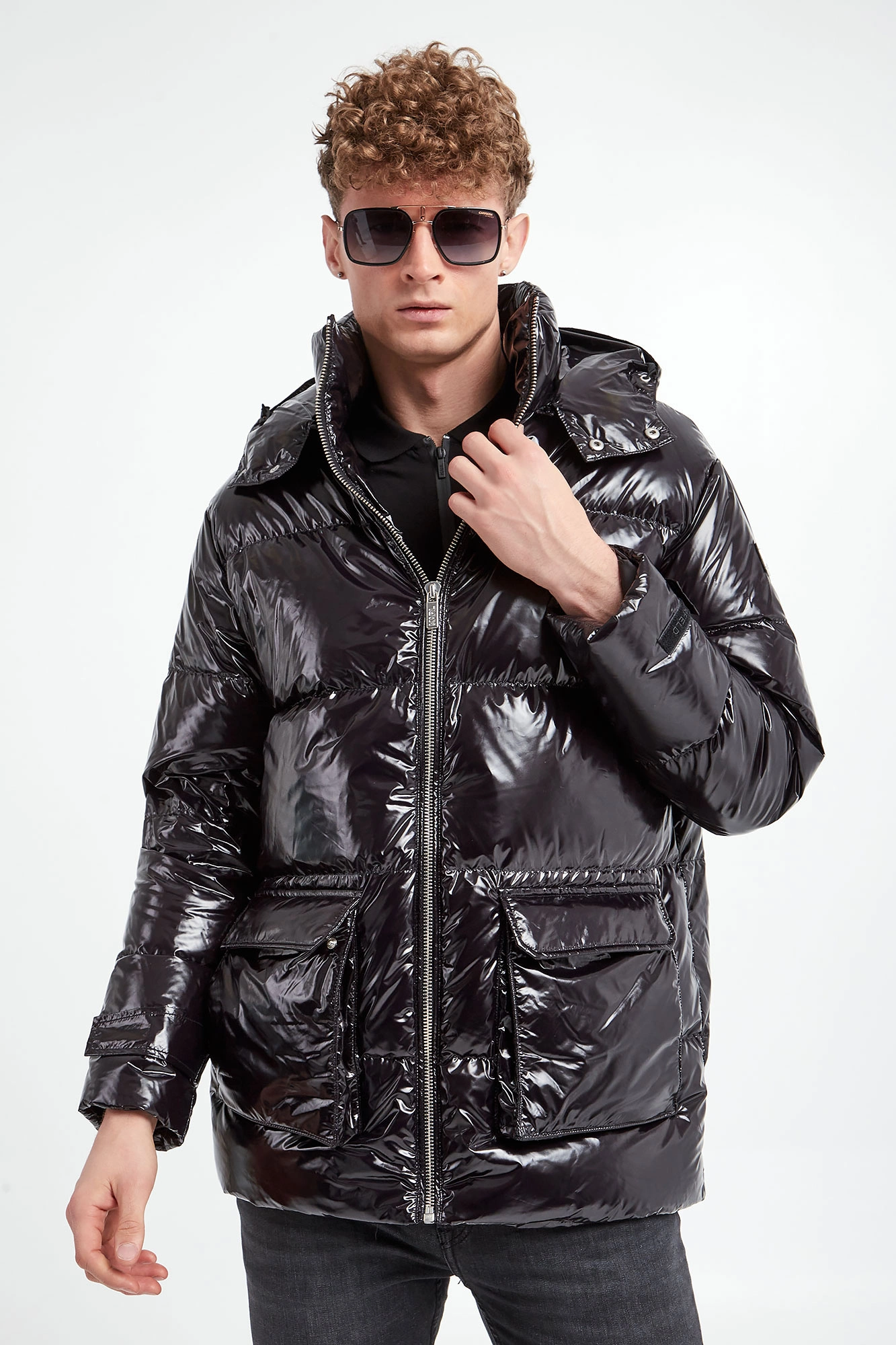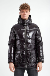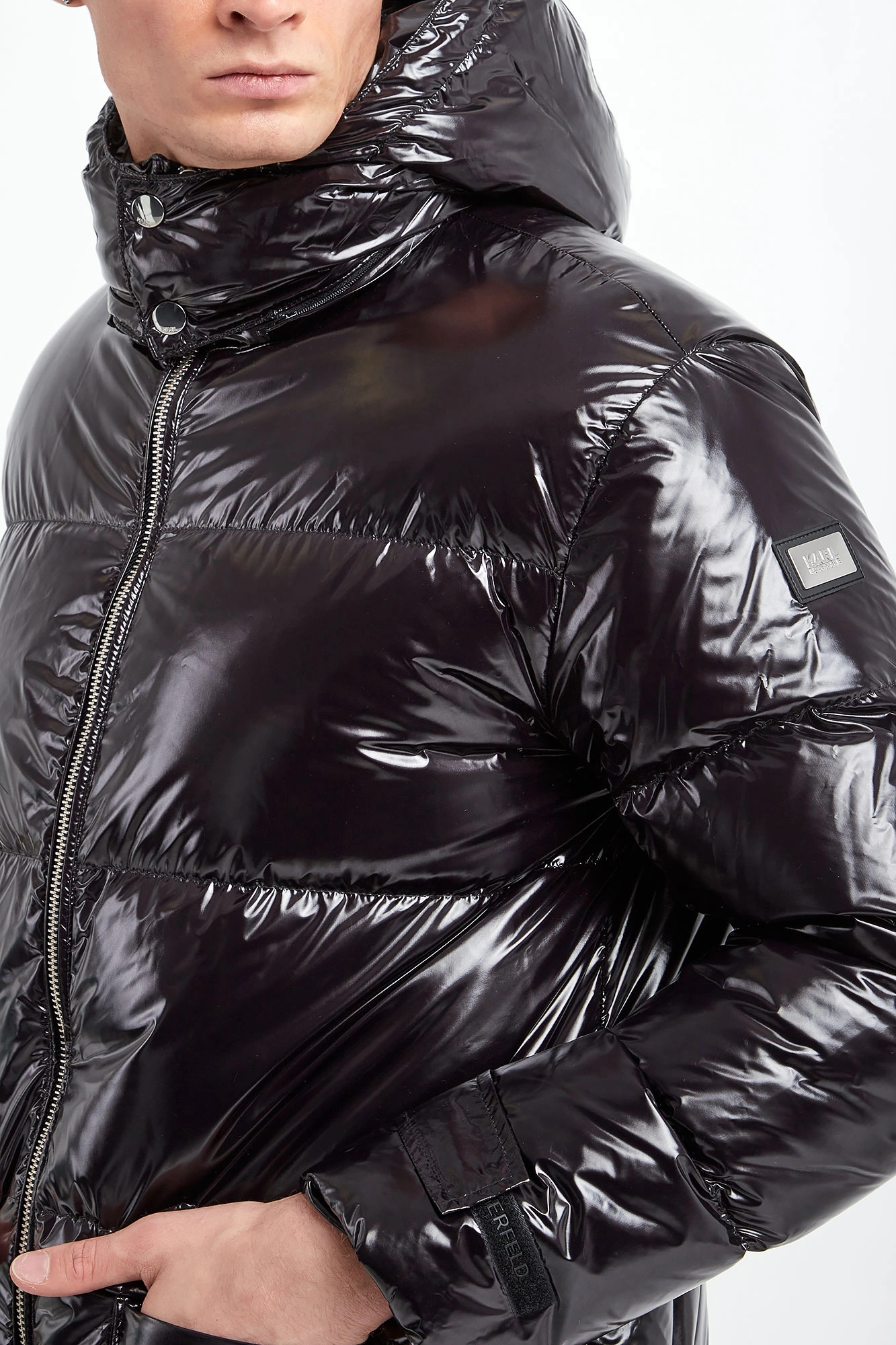 Kurtka puchowa marki Karl Lagerfeld w kolorze czarnym. Naturalne wypełnienie. Model z wysoką stójką i odpinanym kapturem regulowanym za pomocą troczków zakończonych stoperami. Na rękawie naszywka z nazwą marki. Zapinana na dwukierunkowy zamek błyskawiczny i rzepy. Dodatkowa wewnętrzna kieszeń. Długie rękawy zakończone wewnętrznym ściągaczem i regulowane na rzep. Sygnowana podszewka. Fason regular.