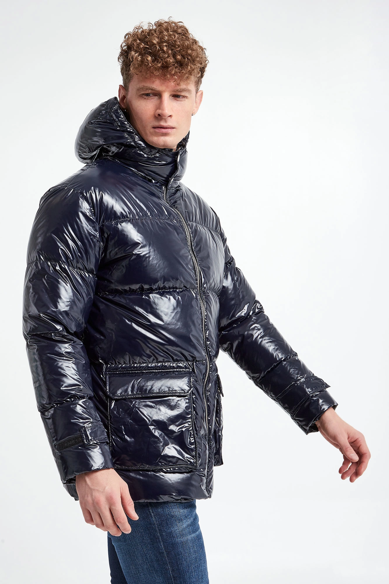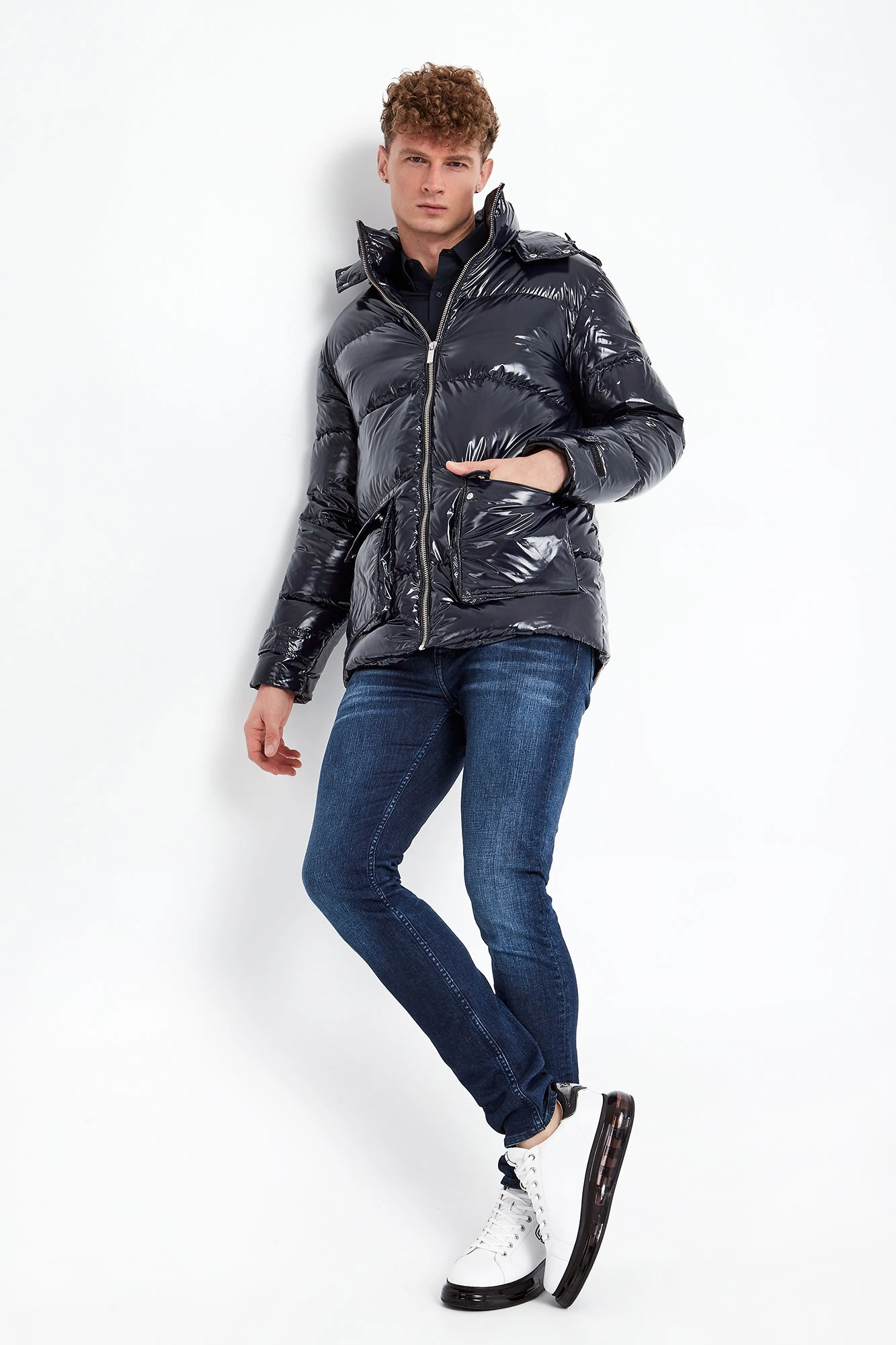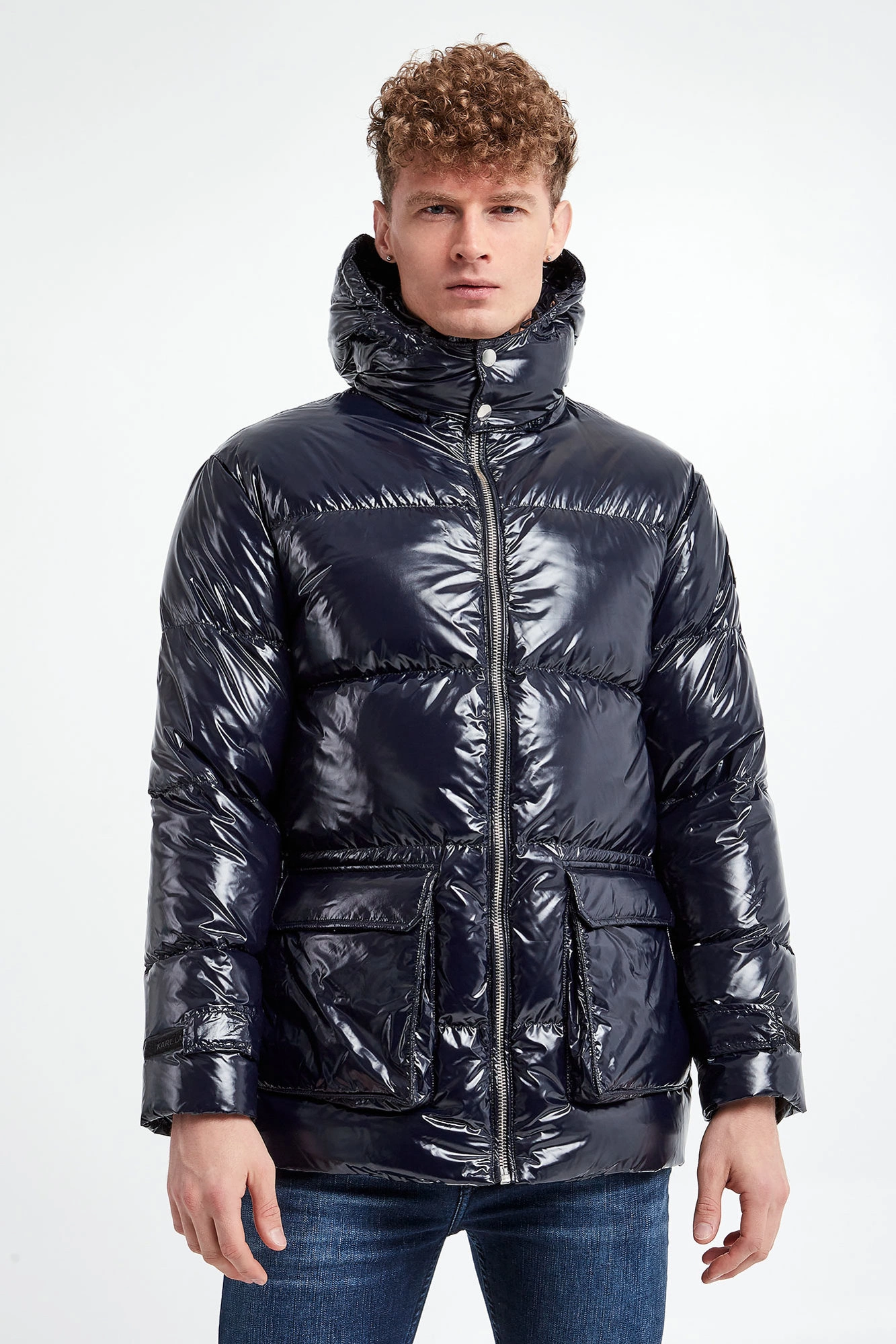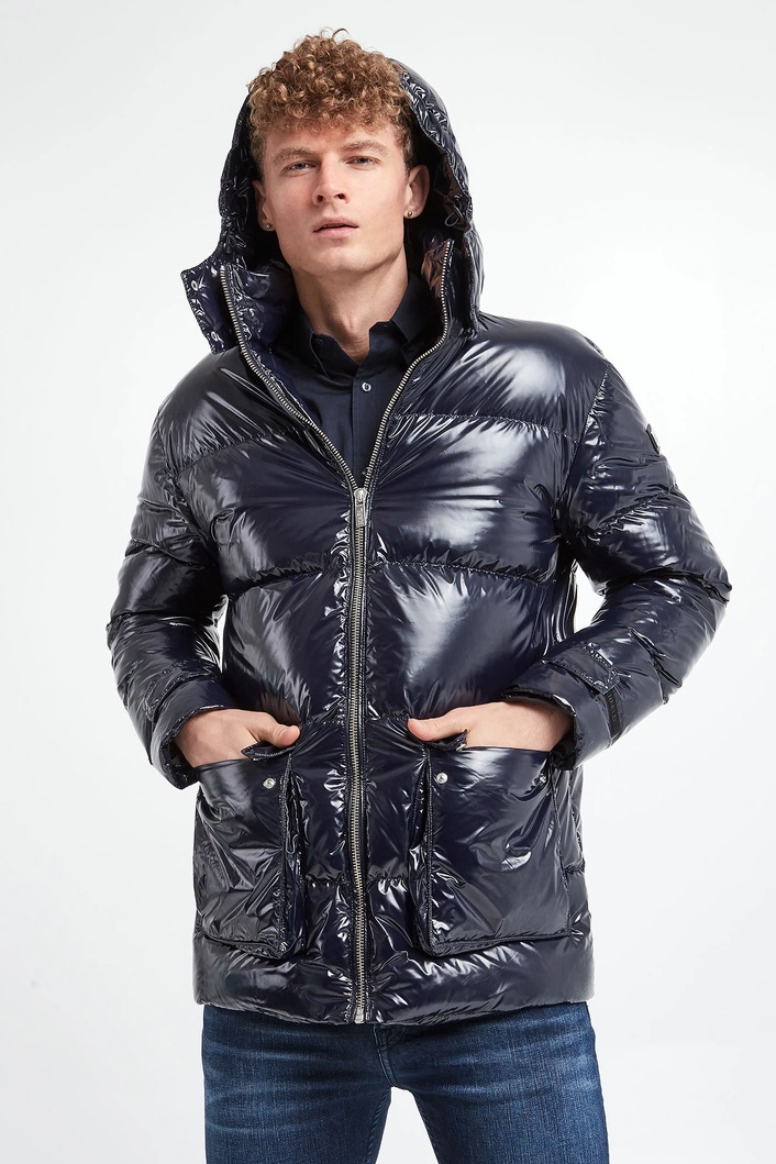 Kurtka puchowa marki Karl Lagerfeld w kolorze grantowym. Naturalne wypełnienie. Na rękawie naszywka z nazwą marki. Model z wysoką stójką i odpinanym kapturem regulowanym za pomocą troczków zakończonych stoperami. Zapinana na dwukierunkowy zamek błyskawiczny i rzepy. Dodatkowa wewnętrzna kieszeń. Długie rękawy zakończone wewnętrznym ściągaczem i regulowane na rzep. Sygnowana podszewka. Fason regular.