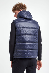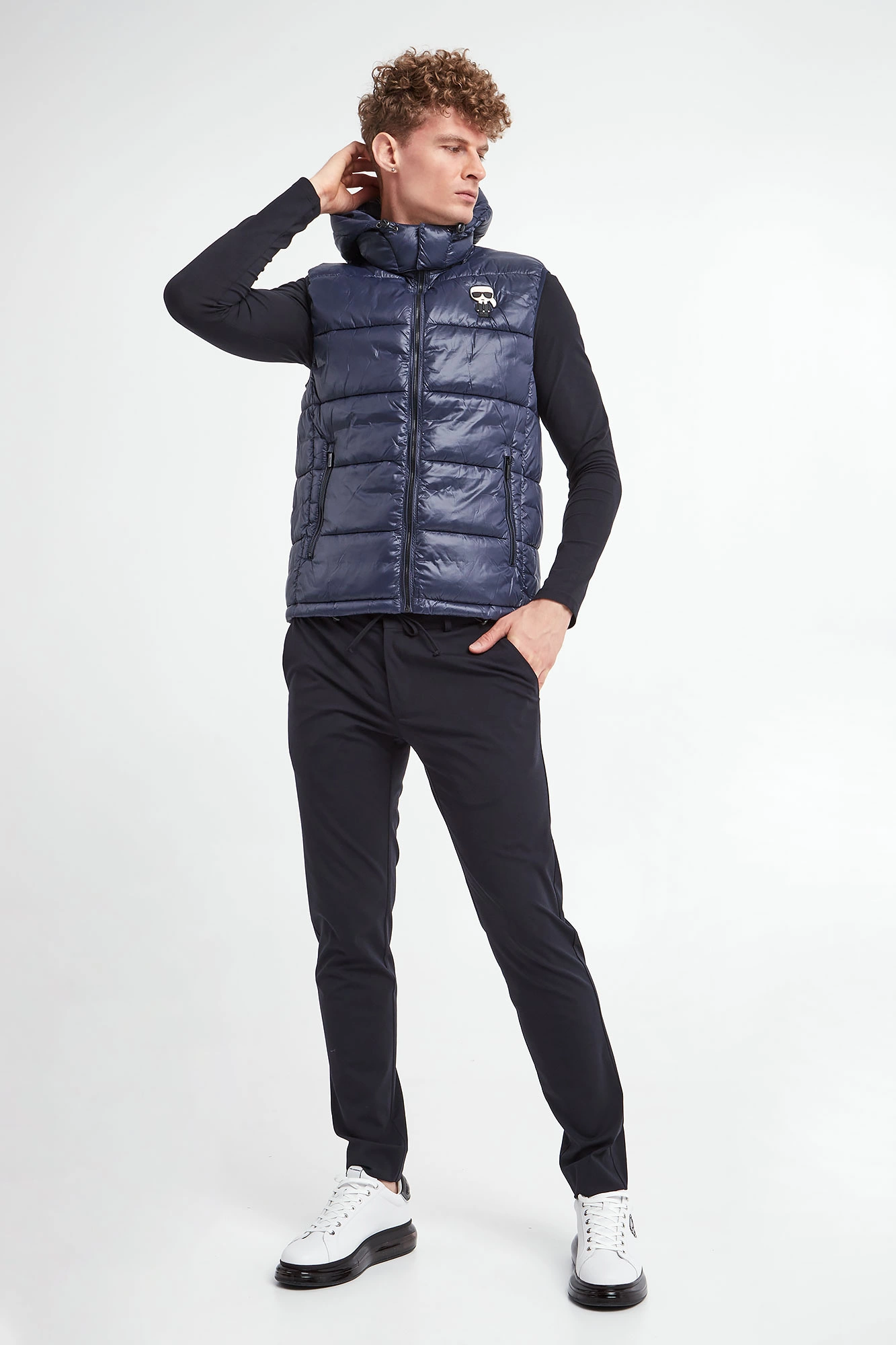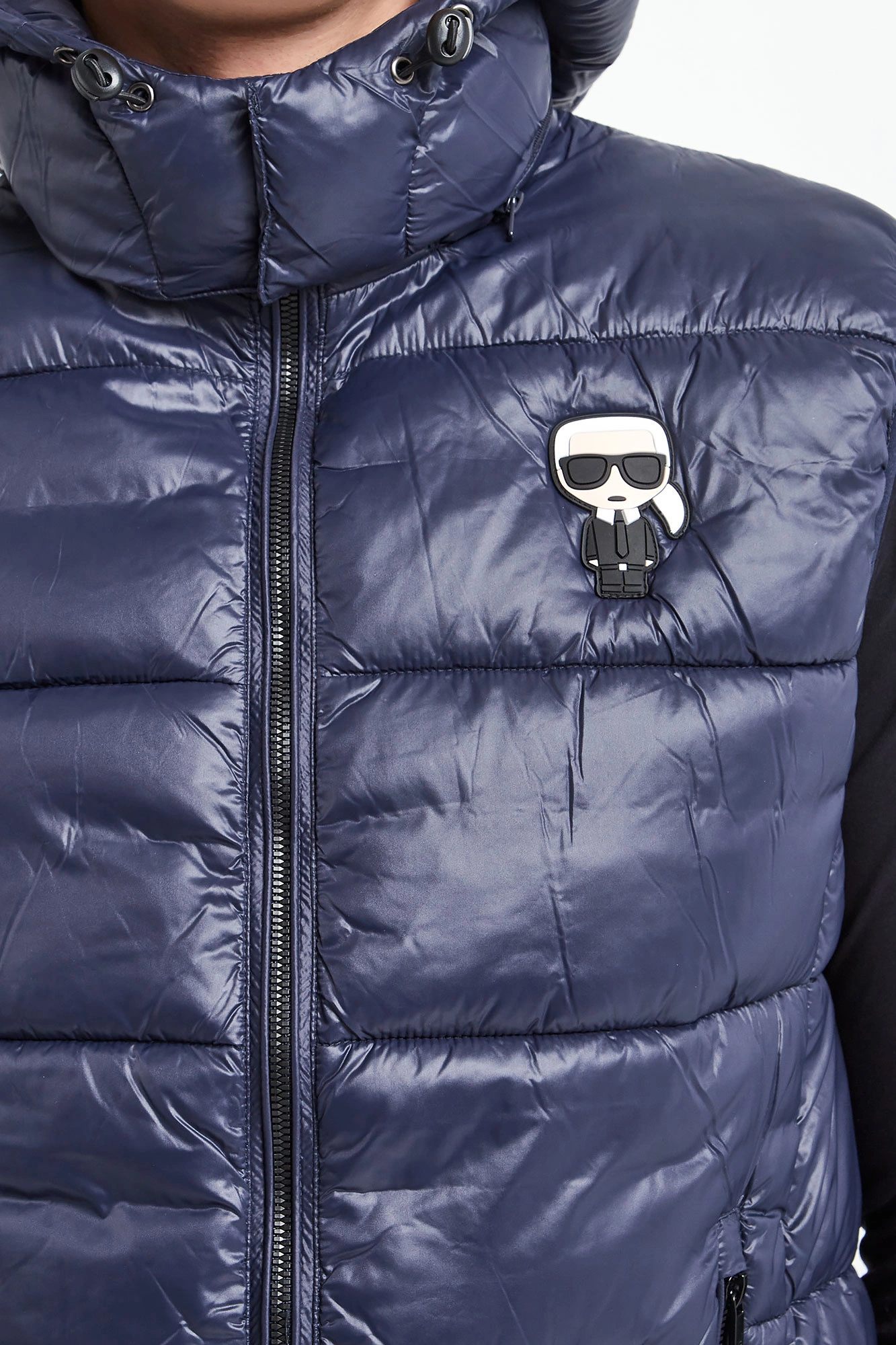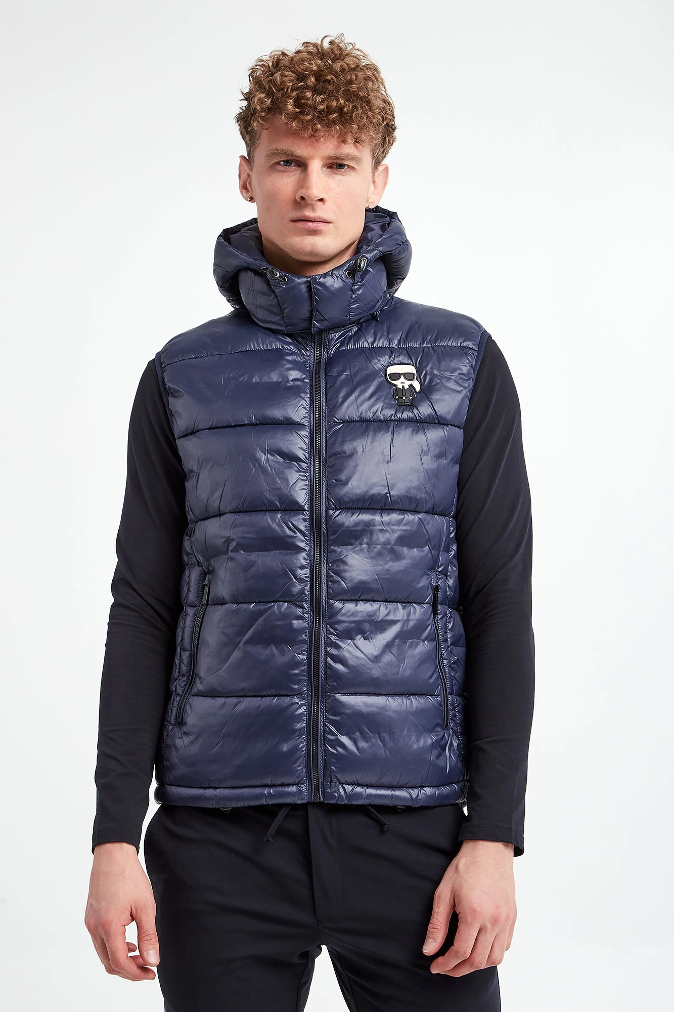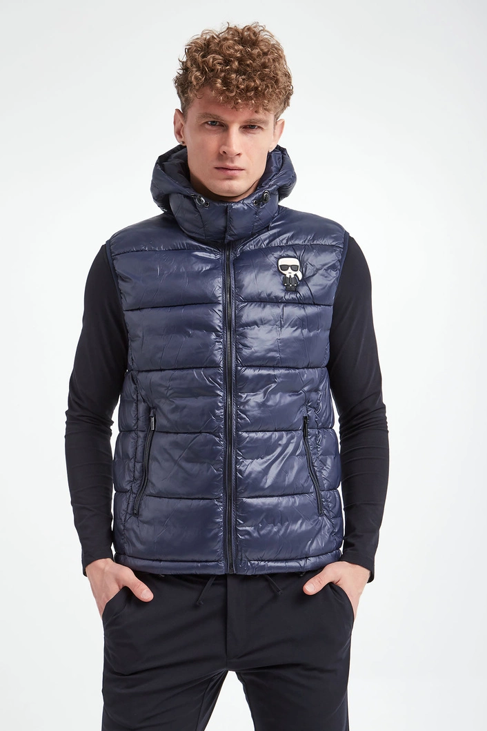 Kamizelka pikowana marki Karl Lagerfeld w kolorze granatowym. Model z odpinanym, regulowanym kapturem. Zapinana na zamek błyskawiczny. Na piersi gumowa aplikacja z logo marki. Dwie boczne kieszenie zapinane na zamek. Ramiona wykończone lamówką. U dołu ściągacz. Fason typu regular. Wykonana z materiałów z recyklingu.