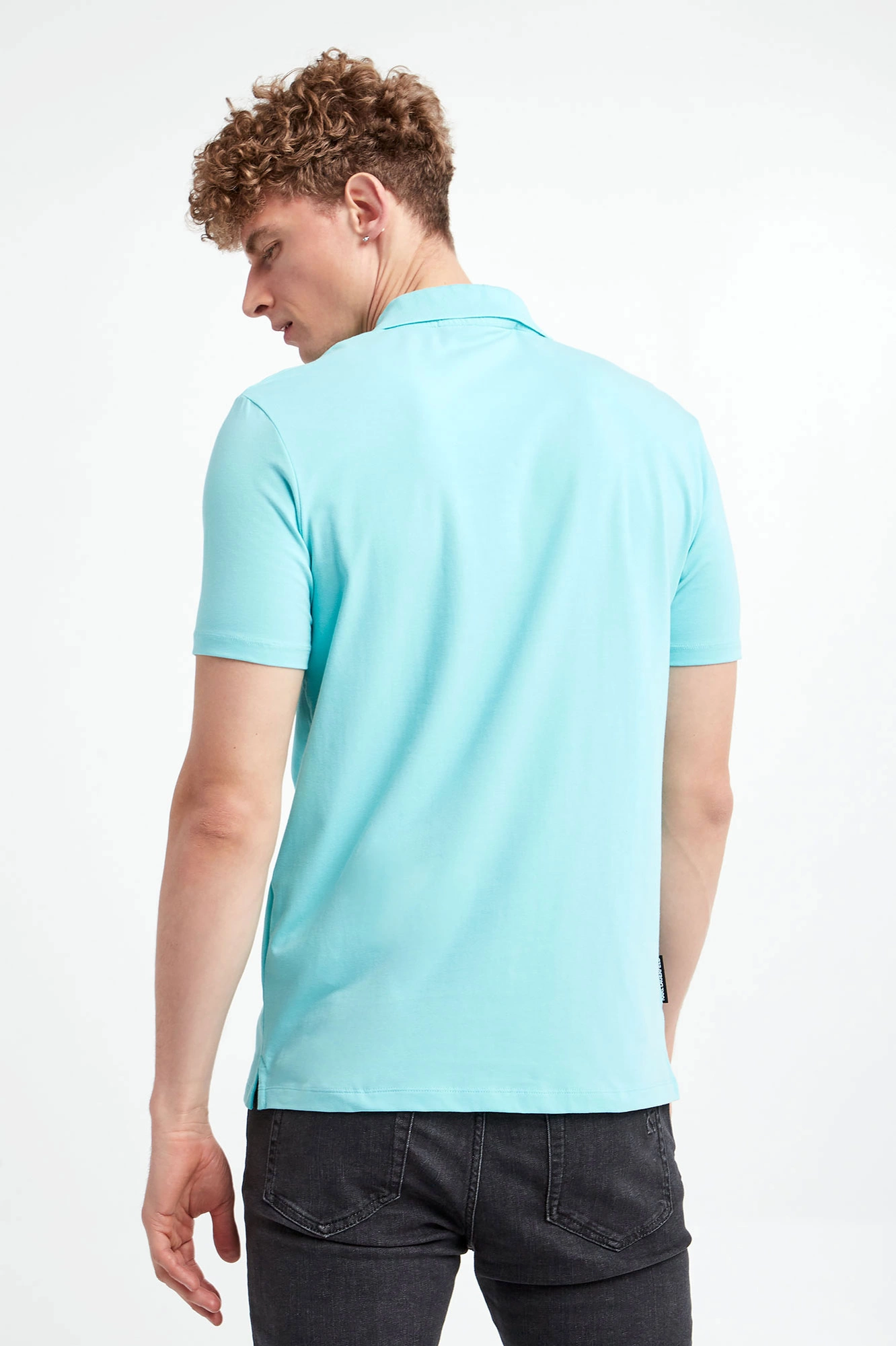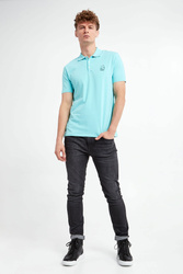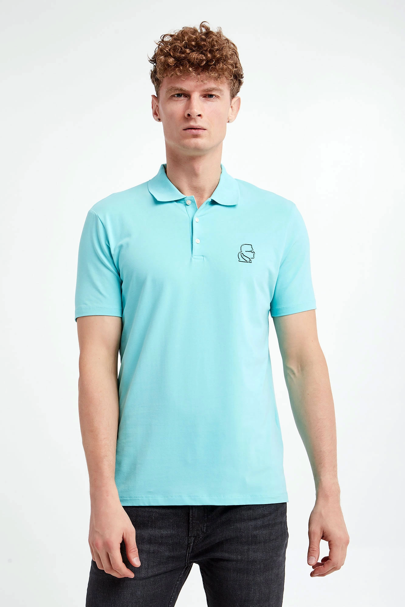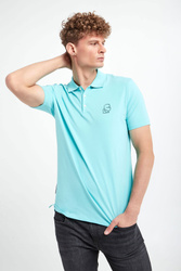 Bawełniane polo marki Karl Lagerfeld w miętowym kolorze. Wykonane z nieco elastycznej bawełny. Model pochodzi z linii "Karl Cares", która wspiera zrównoważoną modę. Zapinane za pomocą sygnowanych guzików. Krótkie rękawy i dół wykończone przeszyciem. Na piersi gumowany nadruk w kształcie postaci założyciela marki. Na dole po bokach rozcięcia. Fason regular.