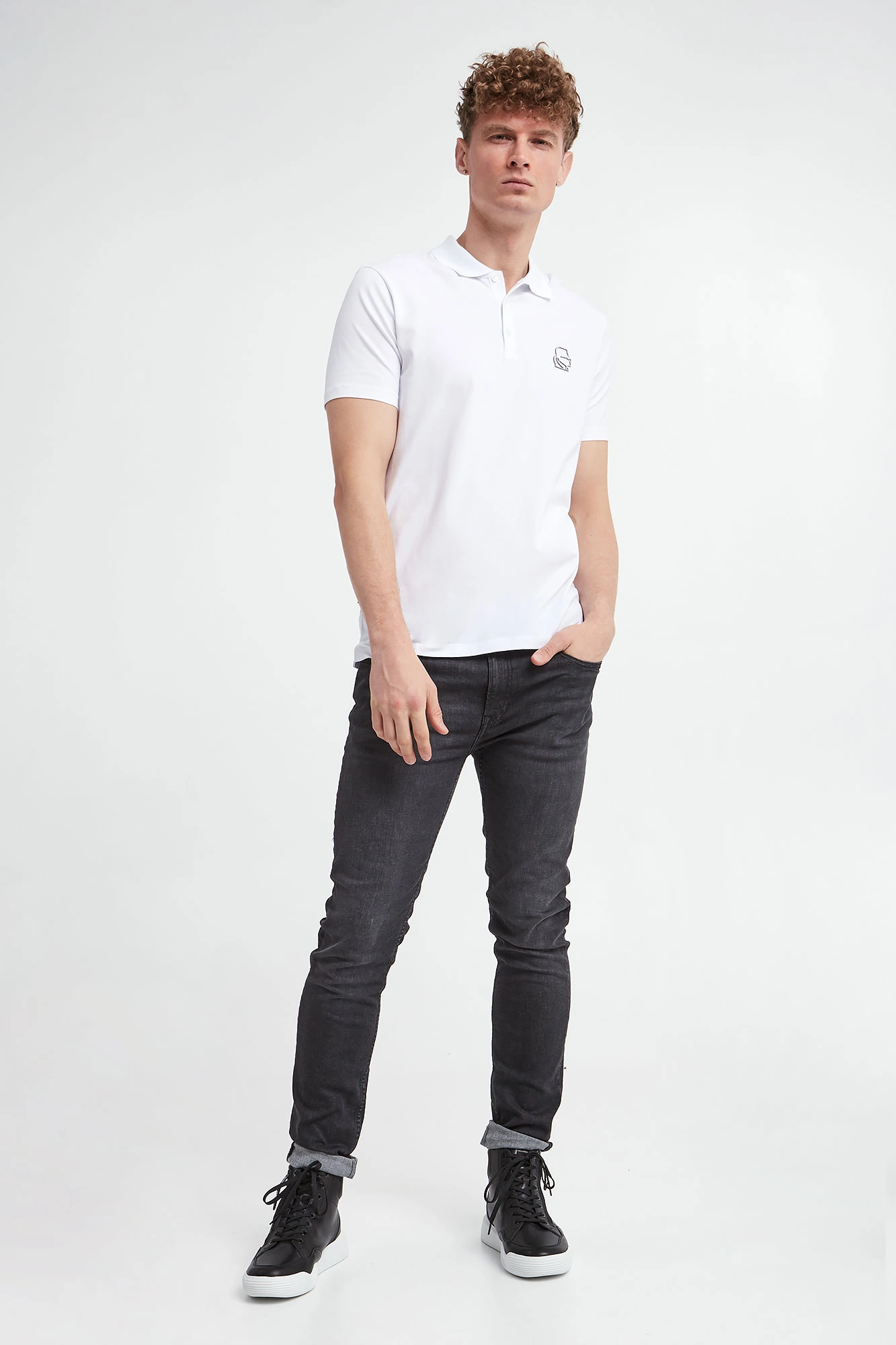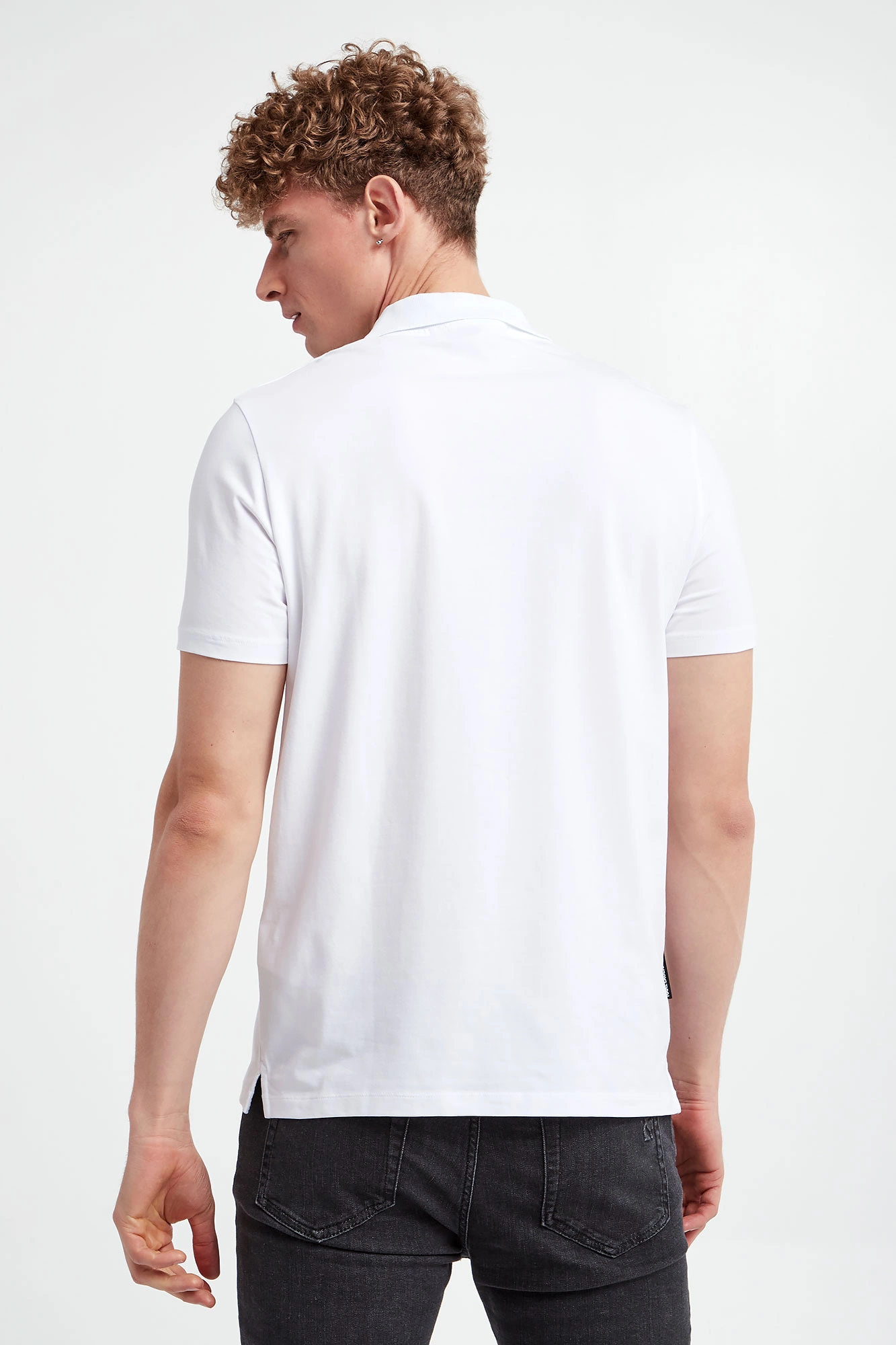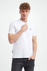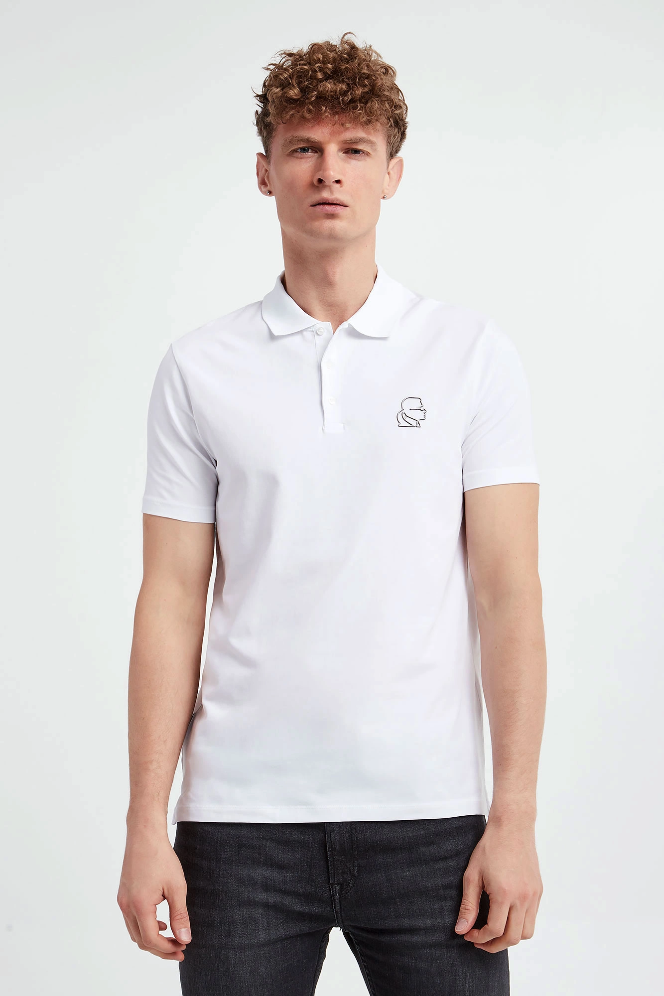 Bawełniane polo marki Karl Lagerfeld w białym kolorze. Wykonane z elastycznej bawełny. Model pochodzi z linii "Karl Cares", która wspiera zrównoważoną modę. Zapinane za pomocą sygnowanych guzików. Krótkie rękawy i dół wykończone przeszyciem. Na piersi gumowany nadruk w kształcie postaci założyciela marki. Na dole po bokach rozcięcia. Fason regular.