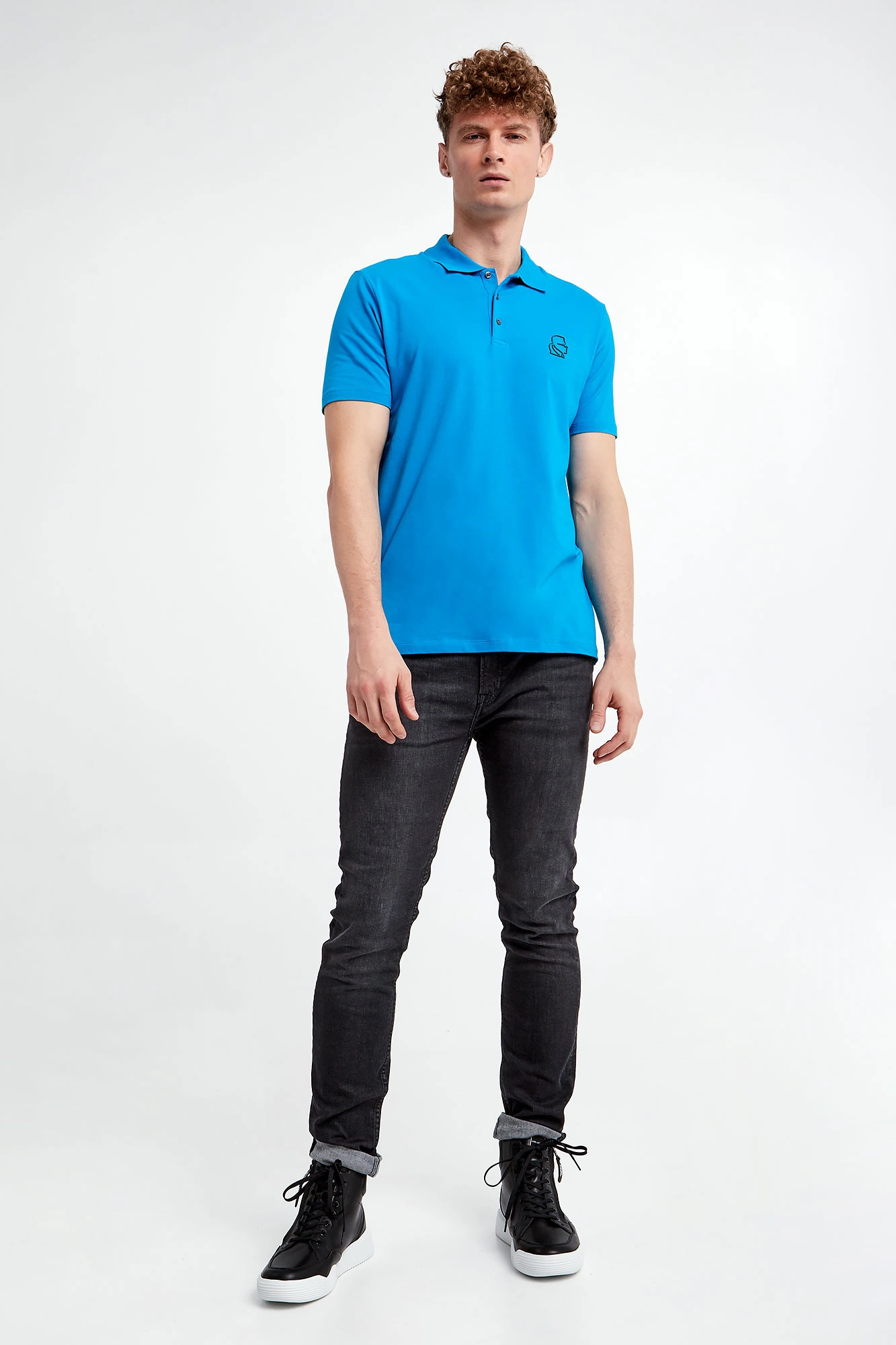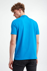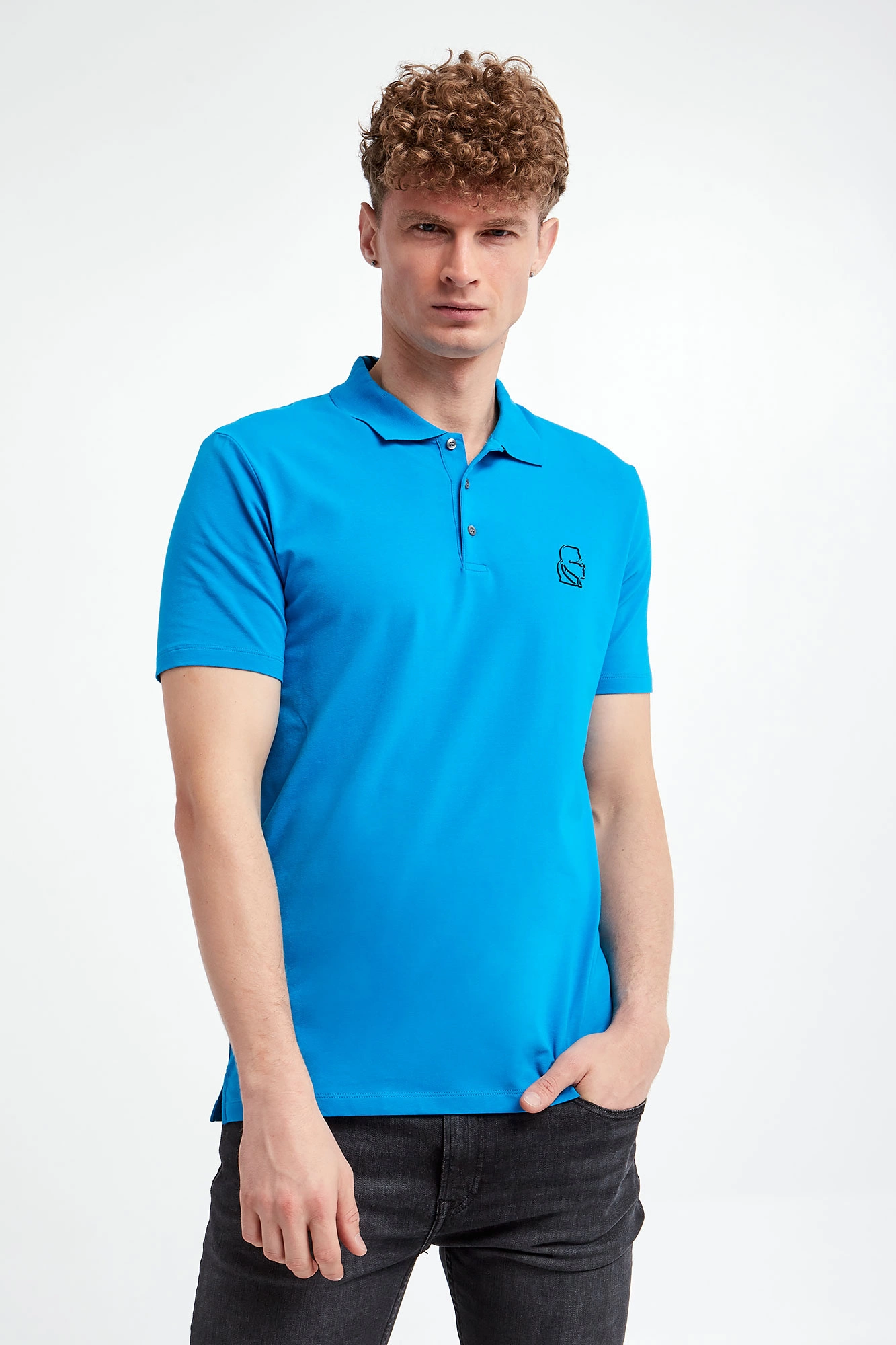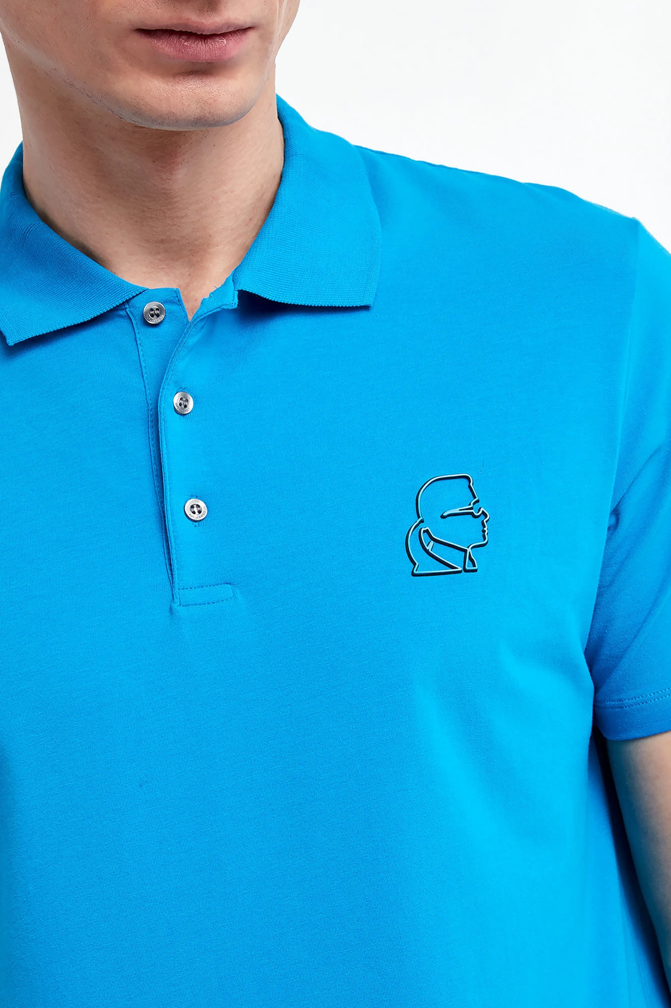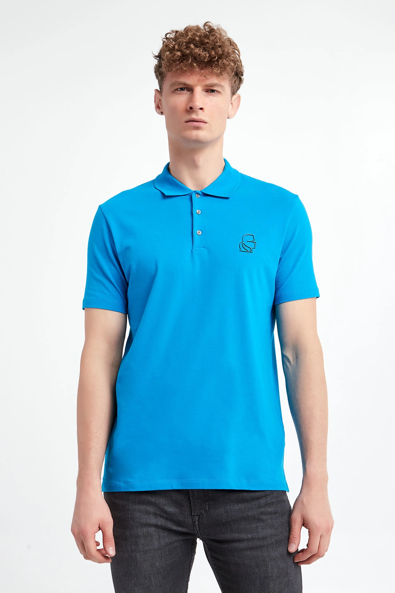 Bawełniane polo marki Karl Lagerfeld w niebieskim kolorze. Wykonane z elastycznej bawełny. Model pochodzi z linii "Karl Cares", która wspiera zrównoważoną modę. Zapinane za pomocą sygnowanych guzików. Krótkie rękawy i dół wykończone przeszyciem. Na piersi gumowany nadruk w kształcie postaci założyciela marki. Na dole po bokach rozcięcia. Fason regular.