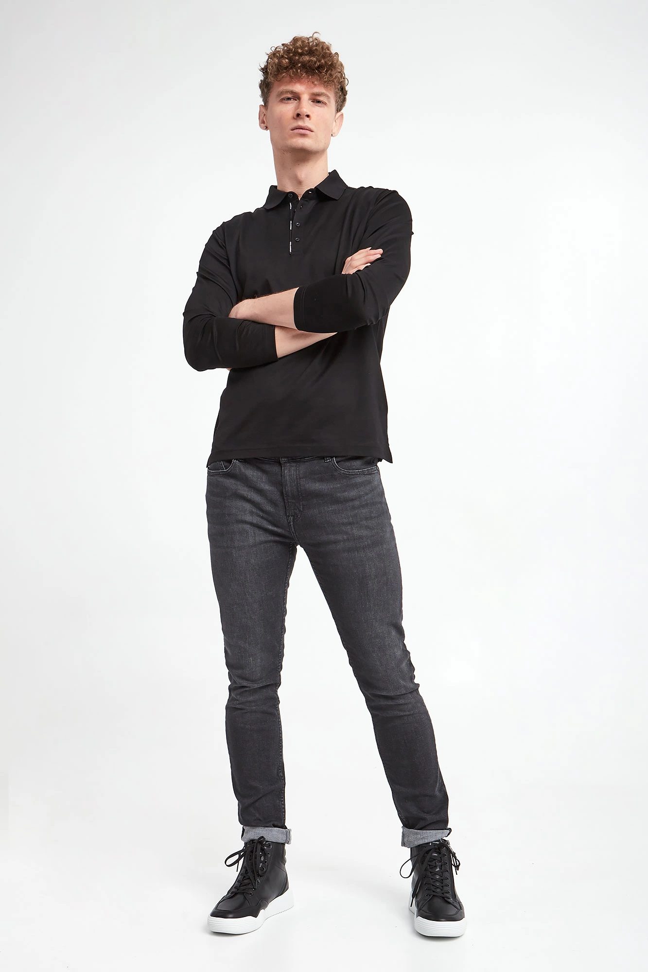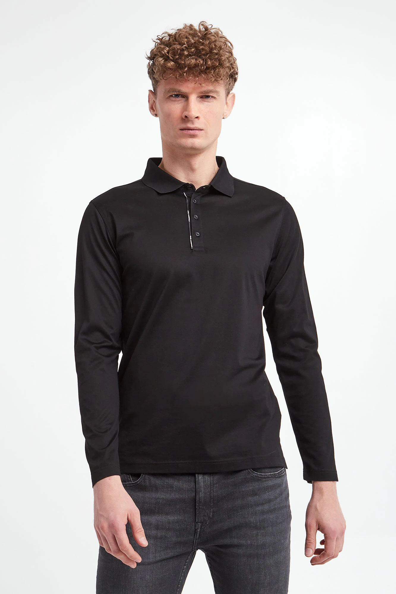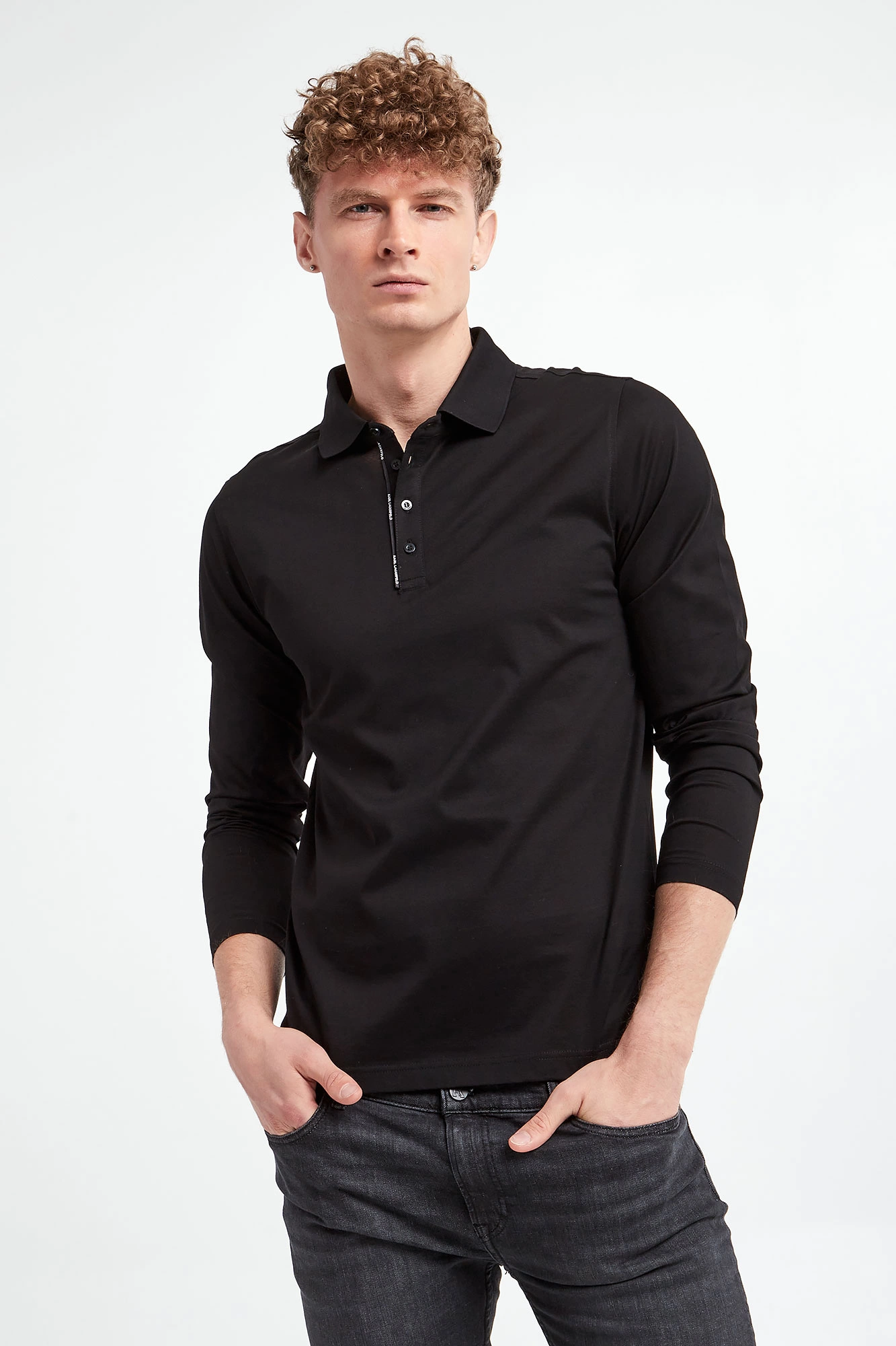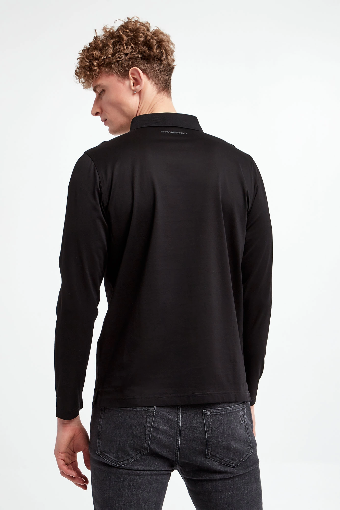 Polo bawełniane marki Karl Lagerfeld w czarnym kolorze. Wykonane ze stuprocentowej bawełny. Model pochodzi z linii "Karl Cares", która wspiera zrównoważoną modę. Zapinane za pomocą sygnowanych guzików. Wzdłuż guzików sygnowana tasiemka. Długie rękawy i dół wykończone przeszyciem. Fason regular.