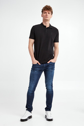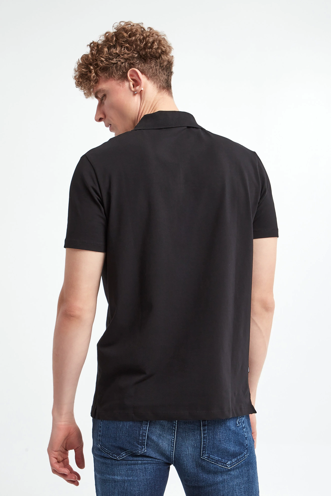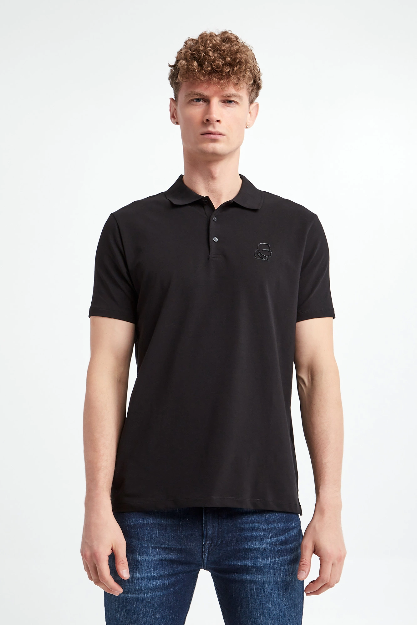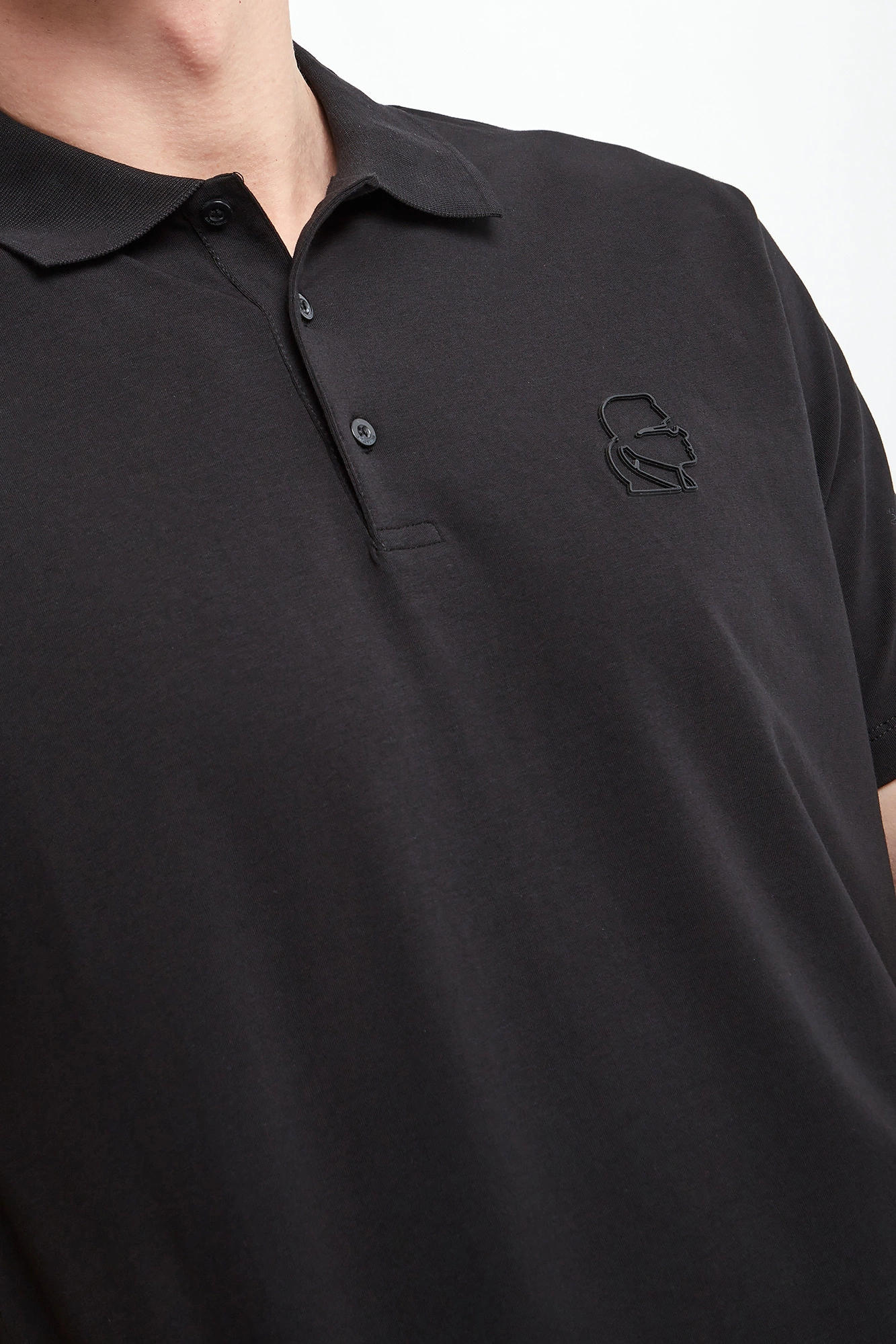 Polo marki Karl Lagerfeld w czarnym kolorze pochodzący z linii "Karl Cares", która wykorzystuje organiczne tkaniny, by wspierać zrównoważoną modę. Wykonane z elastycznej bawełny. Klasyczny kołnierzyk zapinany za pomocą sygnowanych guzików. Na przodzie wypukły, gumowy nadruk tworzący kontury logo marki. Krótkie rękawy. Całość wykończona prostymi przeszyciami. Na dole delikatne boczne wycięcia.