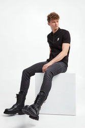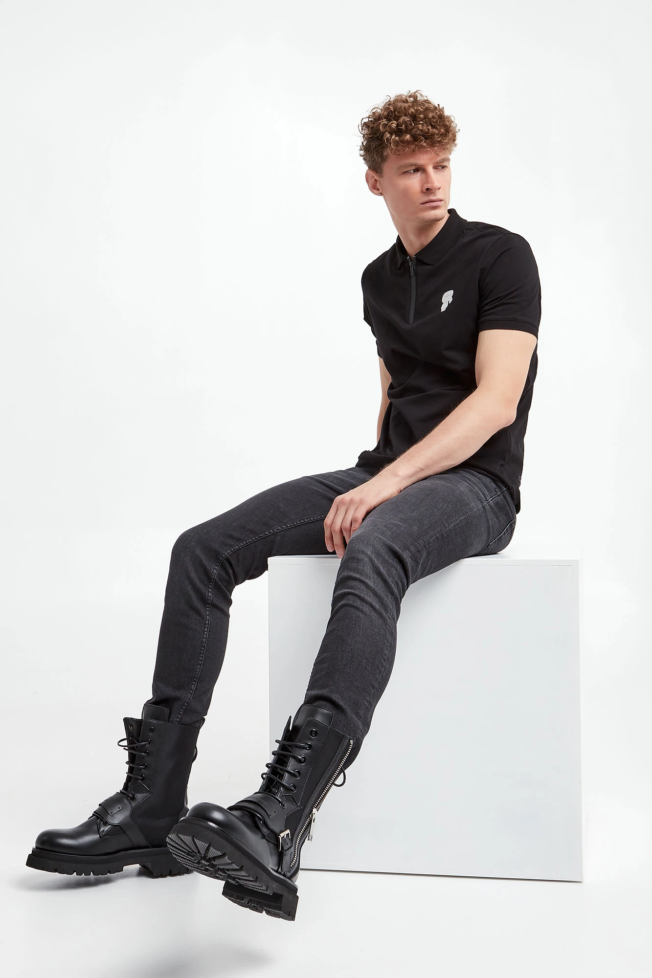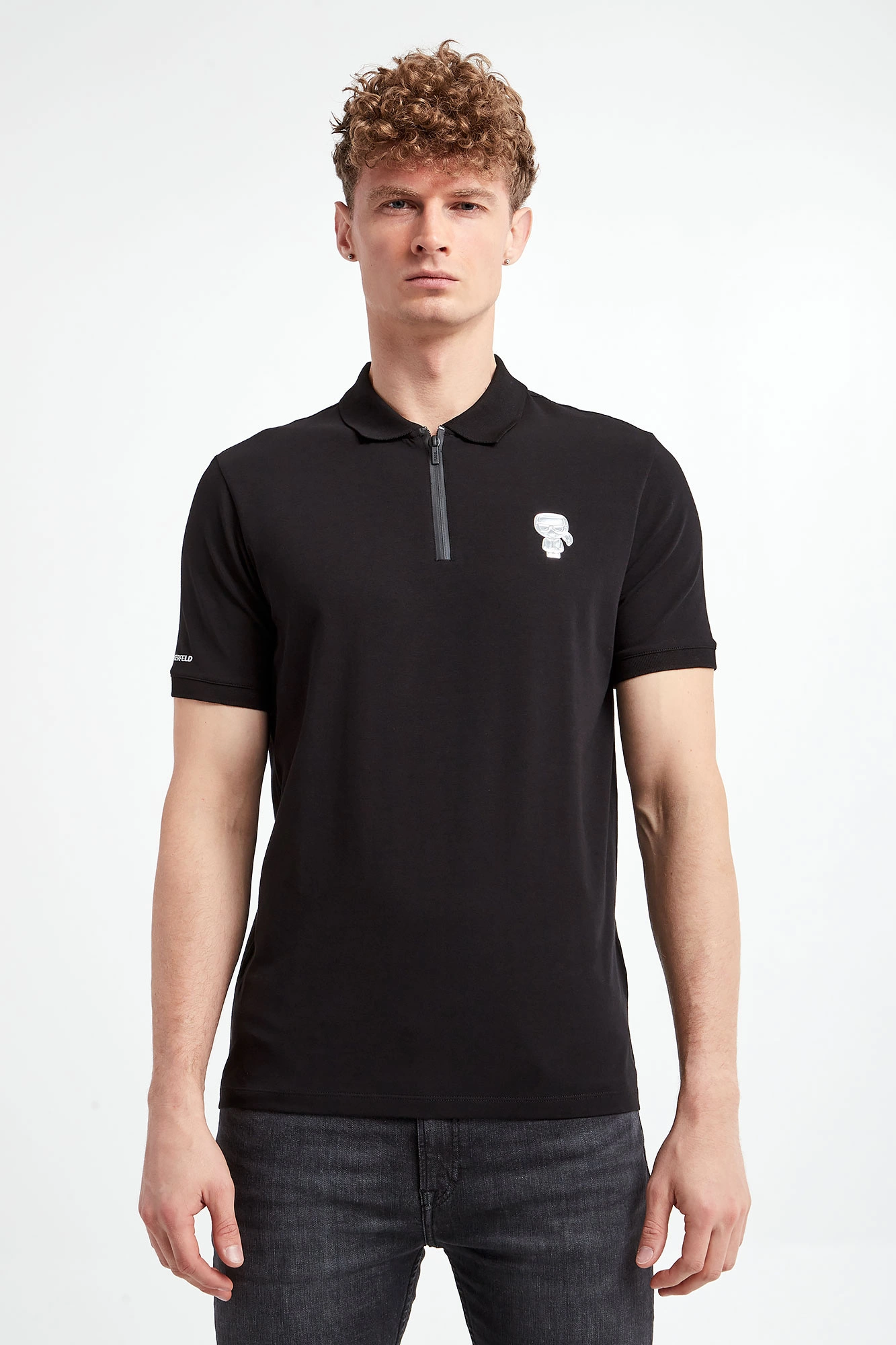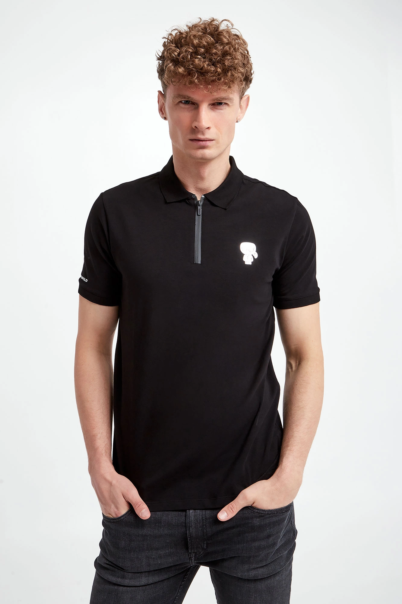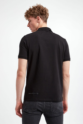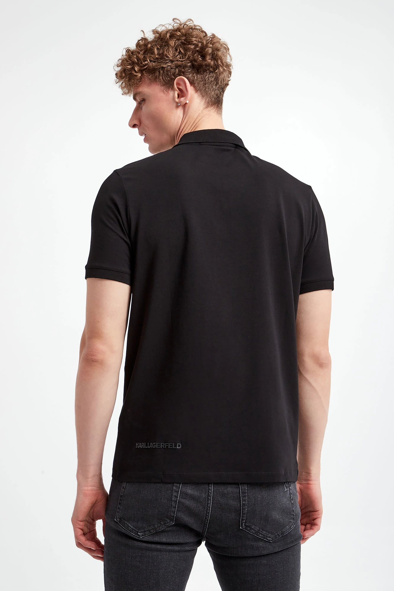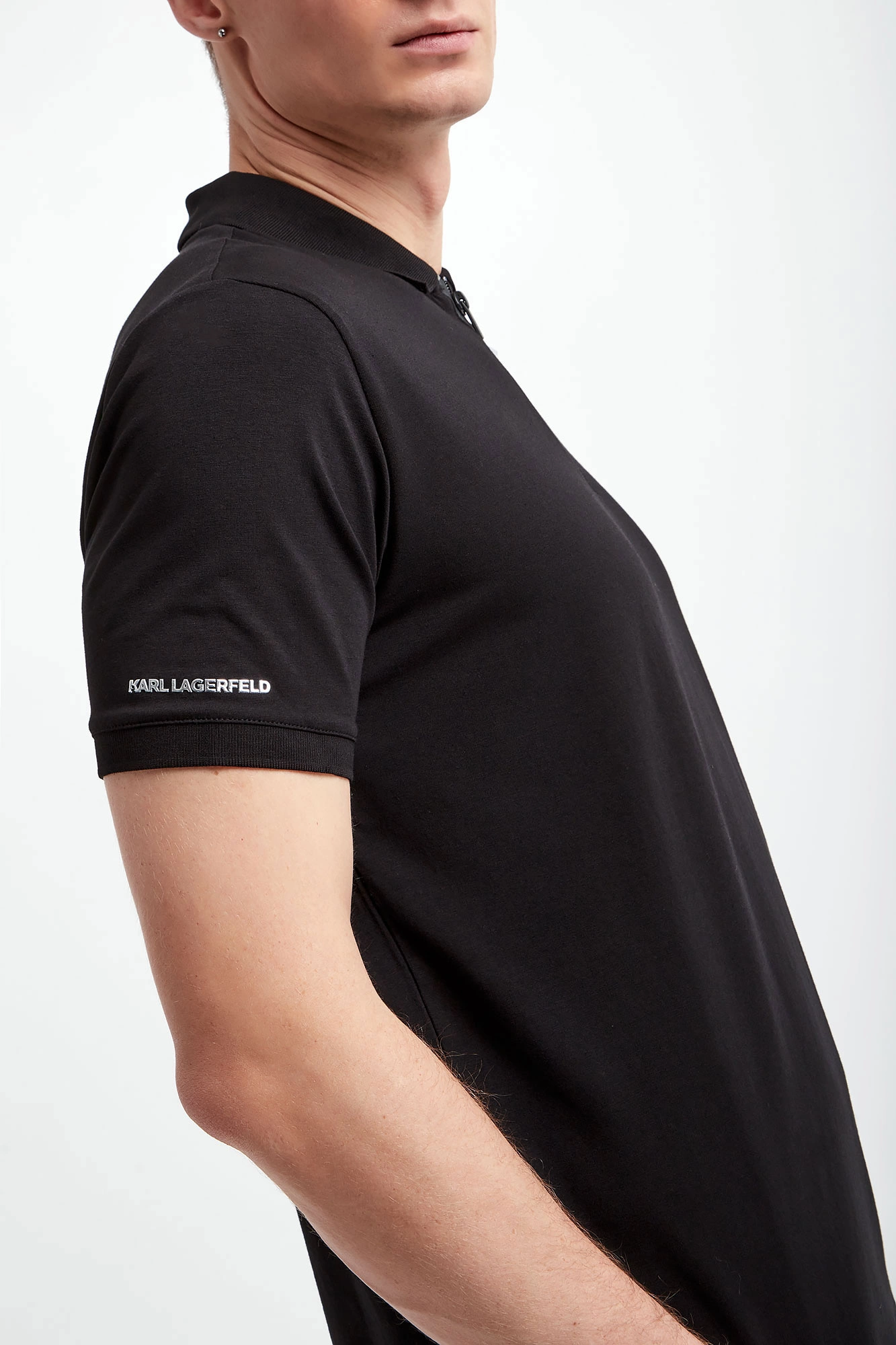 Polo marki Karl Lagerfeld w czarnym kolorze. Model pochodzi z linii "Karl Cares", która wspiera zrównoważoną modę. Fason slim. Na froncie gumowa, srebrna aplikacja z logo marki. Na prawym rękawie nadruk z nazwą marki. Klasyczny kołnierz zapinany za pomocą logowanego zamka. Krótkie rękawy zakończone ściągaczami. Dół wykończony lamówką.