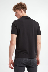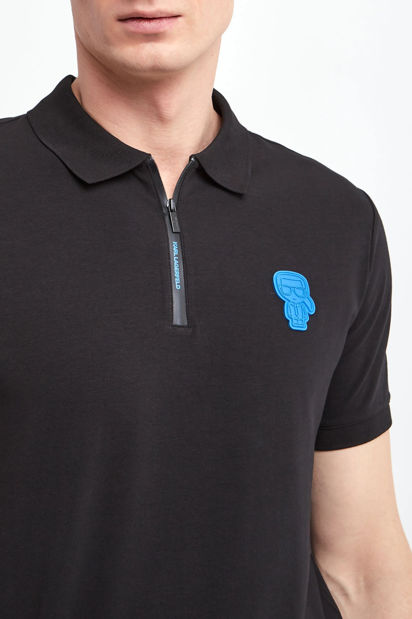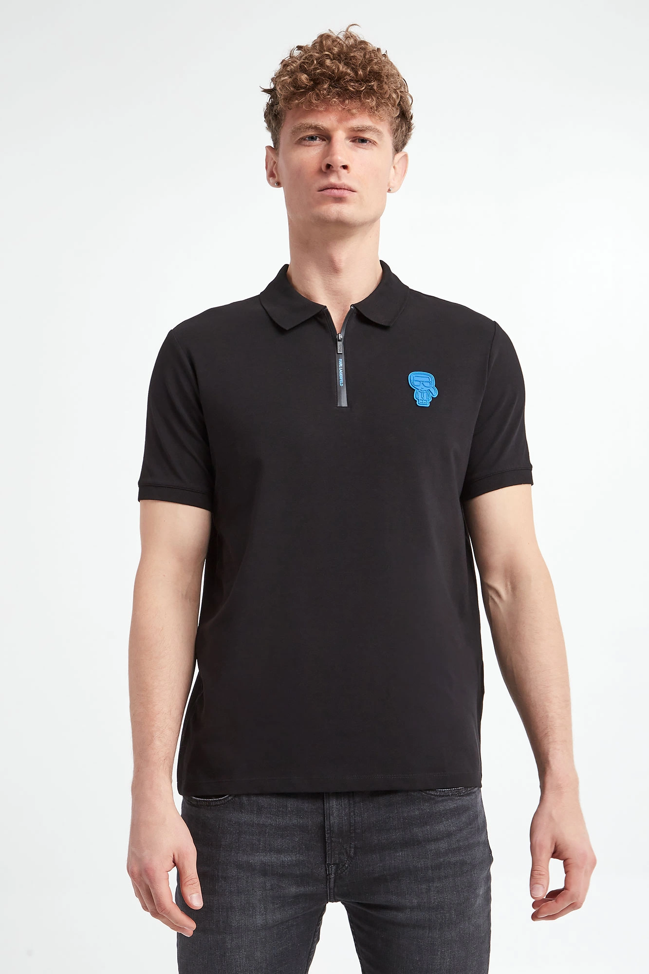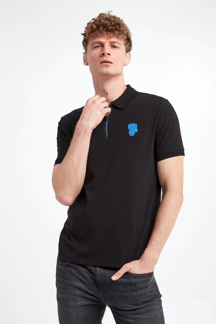 Bawełniane polo marki Karl Lagerfeld w czarnym kolorze. Wykonane z nieco elastycznej bawełny. Model pochodzi z linii "Karl Cares", która wspiera zrównoważoną modę. Fason regular. Z przodu gumowana aplikacja z motywem założyciela marki w niebieskim kolorze. Klasyczny kołnierz zapinany za pomocą logowanego zamka. Krótkie rękawy zakończone ściągaczami. Po bokach niewielkie rozcięcia. Dół wykończony przeszyciem.