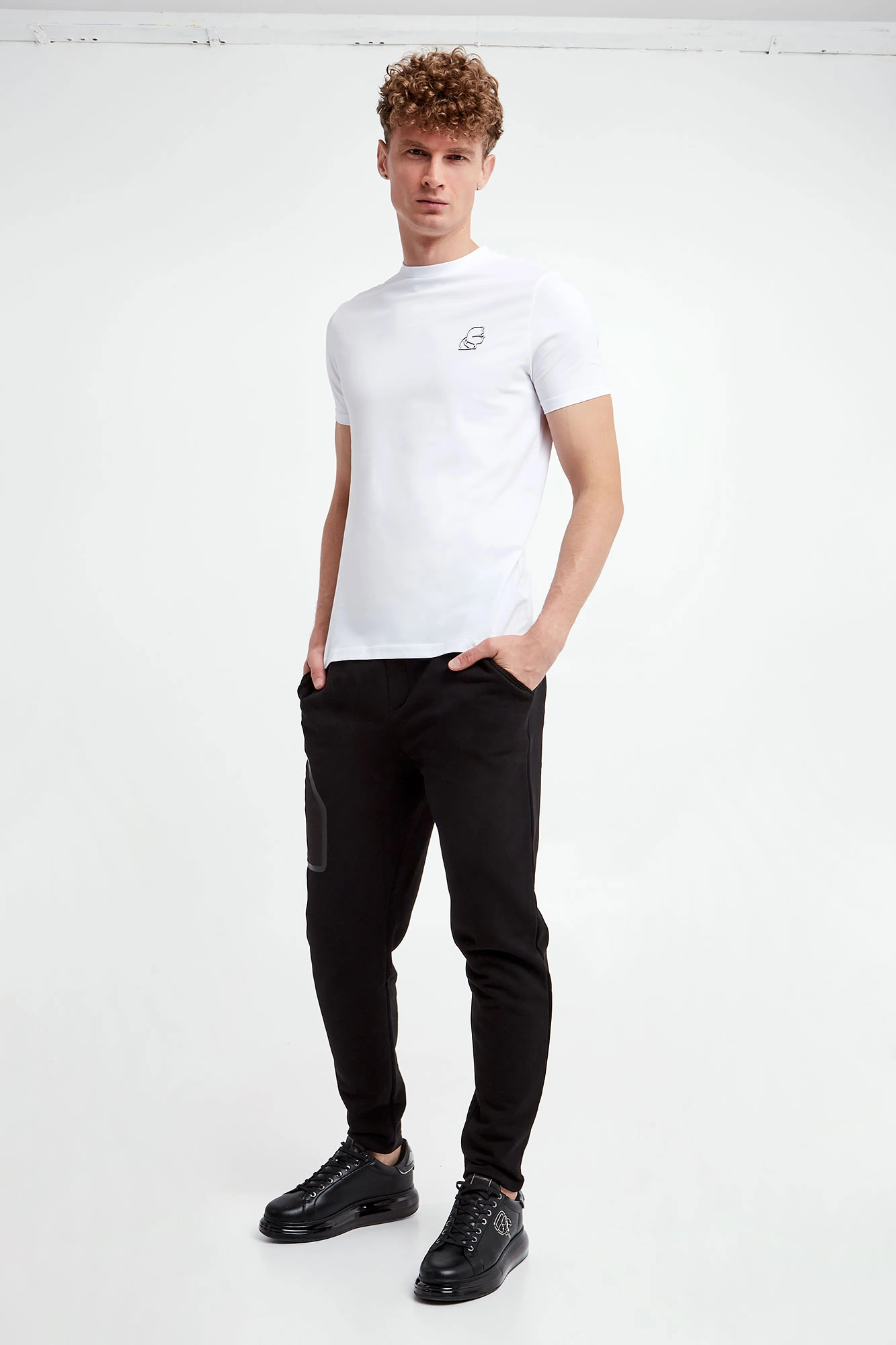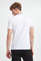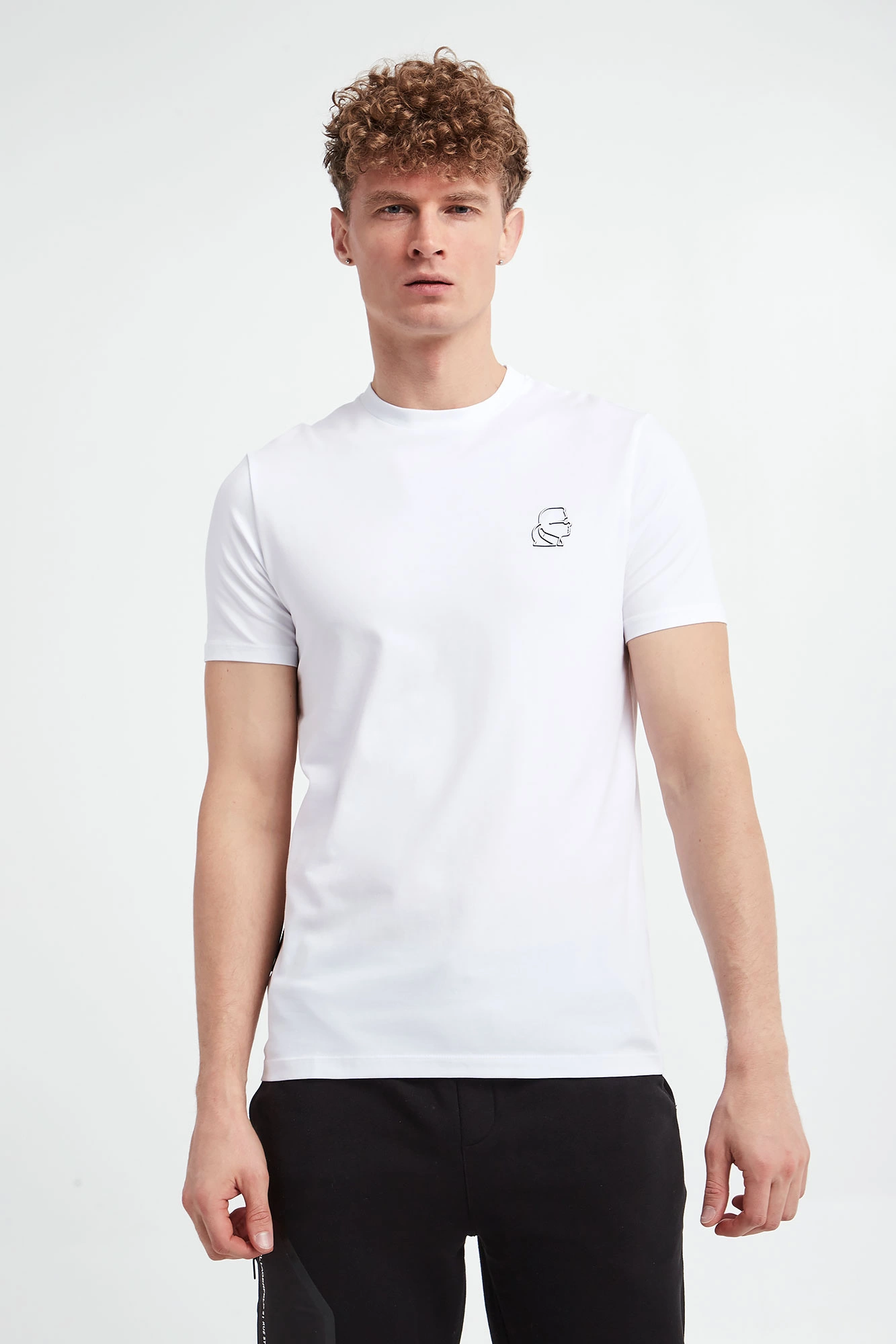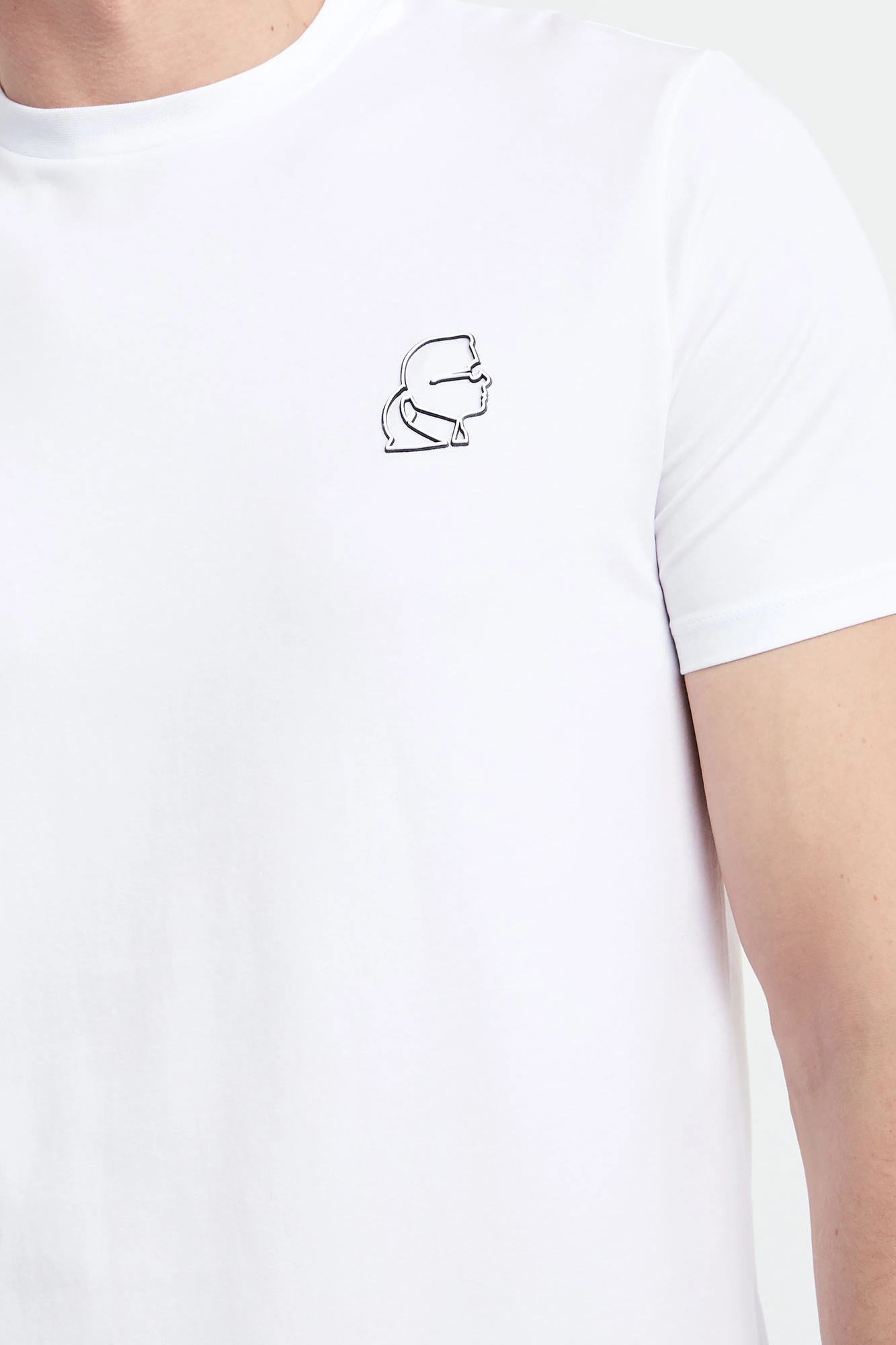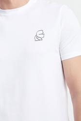 T-shirt marki Karl Lagerfeld w białym kolorze. Z przodu gumowa aplikacja z bocznym wizerunkiem założyciela marki. Z tyłu na linii karku nadruk w postaci nazwy marki. Dekolt wykończony gładkim ściągaczem. Krótkie rękawki i dół wykończone lamówką. Model z linii "Karl Cares", która wspiera zrównoważoną modę. Fason slim. Wykonany z tkaniny bawełnianej z domieszką elastanu.